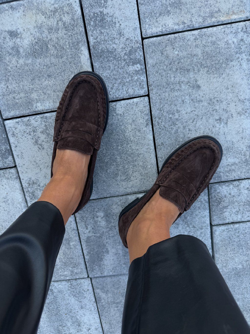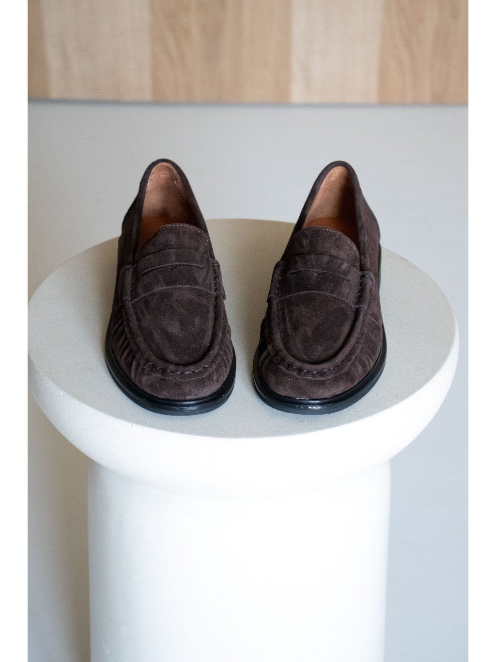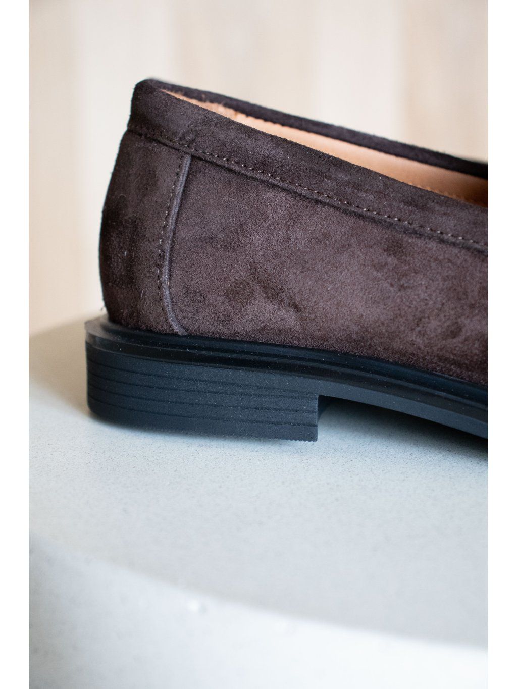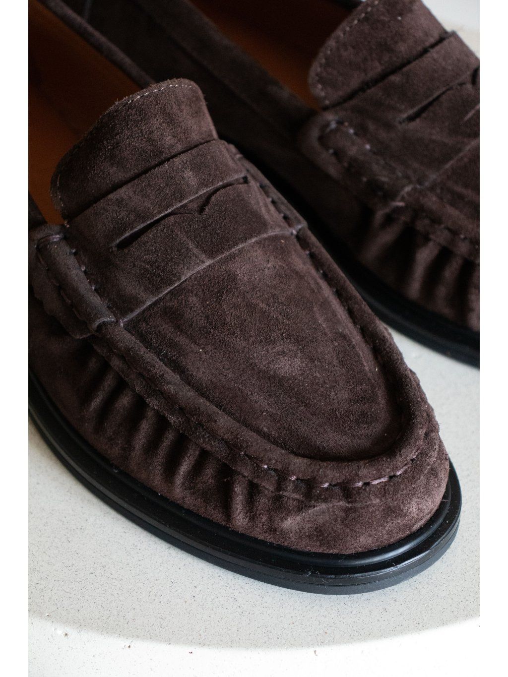 Jemné semišové mokasíny, bez zapínání, minimalistický design, jemný detail přes nárt, pevná podrážka