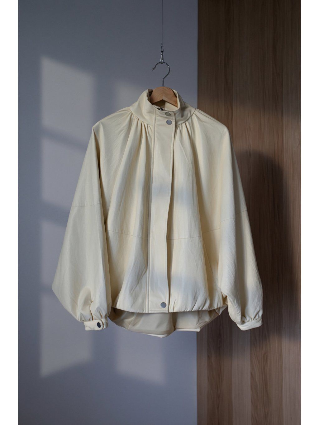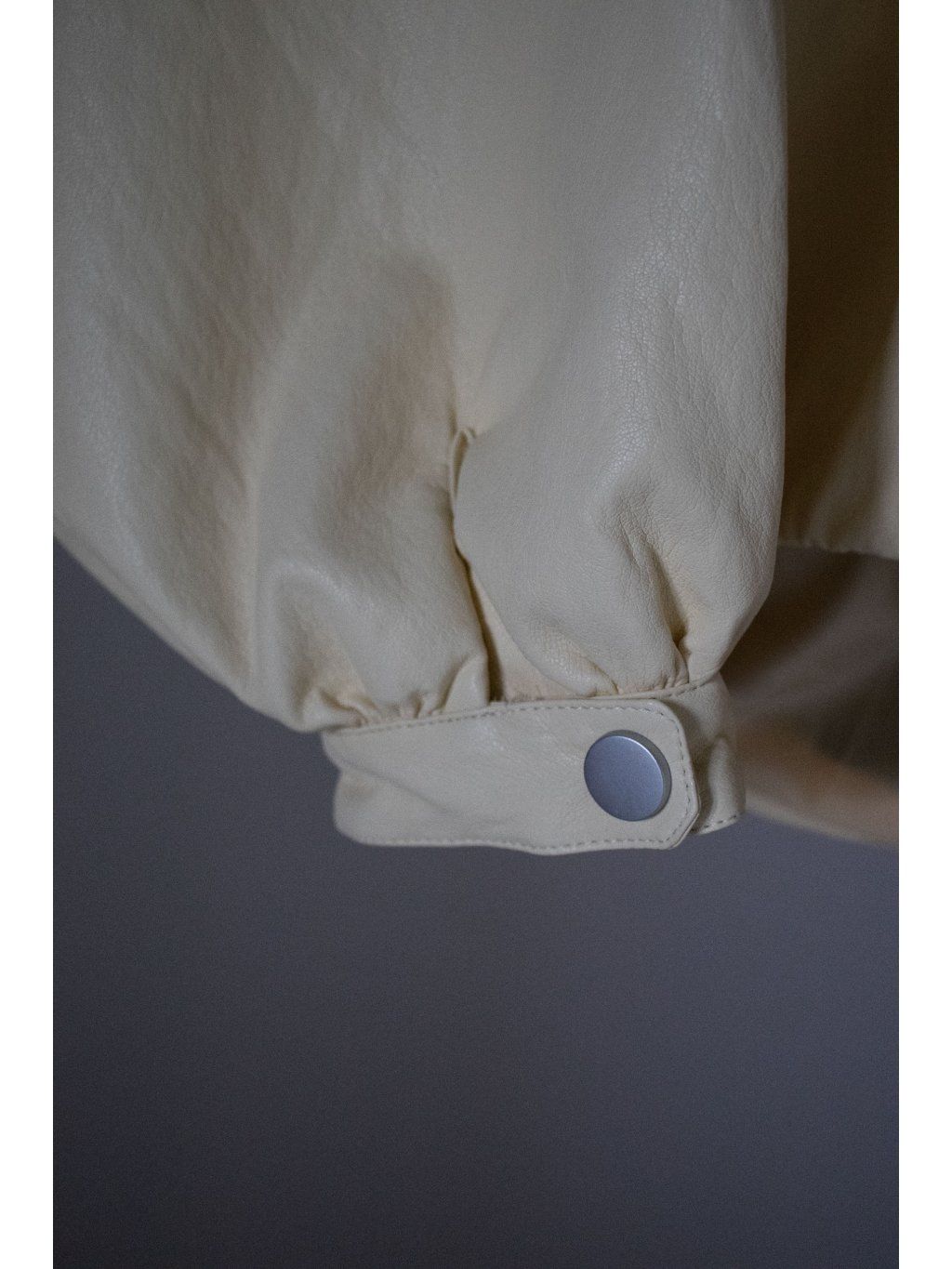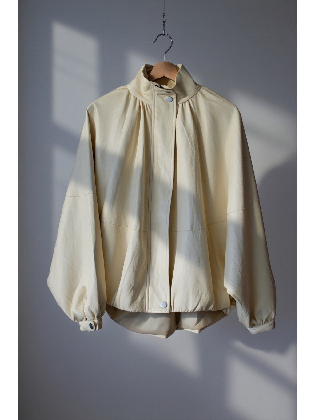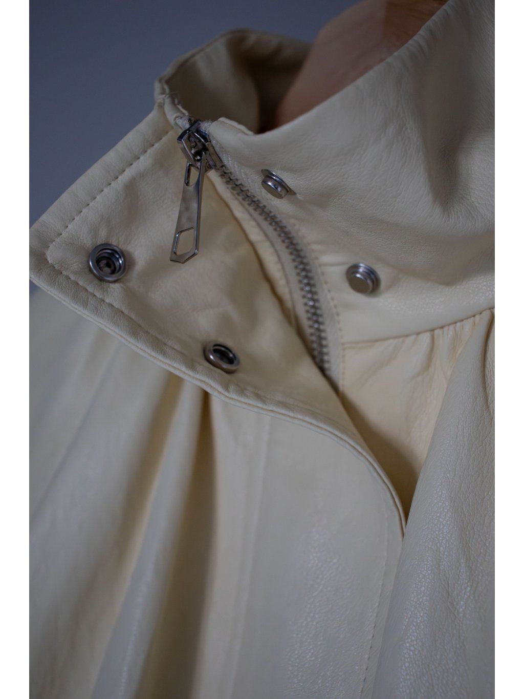 Koženková bunda, volný netopýří střih, délka pod pas, zapínání na zip ve stříbrné barvě a klopu se cvoky, límeček do stojáčku. Boční kapsy, podšívka, dlouhé rukávy ukončené úzkou manžetou se cvočkem, spodní přední lem, oblast krku i rukávy jsou mírně nařasené. Zadní díl bundy je delší. Materiál je měkký, příjemný na dotek.