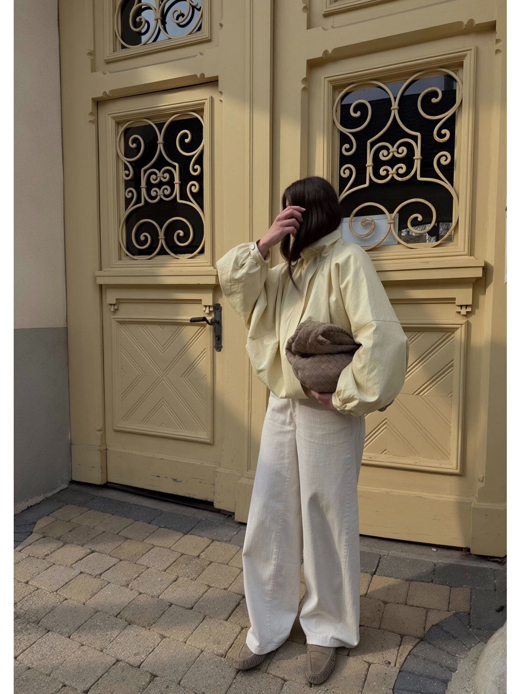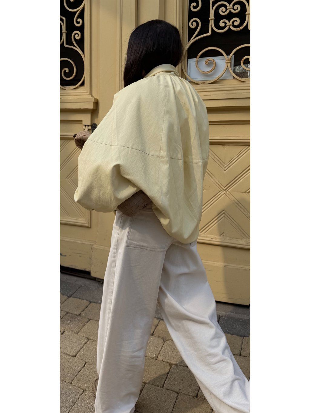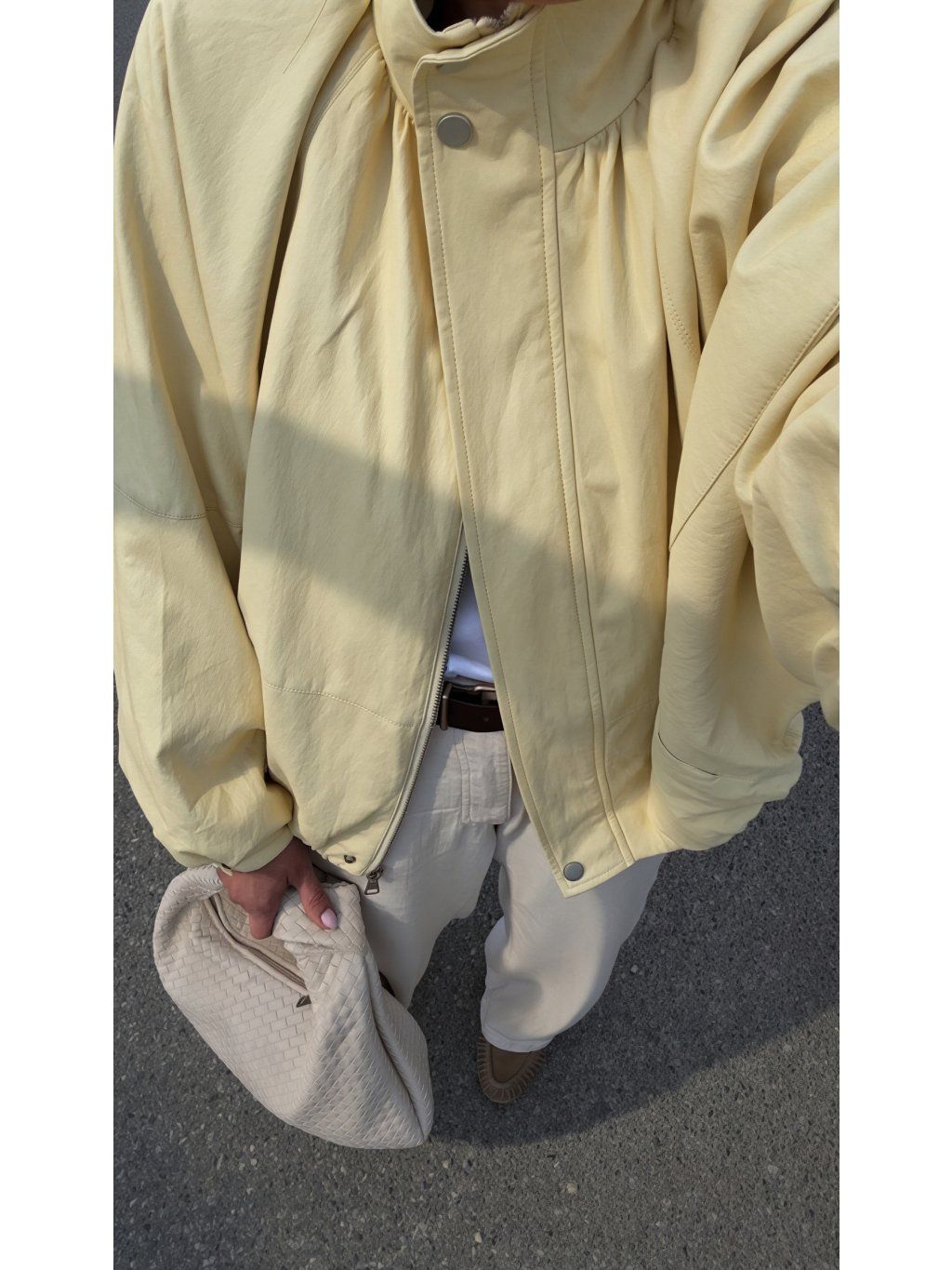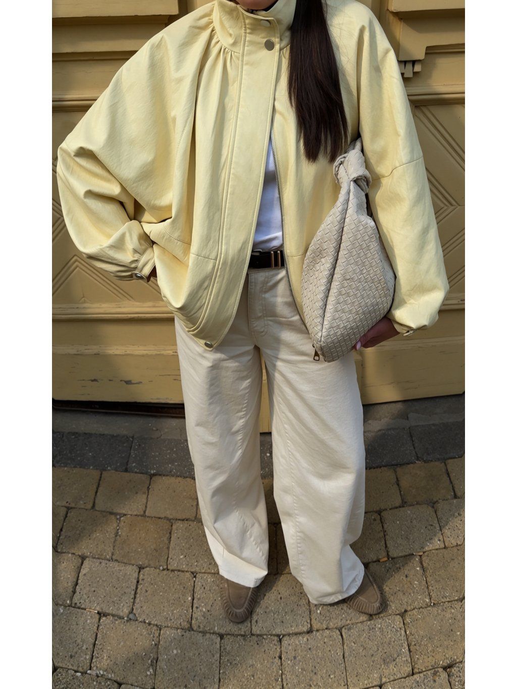 Koženková bunda, volný netopýří střih, délka pod pas, zapínání na zip ve stříbrné barvě a klopu se cvoky, límeček do stojáčku. Boční kapsy, podšívka, dlouhé rukávy ukončené úzkou manžetou se cvočkem, spodní přední lem, oblast krku i rukávy jsou mírně nařasené. Zadní díl bundy je delší. Materiál je měkký, příjemný na dotek.