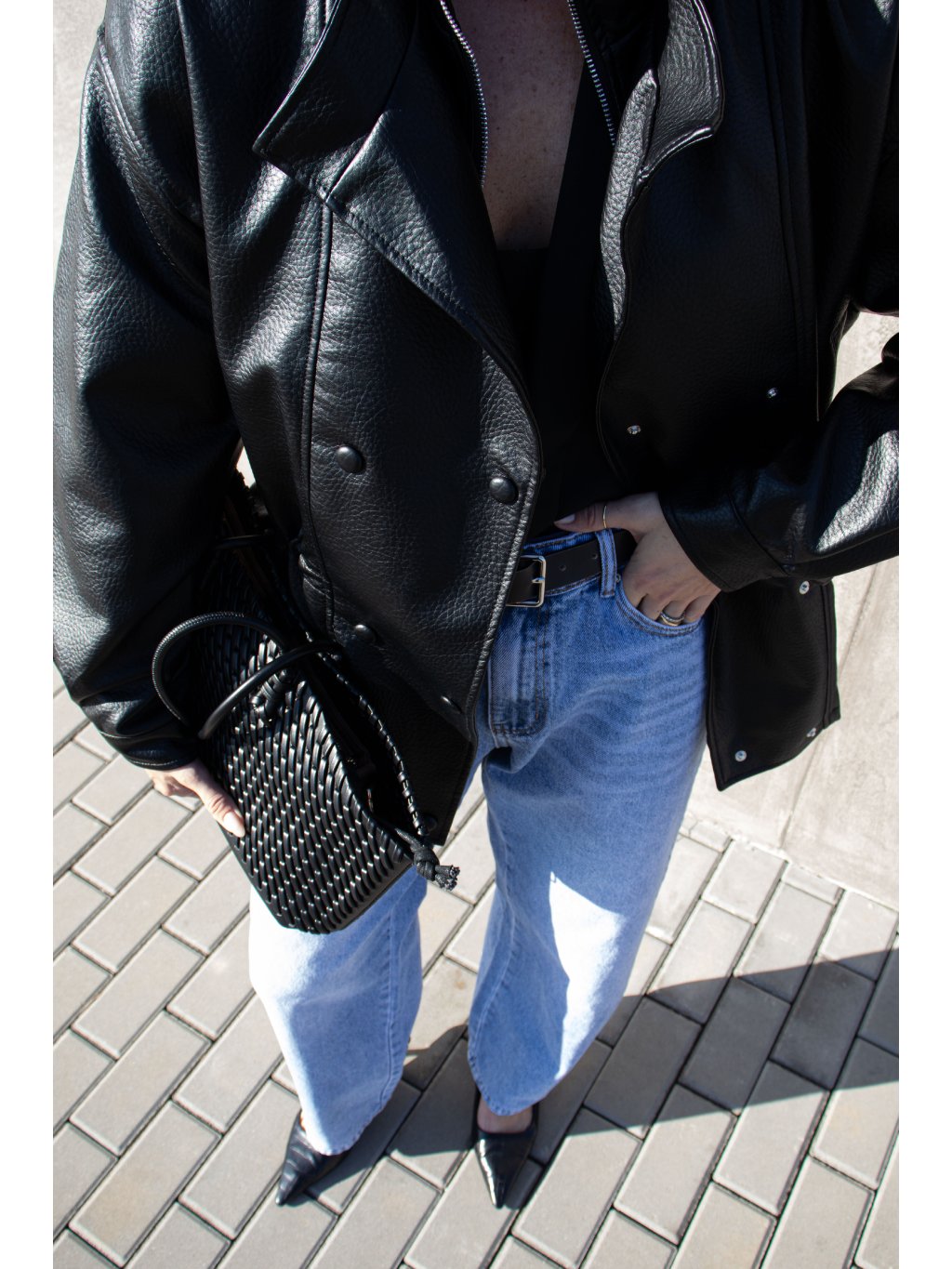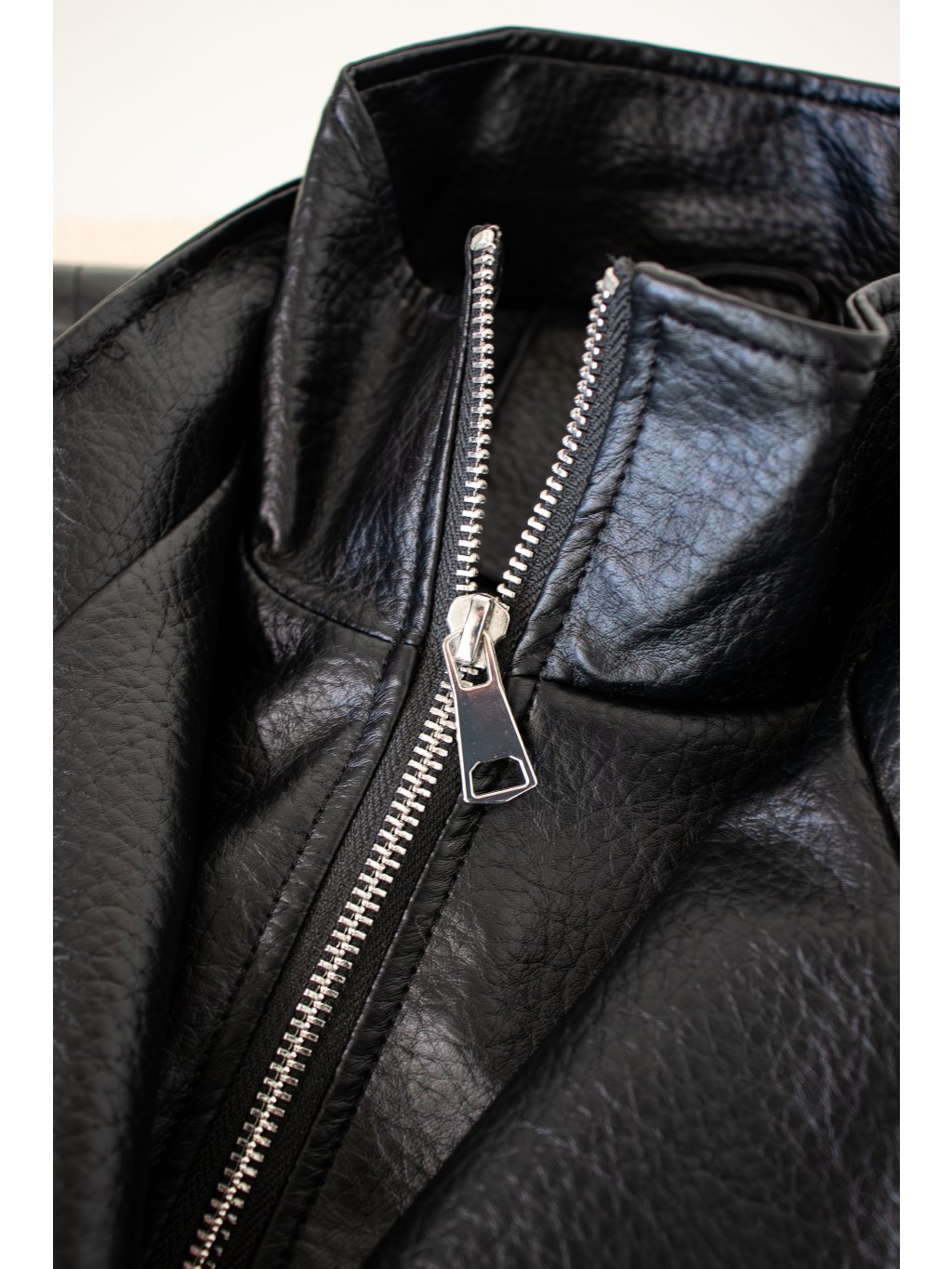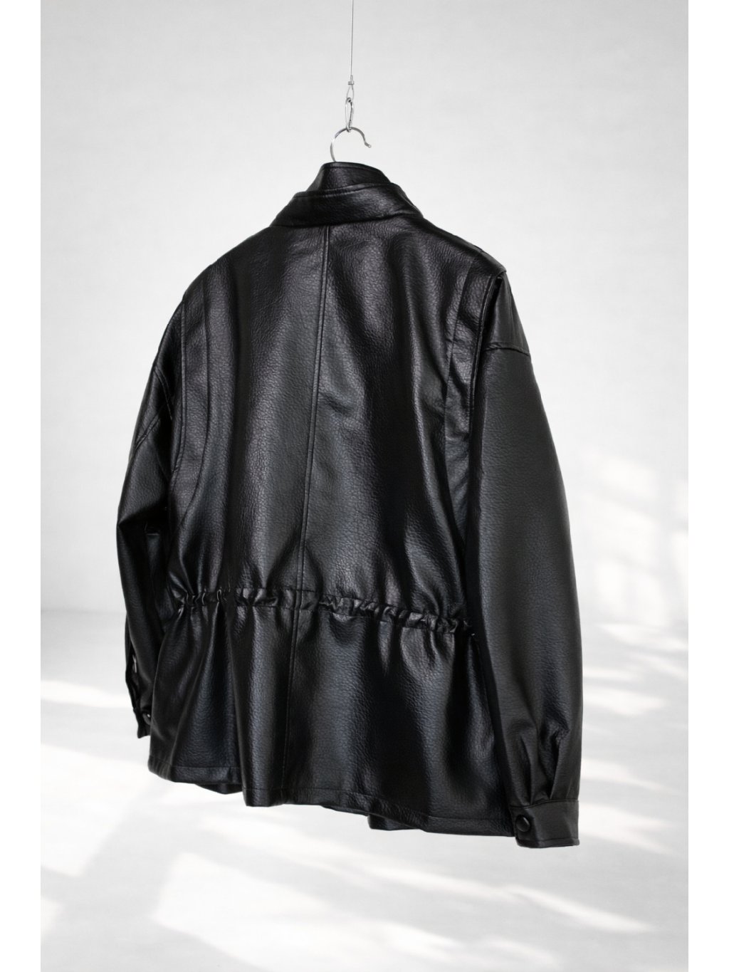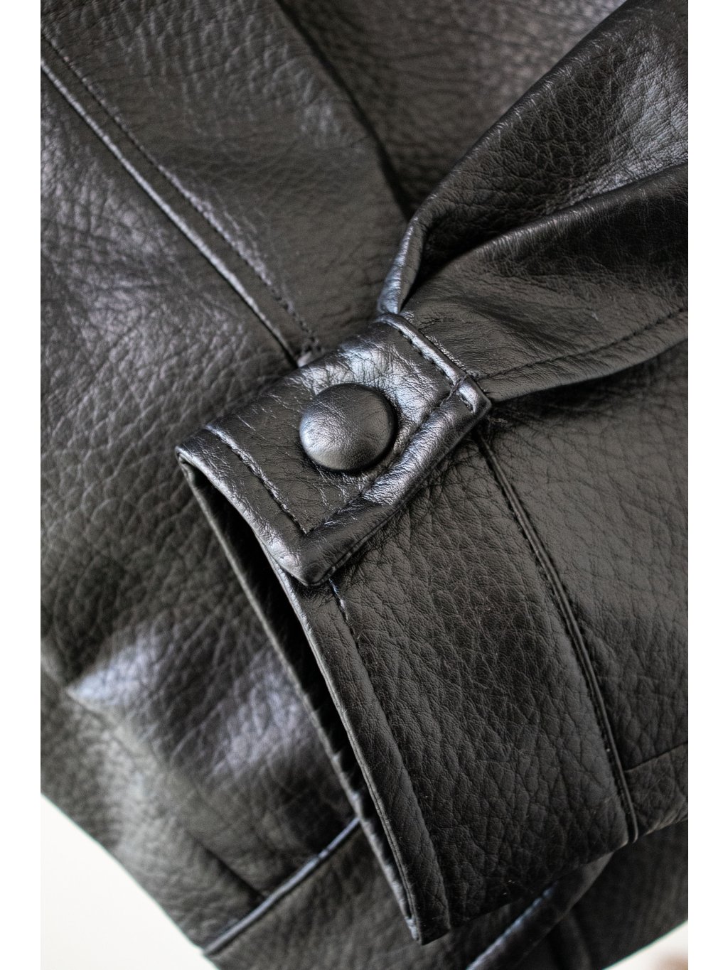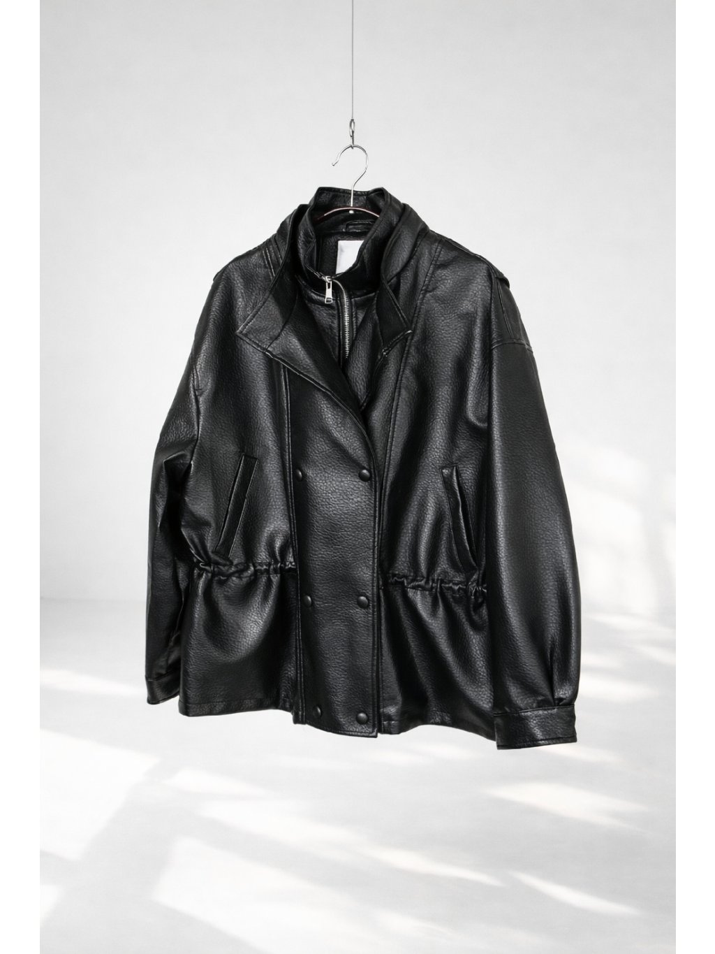 Koženková bunda-parka, volnější střih, prodloužená délka - do půli stehen, klopy s dvouřadým zapínáním na cvoky - vnější strana cvoků je v barvě bundy, dále zapínání na zip ve stříbrné barvě, podšívka, dvojitý límec, rukávy ukončené manžetou se cvočkem, boční kapsy. Vzadu od ramen vede detail v podobě úzké klopy/záhybu. Bunda se dá v pase stáhnout gumičkami s brzdičkou.