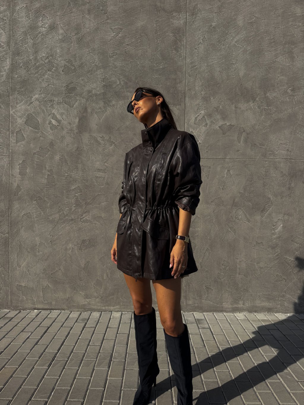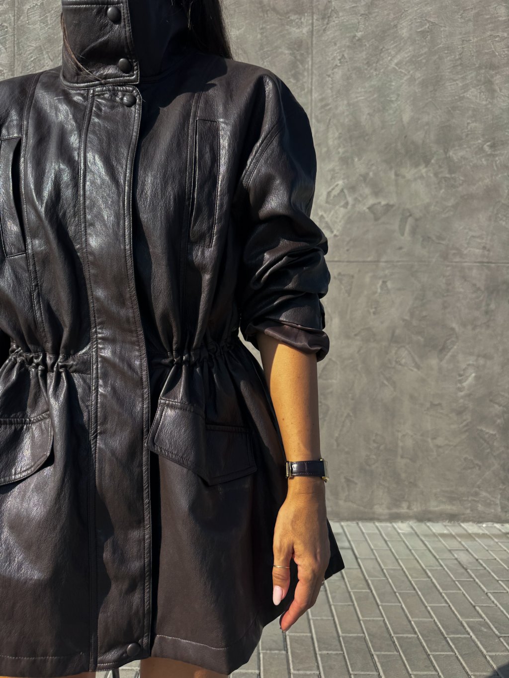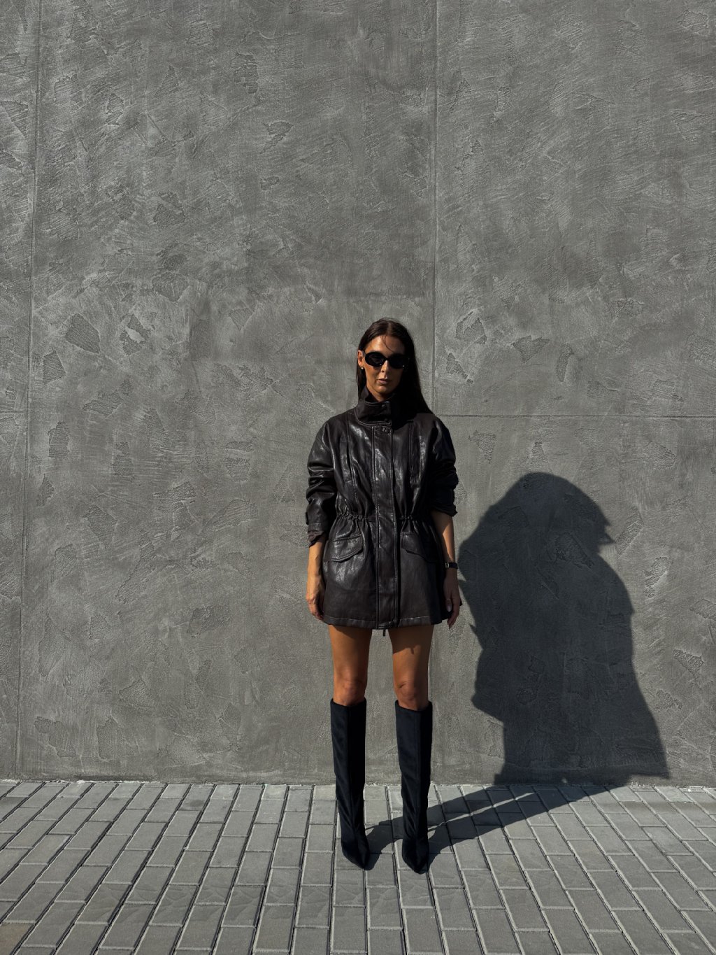 Koženková bunda-parka, volnější střih, prodloužená délka, vpředu kapsy s klopami. Límec do stojáčku, zapínání na zip a kovové cvoky ve stříbrné barvě, podšívka.