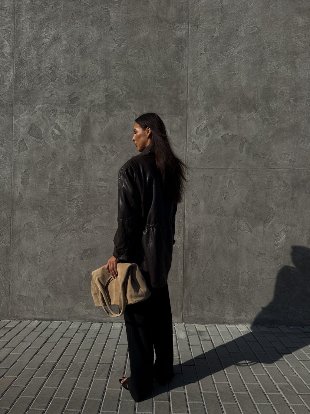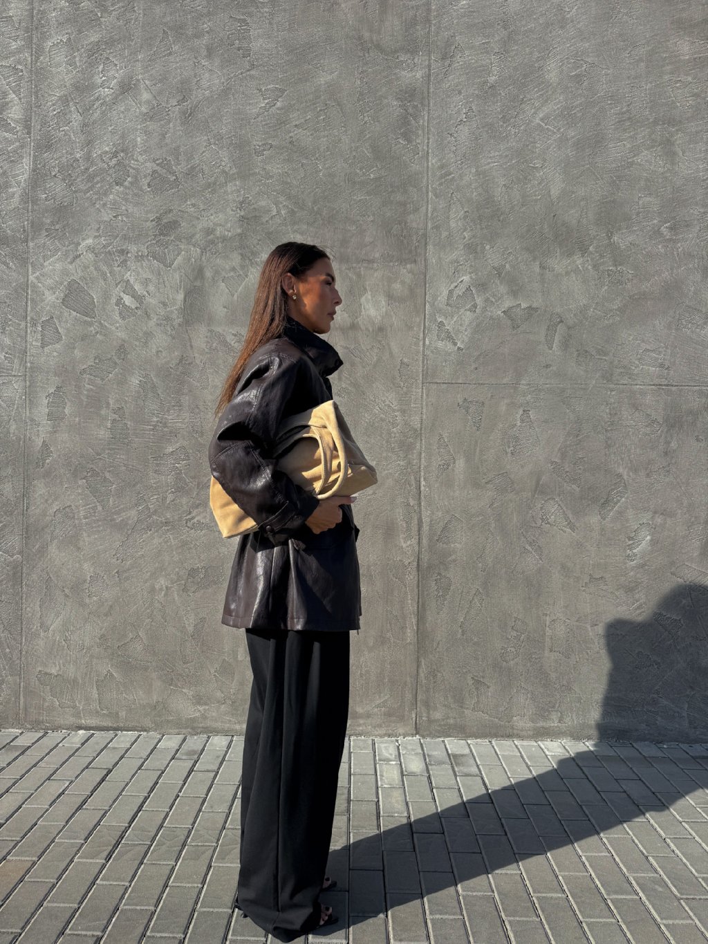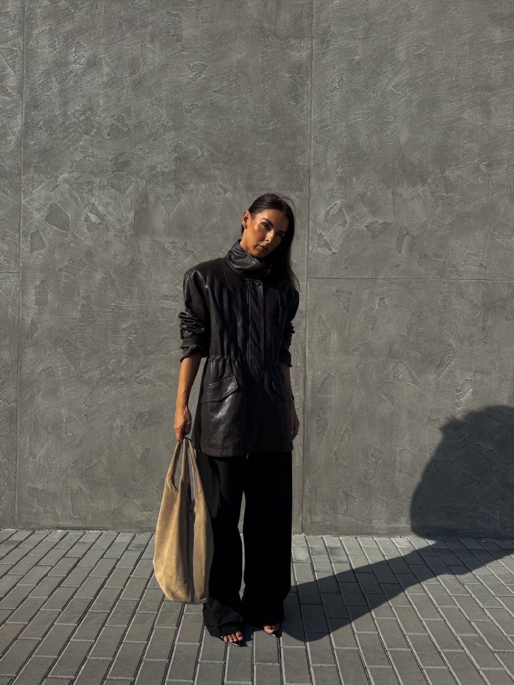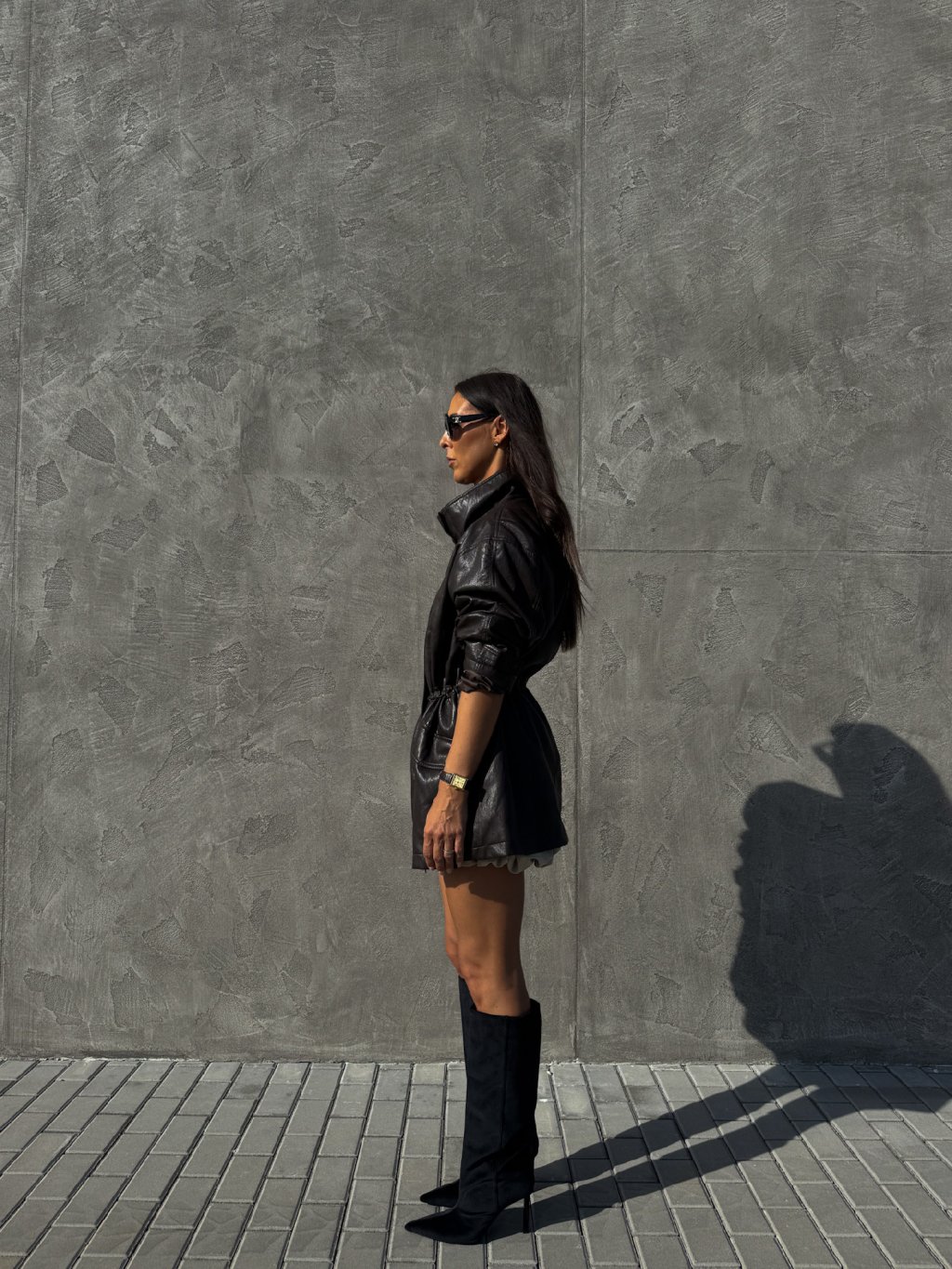 Koženková bunda-parka, volnější střih, prodloužená délka, vpředu kapsy s klopami. Límec do stojáčku, zapínání na zip a kovové cvoky ve stříbrné barvě, podšívka.