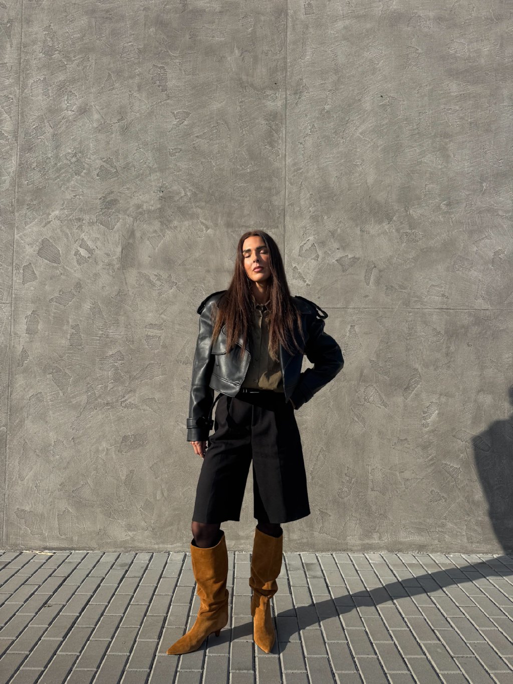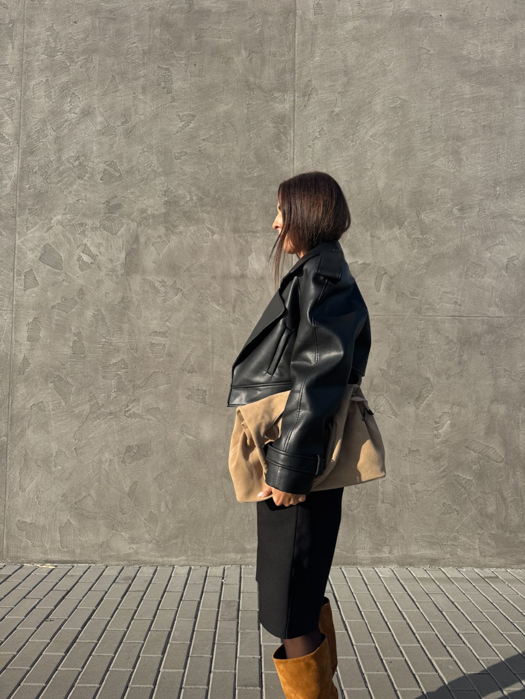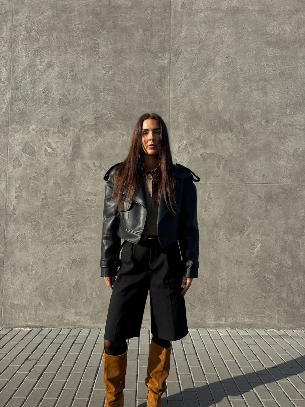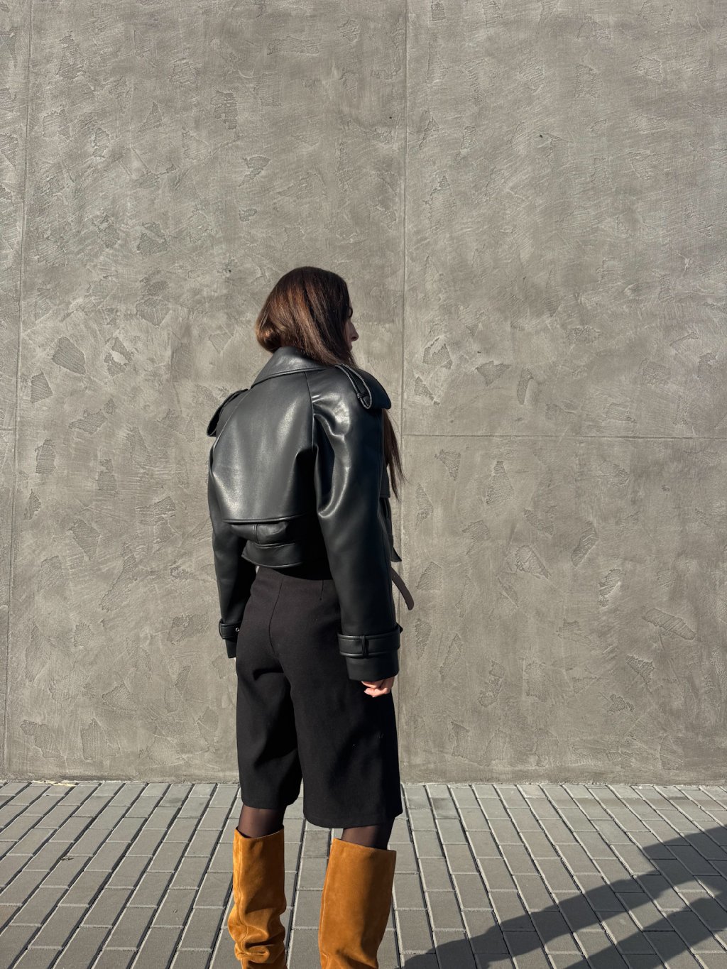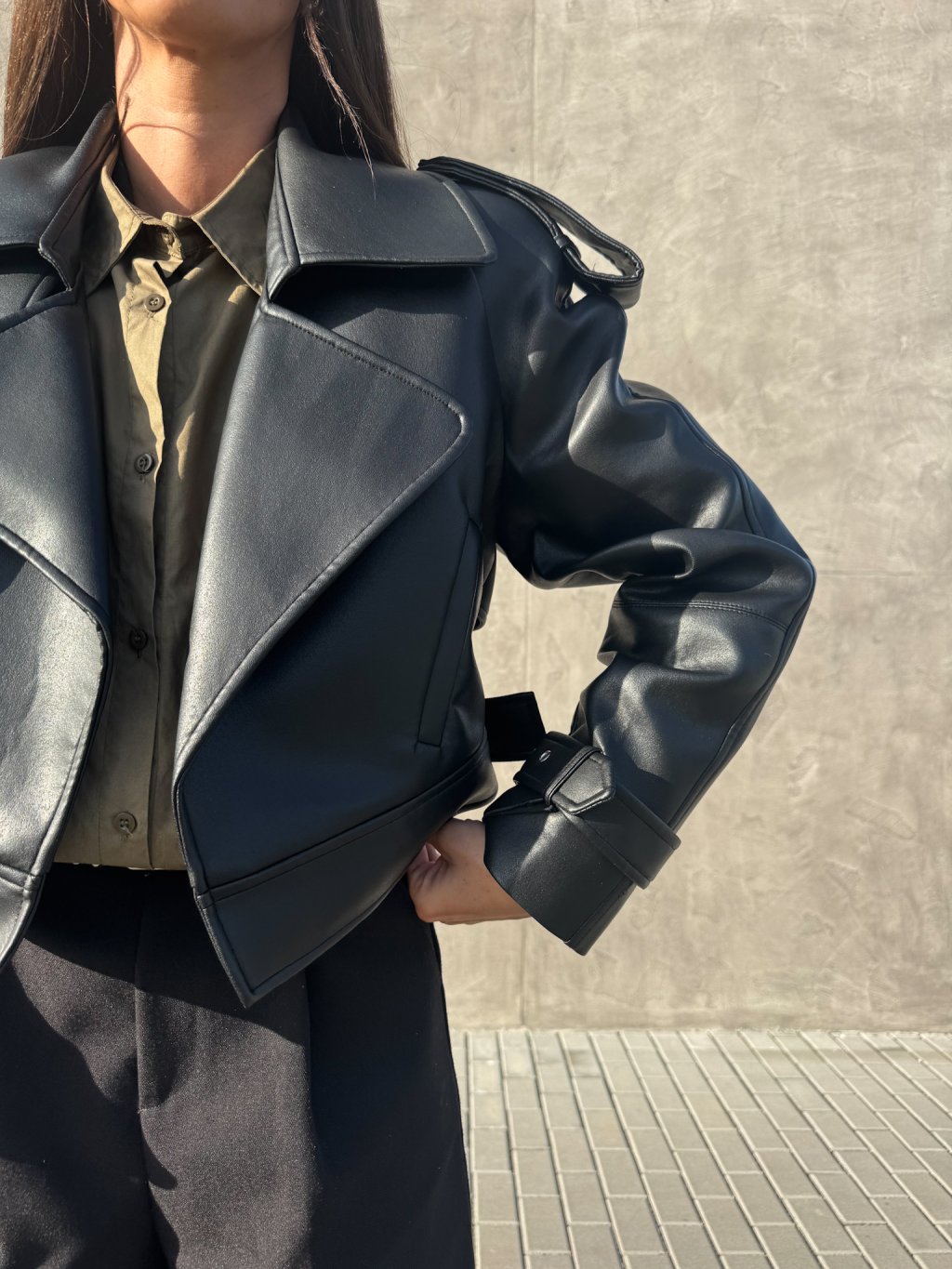 Koženkový křivák - pevná silná koženka, podšívka, výrazný límec, výrazné ramenní vycpávky s výložkami, na rukávech pásek na stažení.