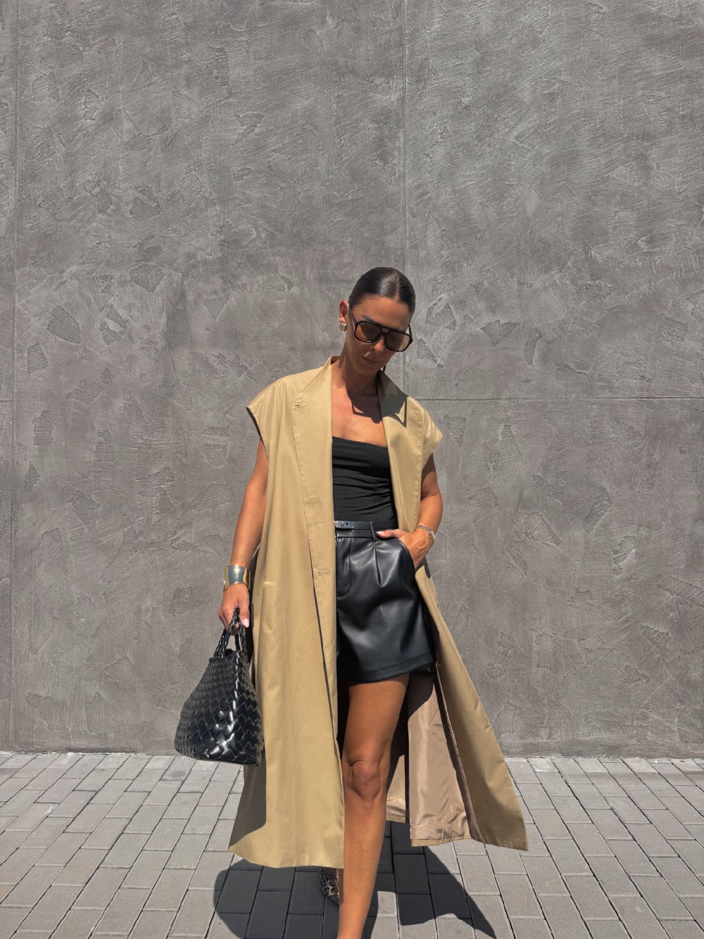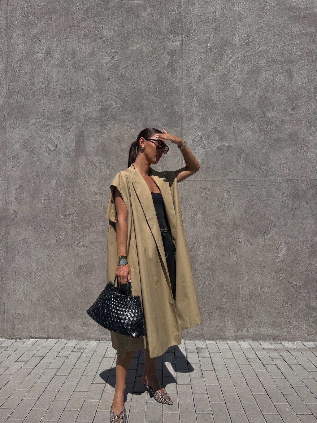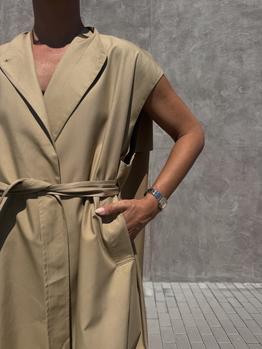 Trench coat vesta, široký oversized střih, midi délka, zapínání na dva knoflíky, boční kapsy, podšívka, opasek ze stejného materiálu,