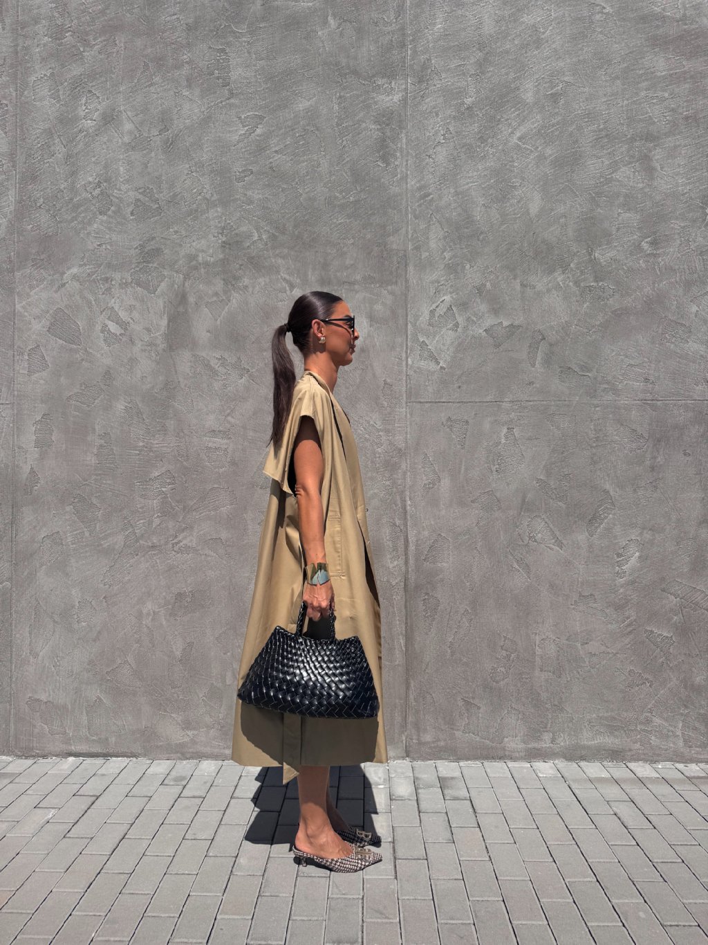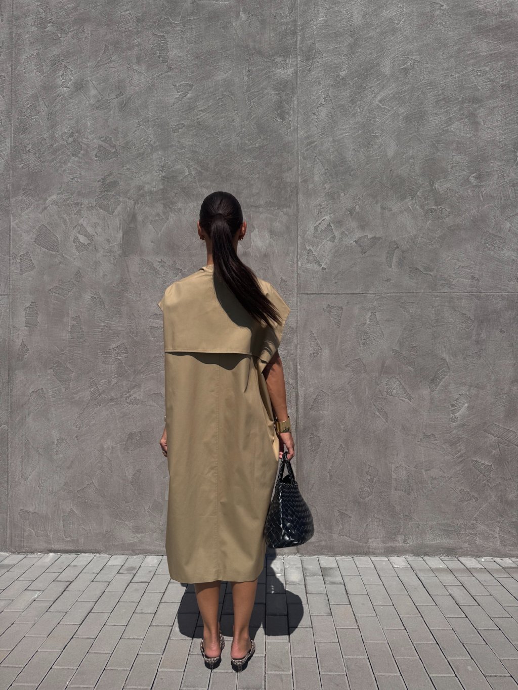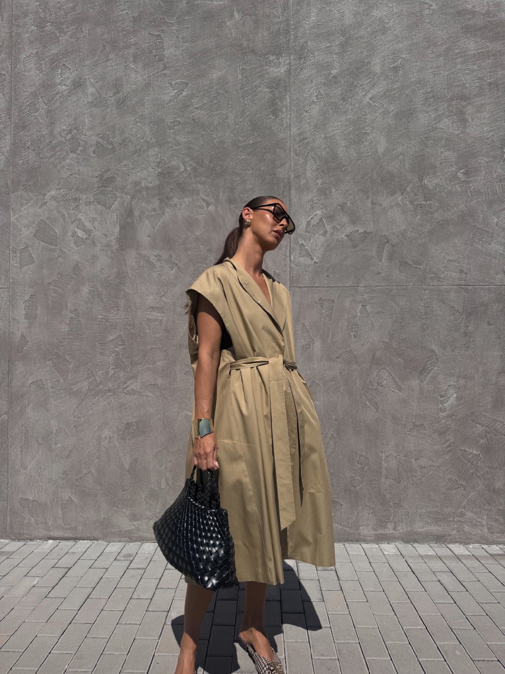 Trench coat vesta, široký oversized střih, midi délka, zapínání na dva knoflíky, boční kapsy, podšívka, opasek ze stejného materiálu,