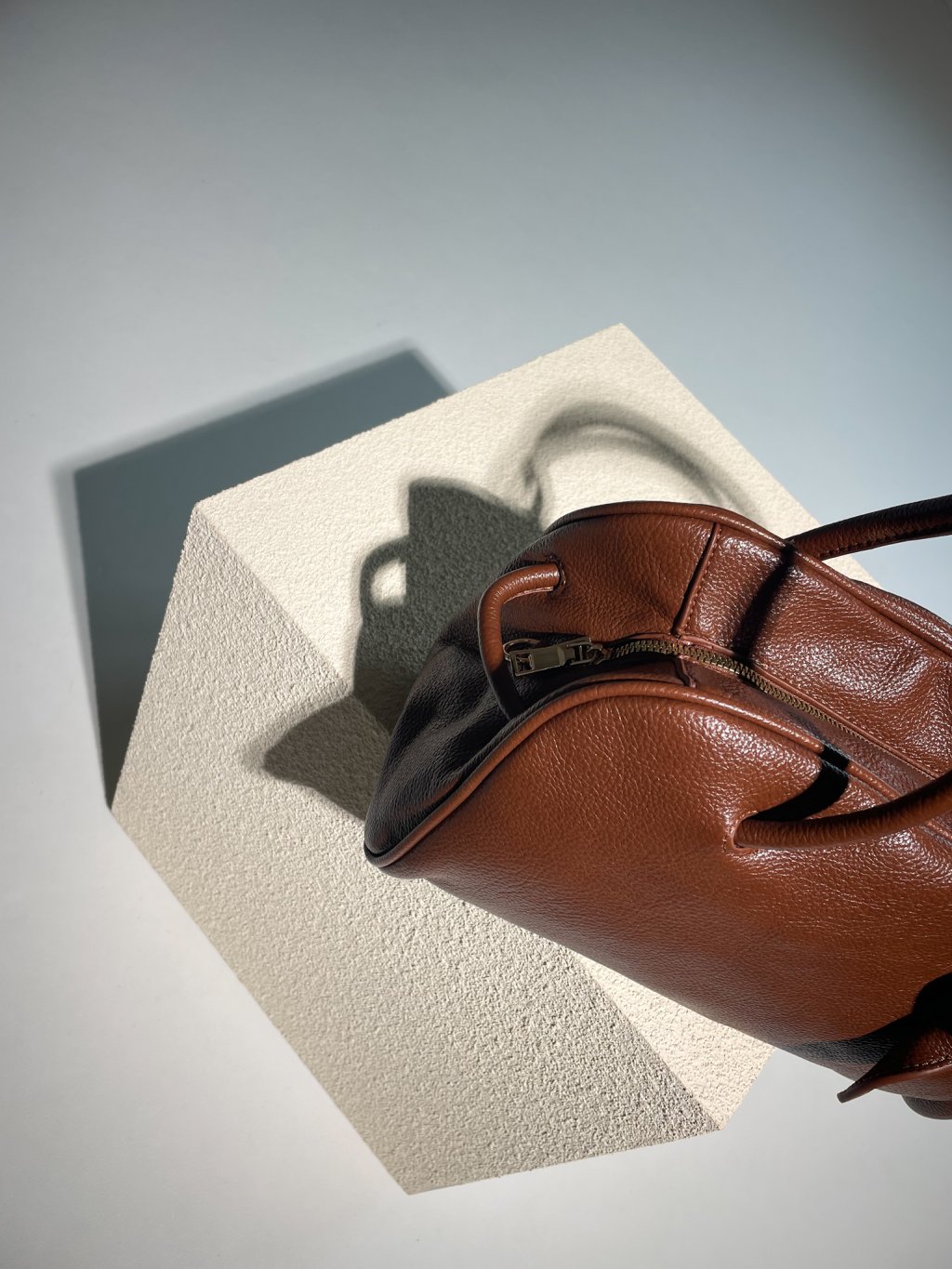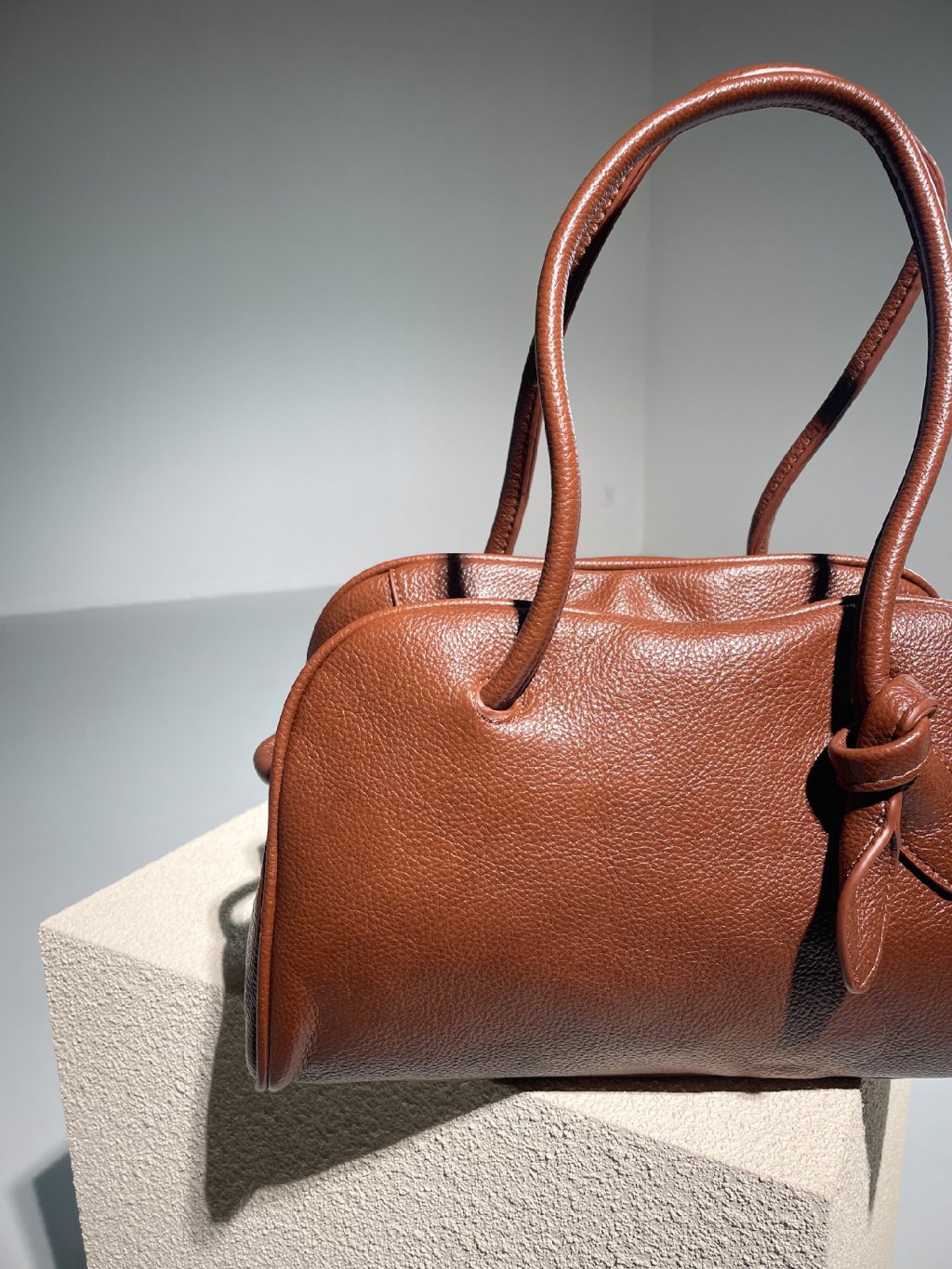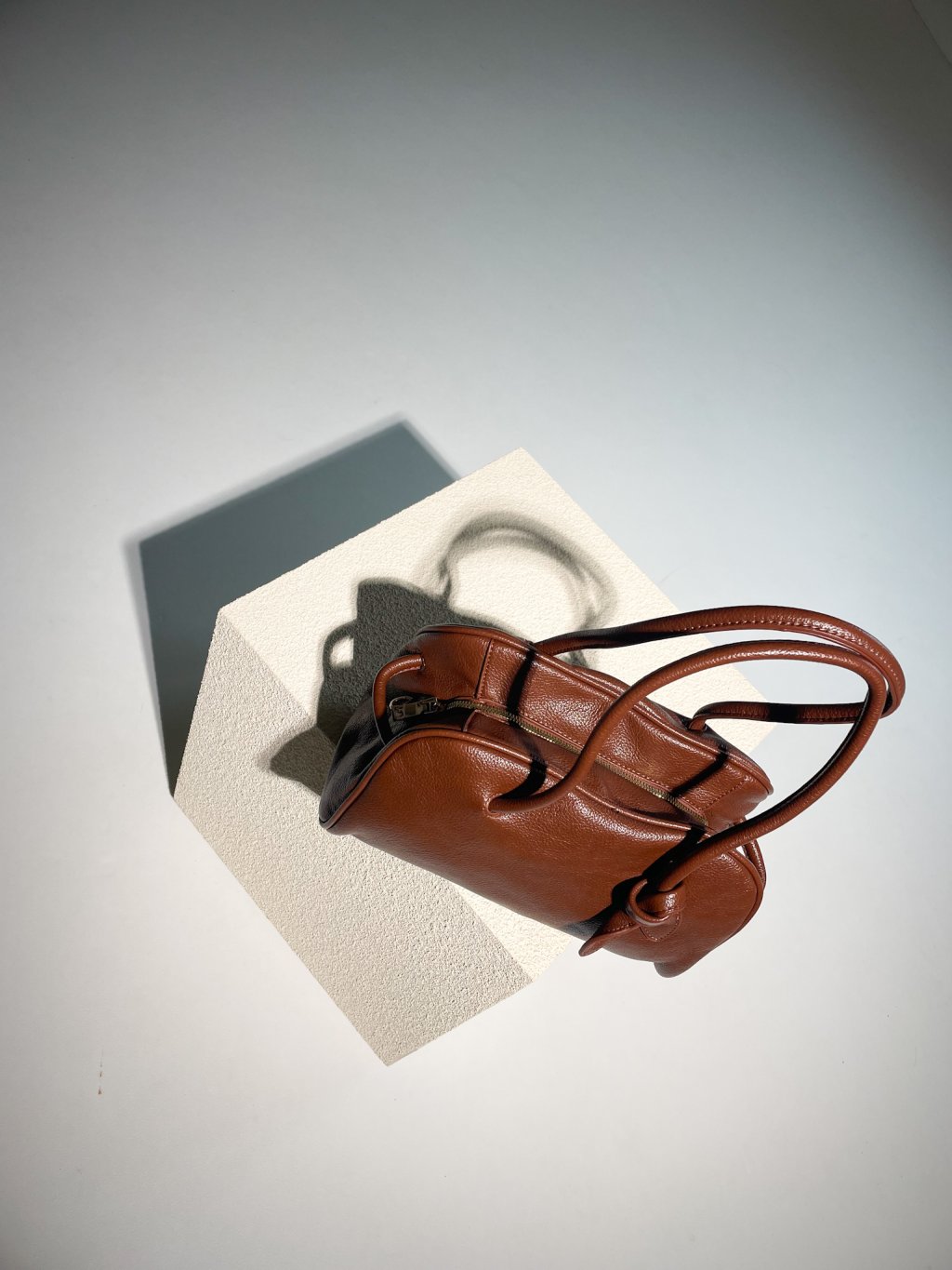 Bowling bag. Delší ucha - s detailem uzlu na jednom z nich, zapínání na zip ve zlaté barvě, uvnitř dvě otevřené kapsičky. Součástí je odnímatelný