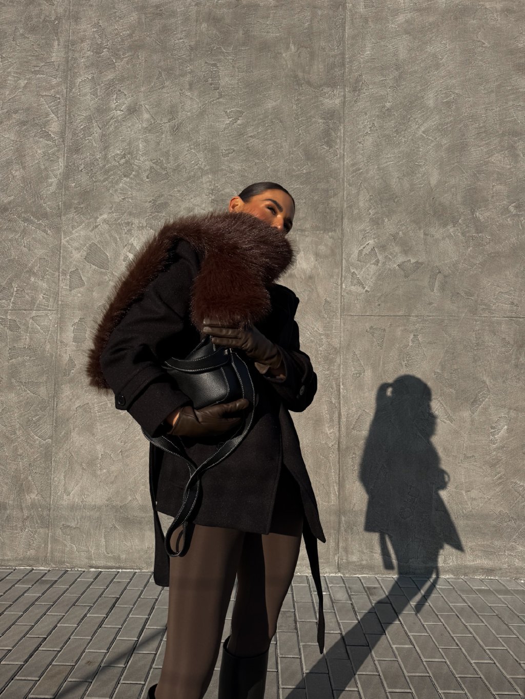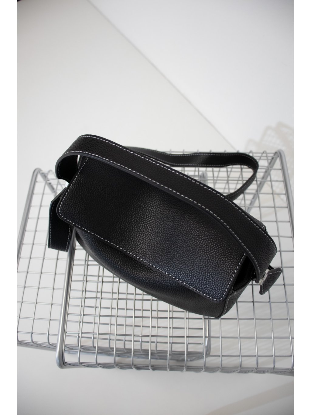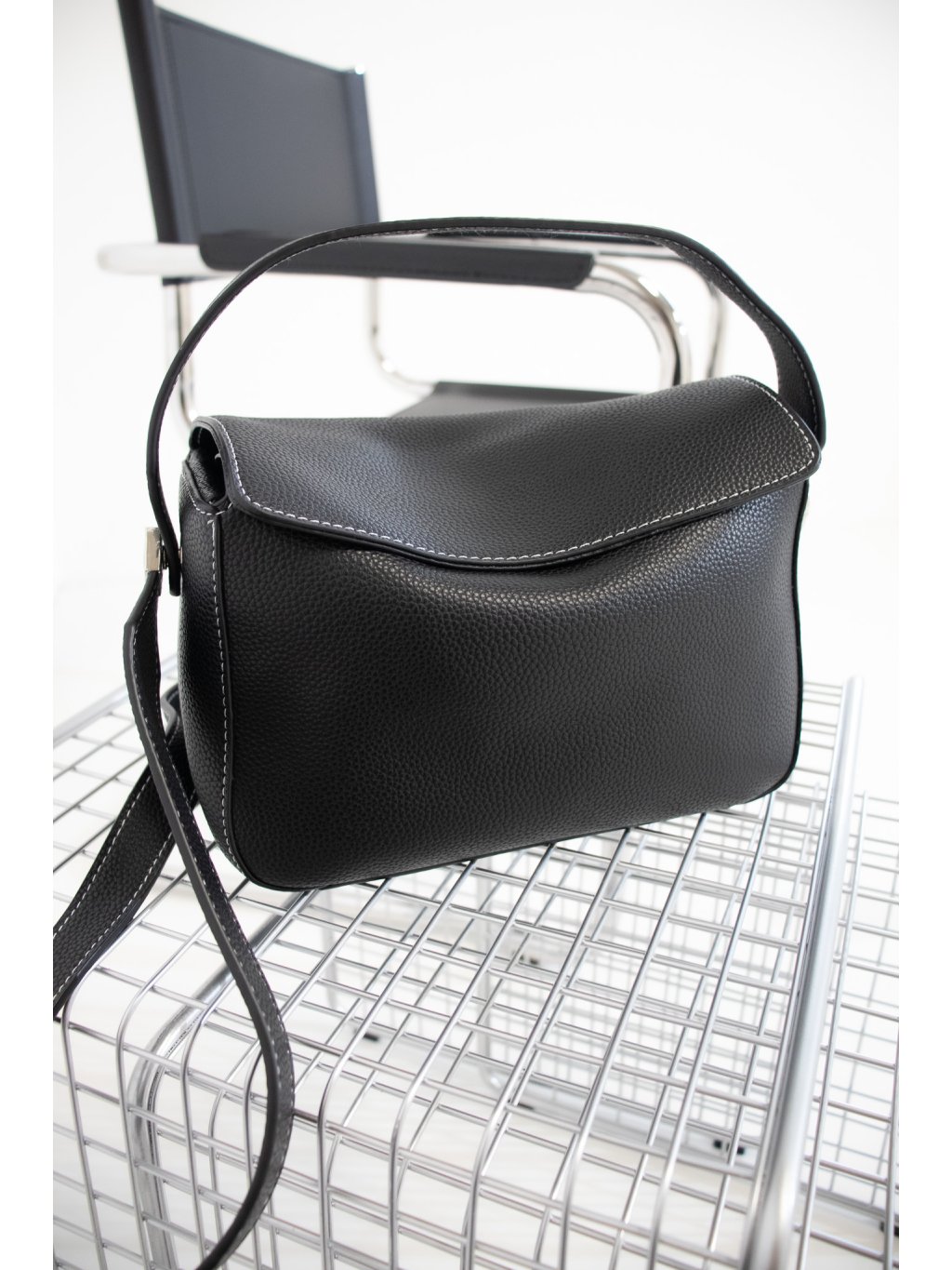 Hranatá koženková kabelka menší velikosti, zapínání na magnet, jedno krátké ucho, dlouhé ucho přes rameno, zpevněné dno. Uvnitř jedna otevřená kapsička, dále kapsička na kreditní karty, kapsička na psací potřeby či rtěnky. Kovové detaily jsou ve stříbrné barvě. Kabelka drží tvar.