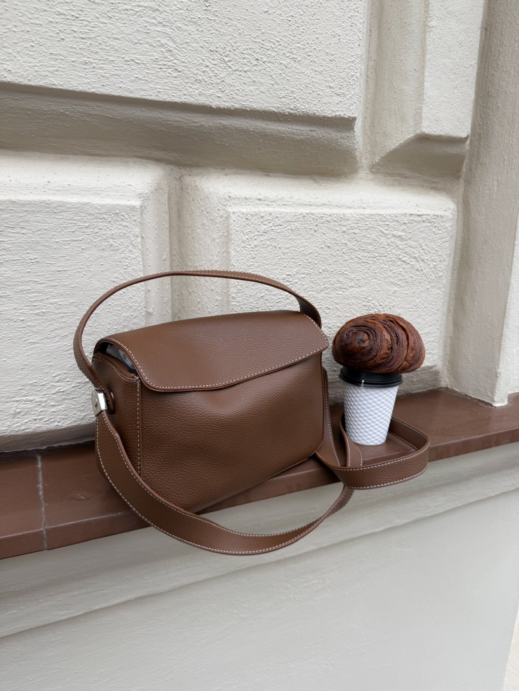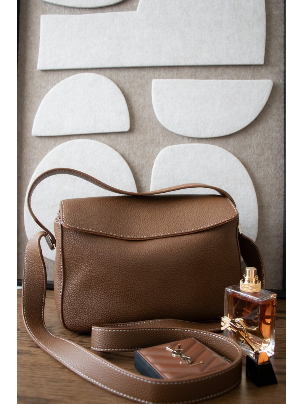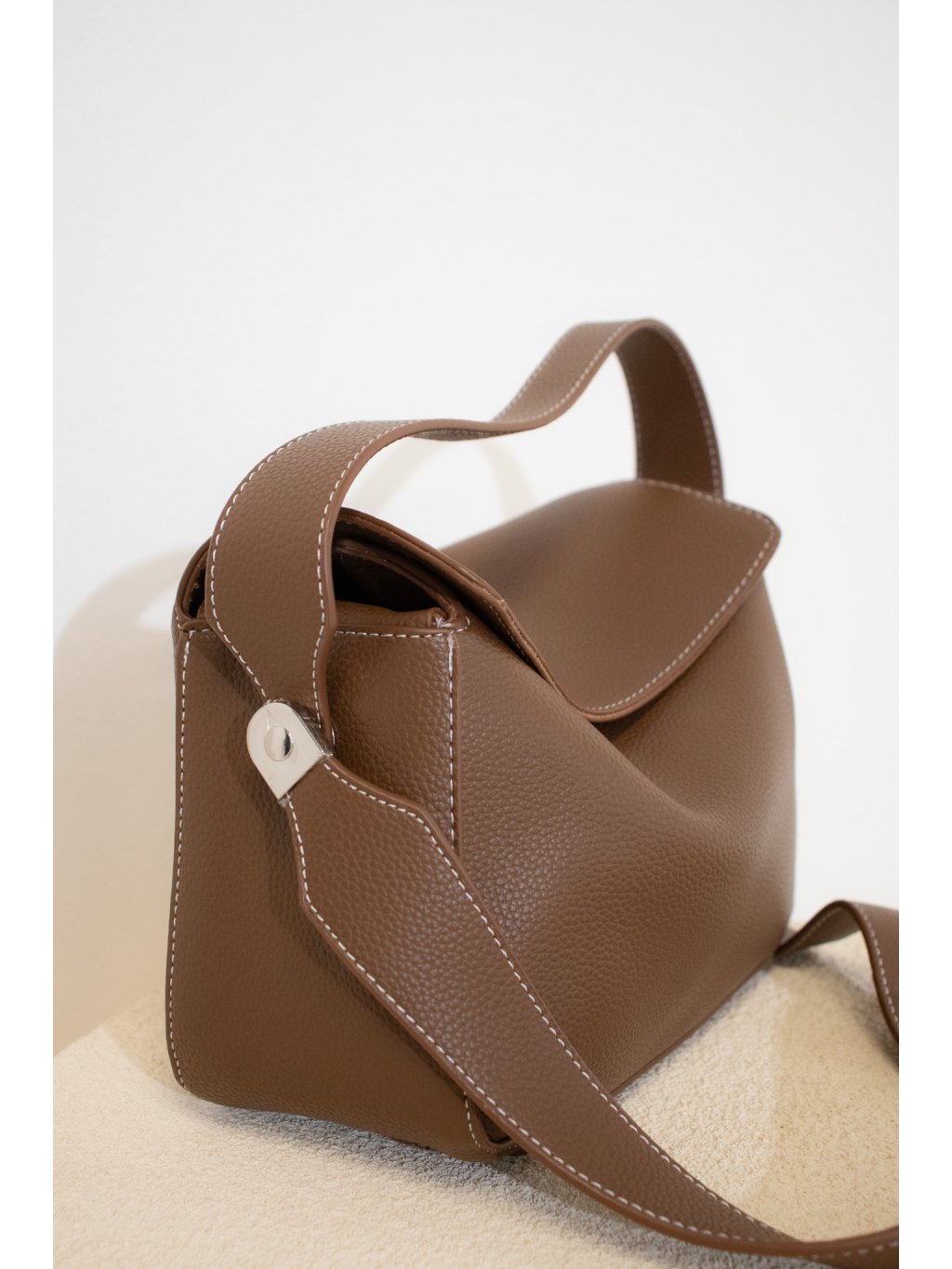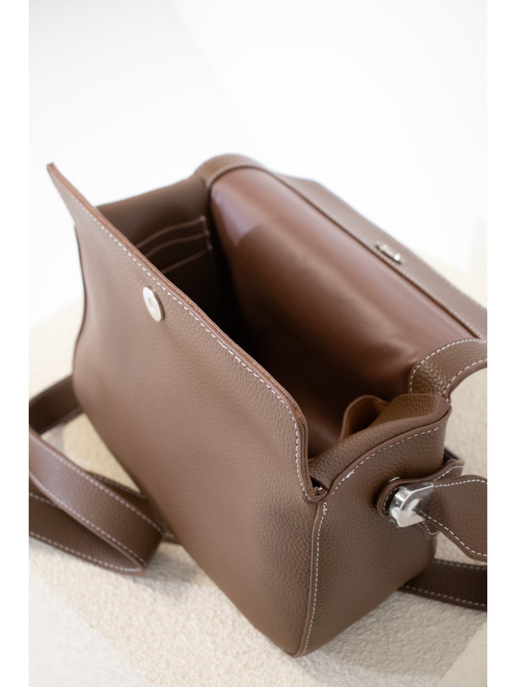 Hranatá koženková kabelka menší velikosti, zapínání na magnet, jedno krátké ucho, dlouhé ucho přes rameno, zpevněné dno. Uvnitř jedna otevřená kapsička, dále kapsička na kreditní karty, kapsička na psací potřeby či rtěnky. Kovové detaily jsou ve stříbrné barvě. Kabelka drží tvar.