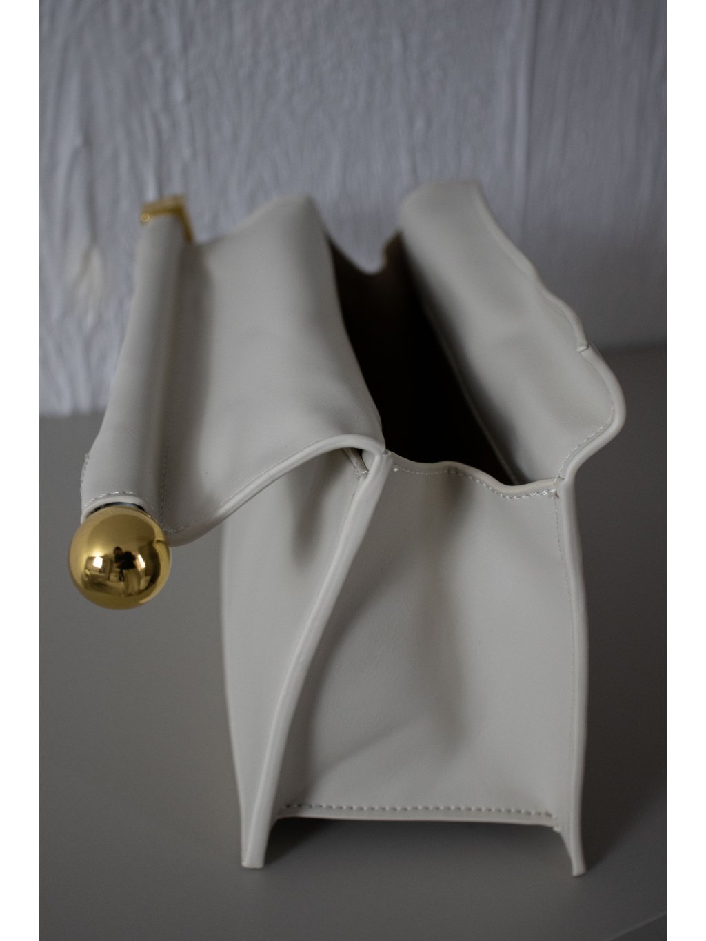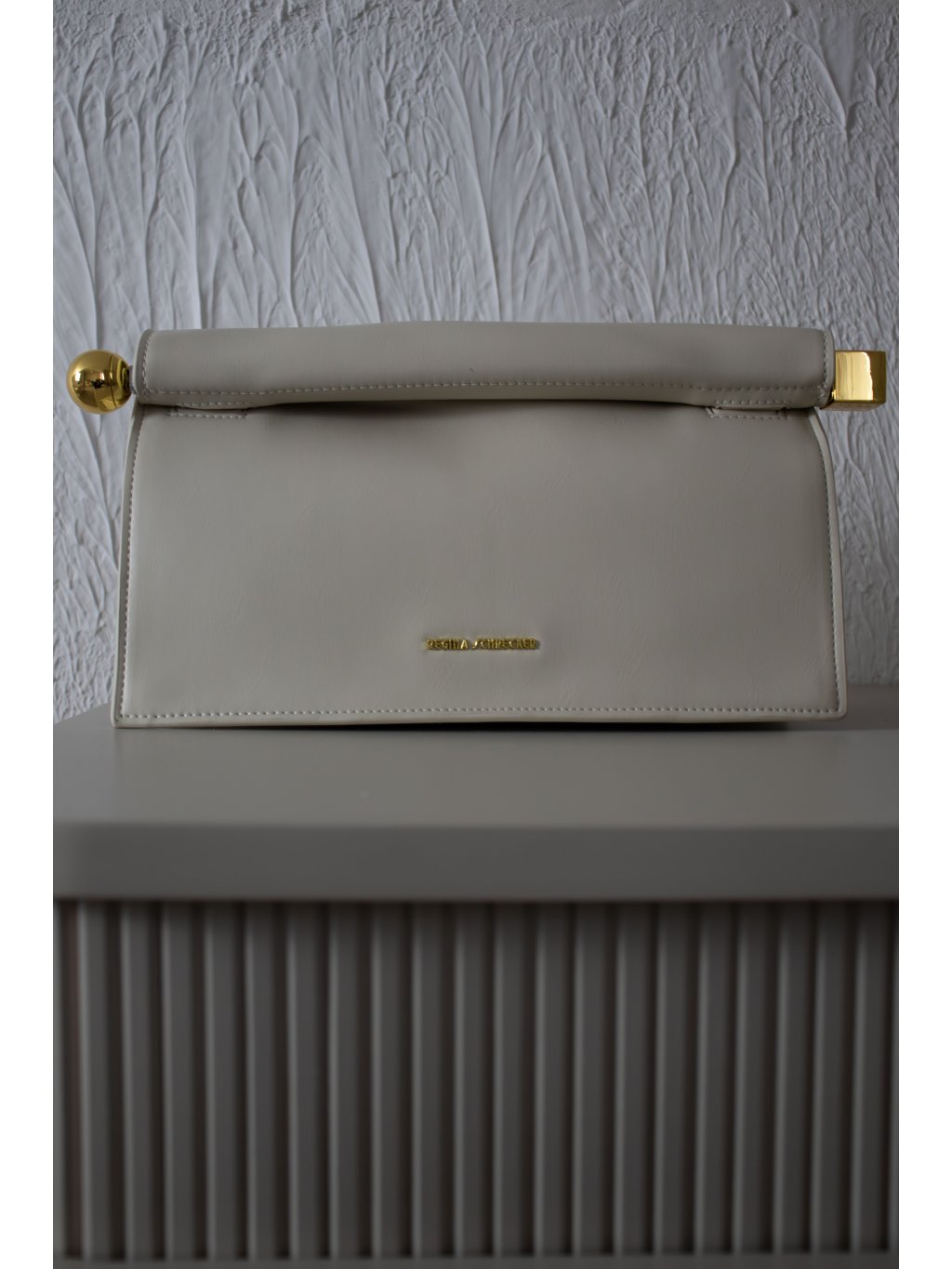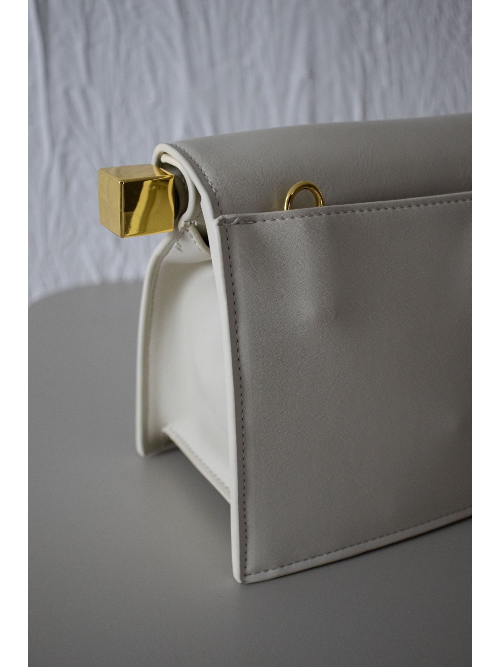 Hranatá kabelka menší velikosti, zavinovací zapínání na magnet, výrazný kovový detail jako "madlo". Na přední straně malý nápis. Uvnitř jeden otevřený prostor s jednou kapsičkou na zip. Součástí je také tenký odnímatelný popruh. Na zadní straně je kapsa. Kovové prvky na kabelce jsou ve zlaté barvě.
