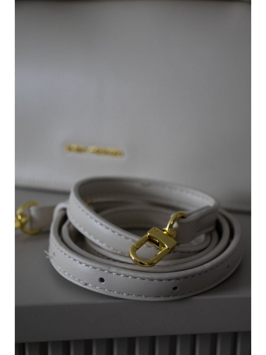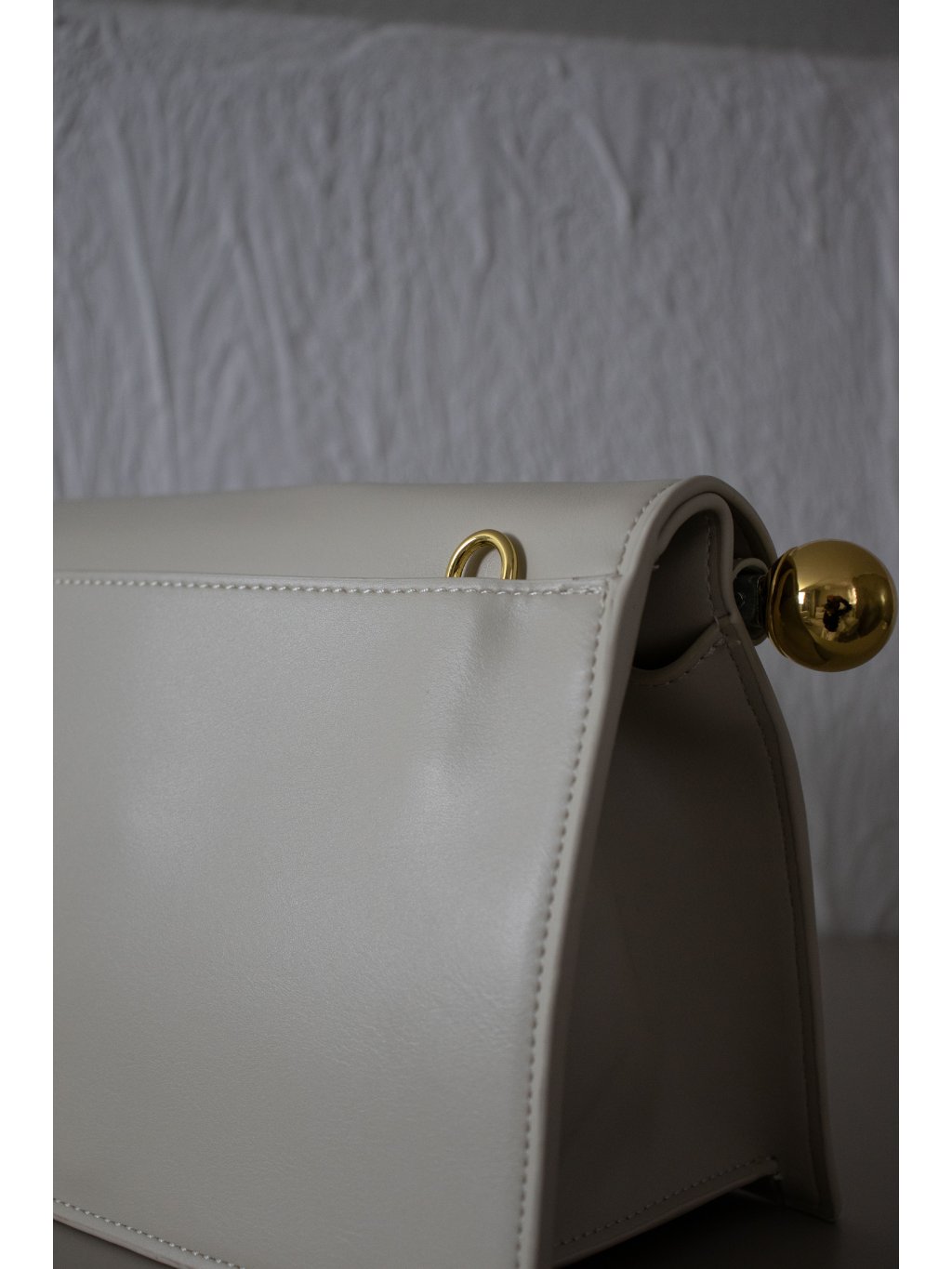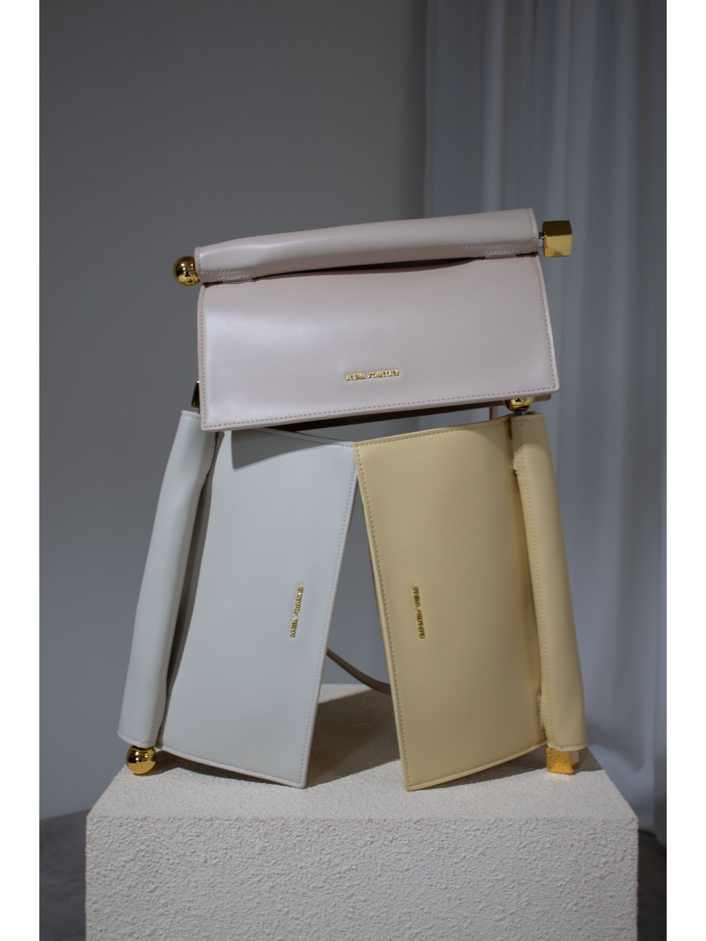 Hranatá kabelka menší velikosti, zavinovací zapínání na magnet, výrazný kovový detail jako "madlo". Na přední straně malý nápis. Uvnitř jeden otevřený prostor s jednou kapsičkou na zip. Součástí je také tenký odnímatelný popruh. Na zadní straně je kapsa. Kovové prvky na kabelce jsou ve zlaté barvě.