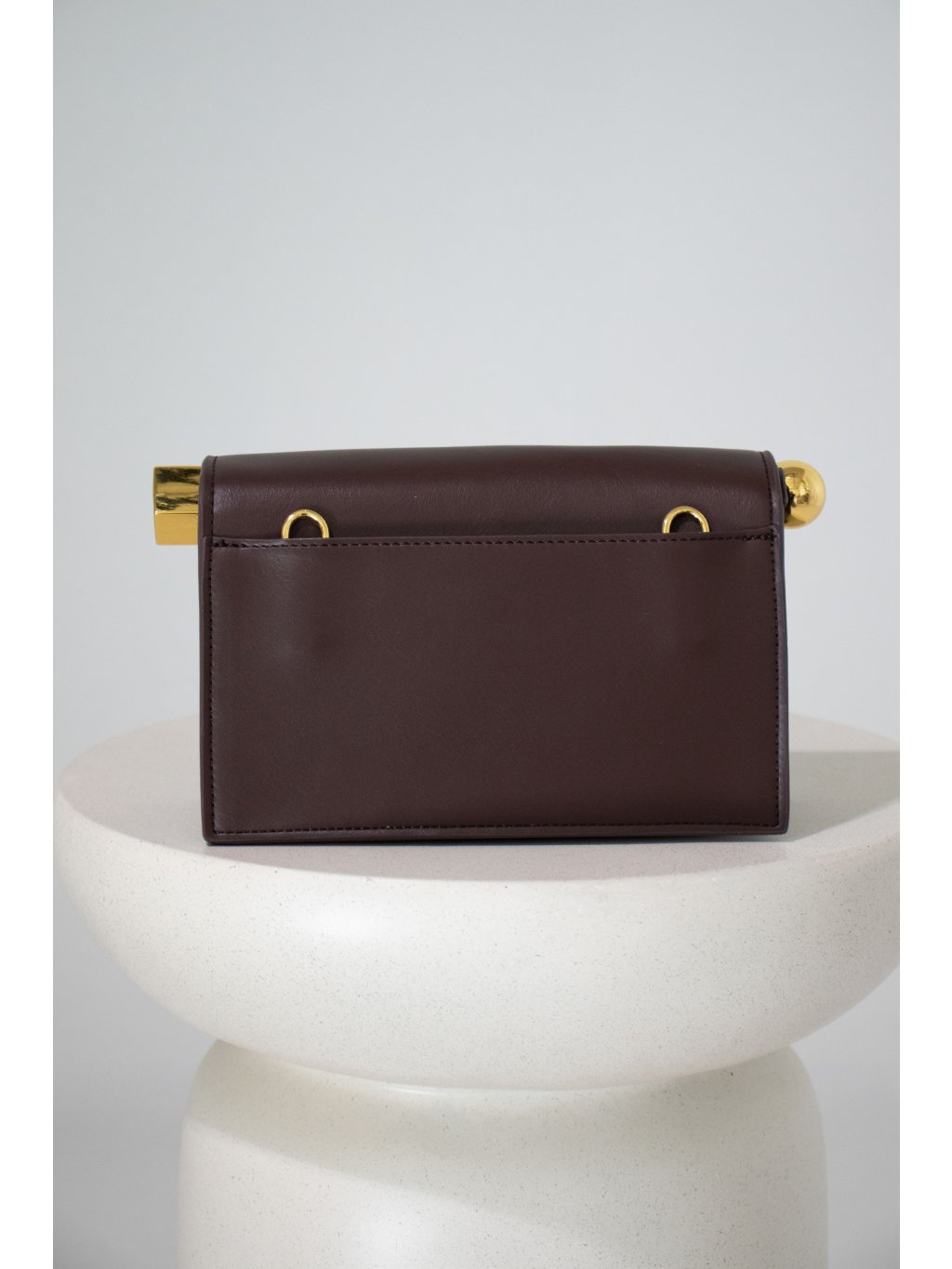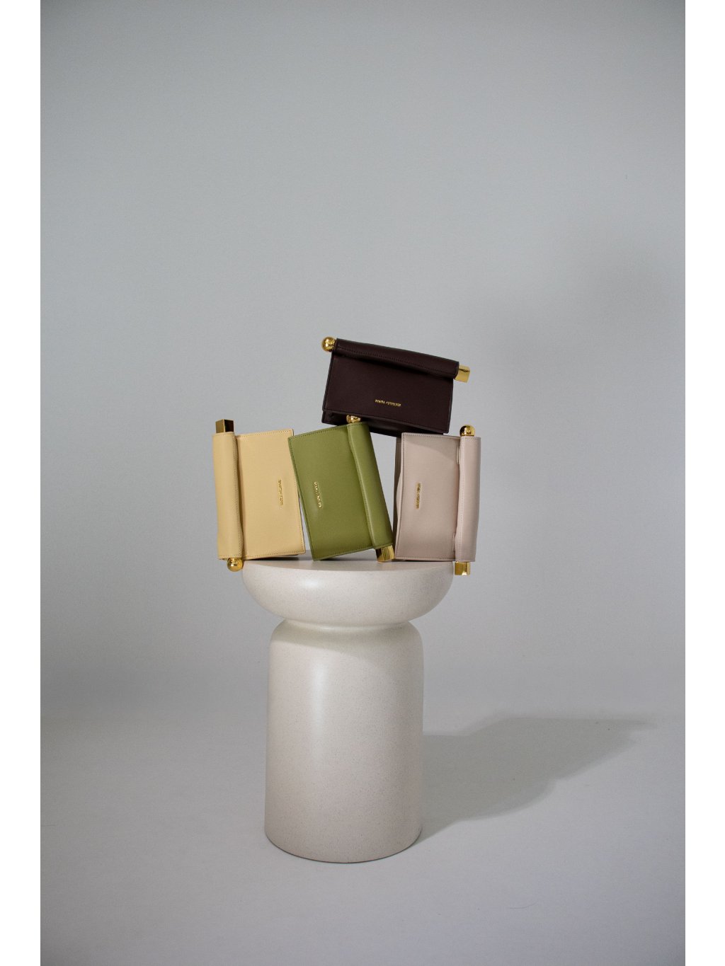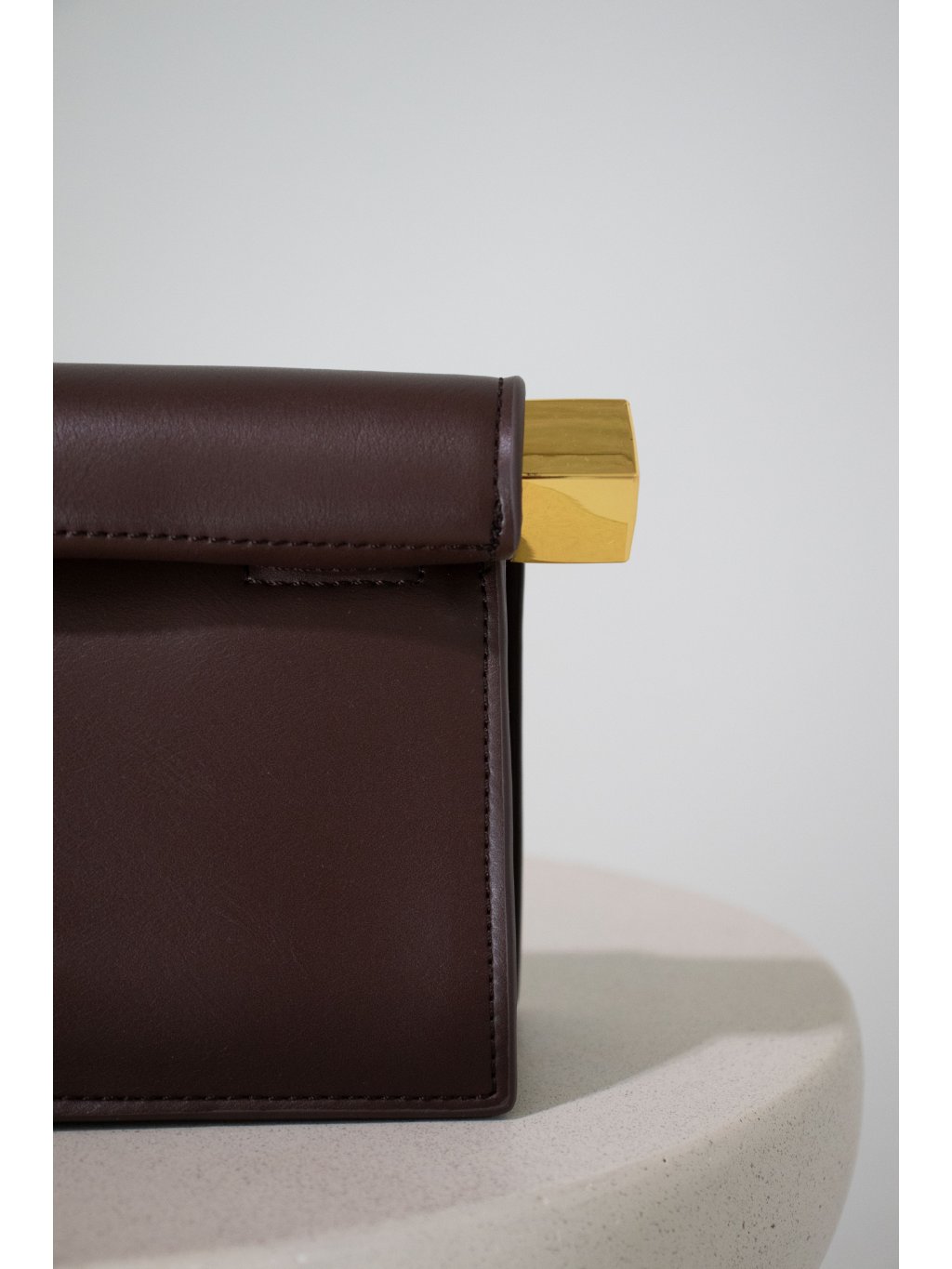 Malá hranatá kabelka, zavinovací zapínání na magnet, výrazný kovový detail jako "madlo". Na přední straně malý nápis. Uvnitř jeden otevřený prostor s jednou kapsičkou na zip. Součástí je také tenký odnímatelný popruh. Na zadní straně je kapsa. Kovové prvky na kabelce jsou ve zlaté barvě.