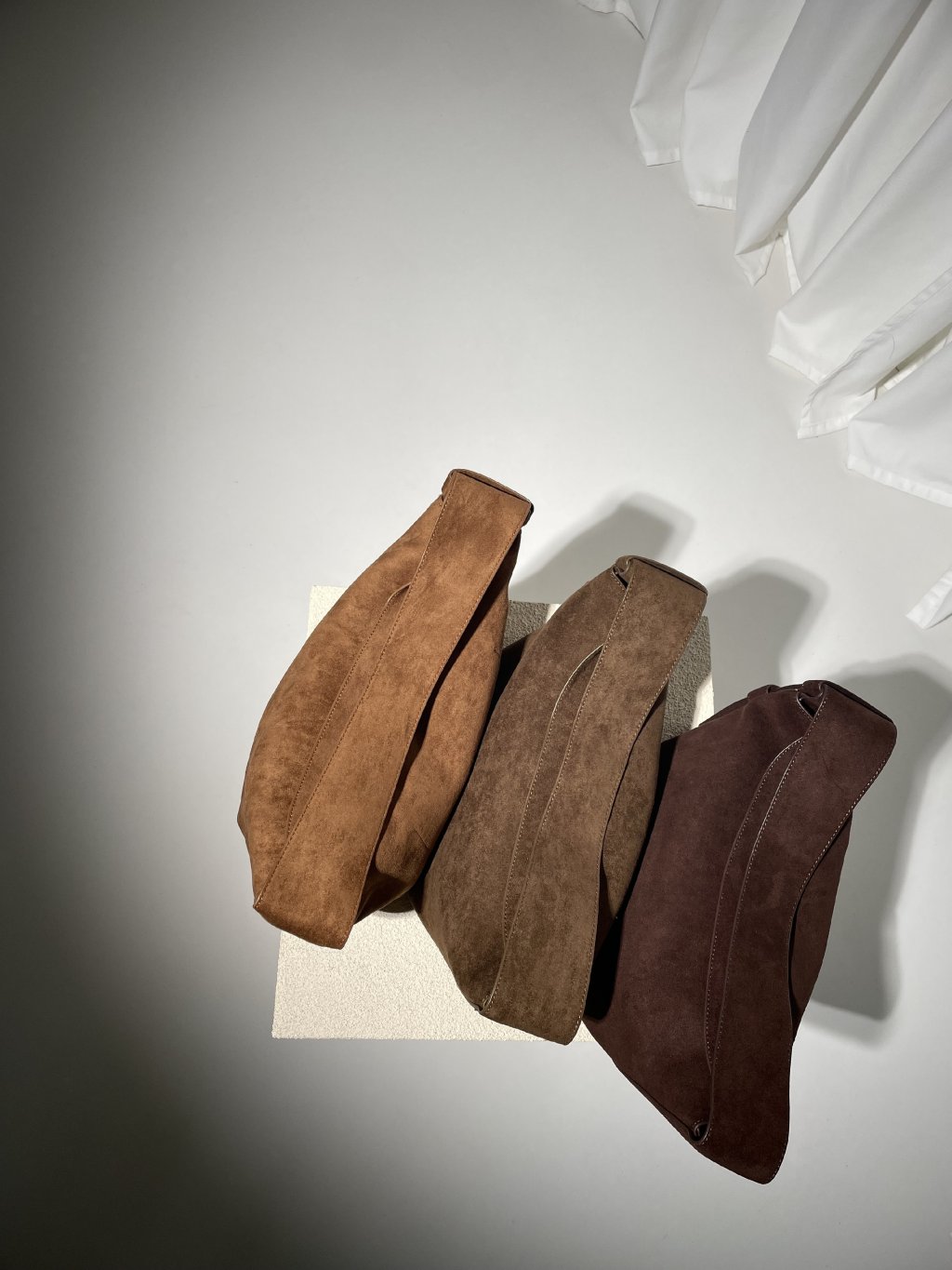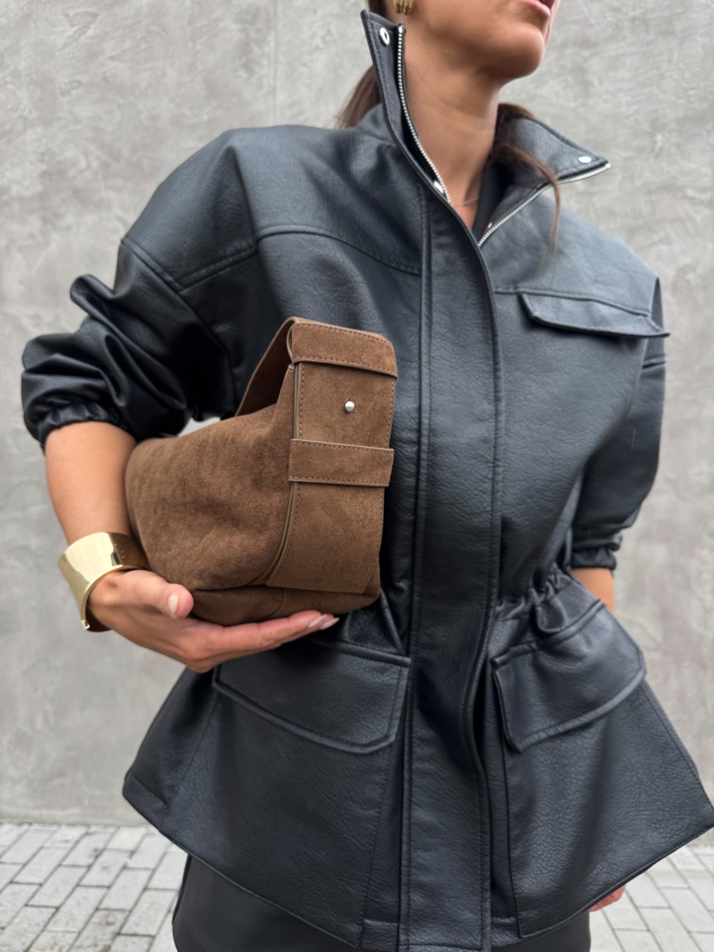 Kožená semišová kabelka menší velikosti, zapínání na magnety, jedno ucho, uvnitř otevřená kapsička. Součástí je odnímatelný široký popruh.