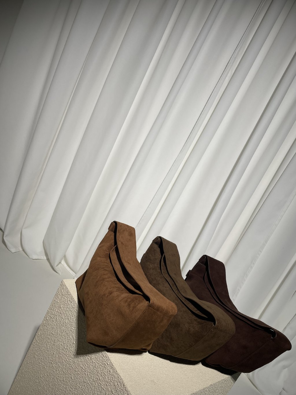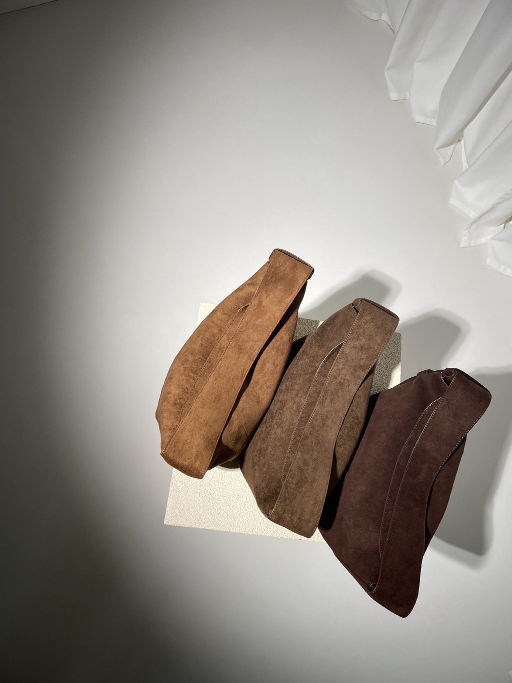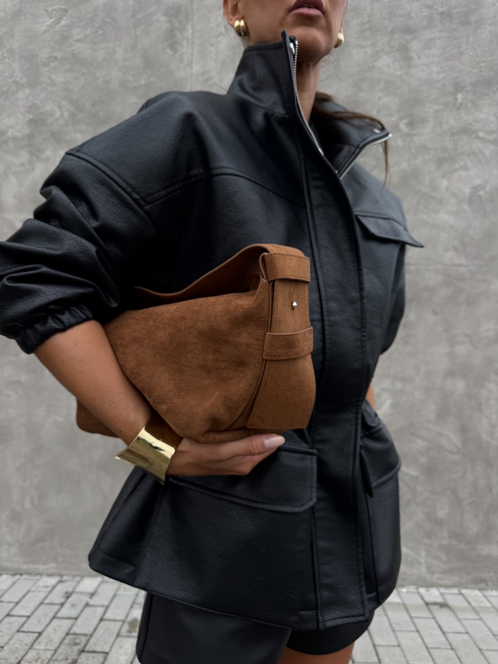 Kožená semišová kabelka menší velikosti, zapínání na magnety, jedno ucho, uvnitř otevřená kapsička. Součástí je odnímatelný široký popruh.