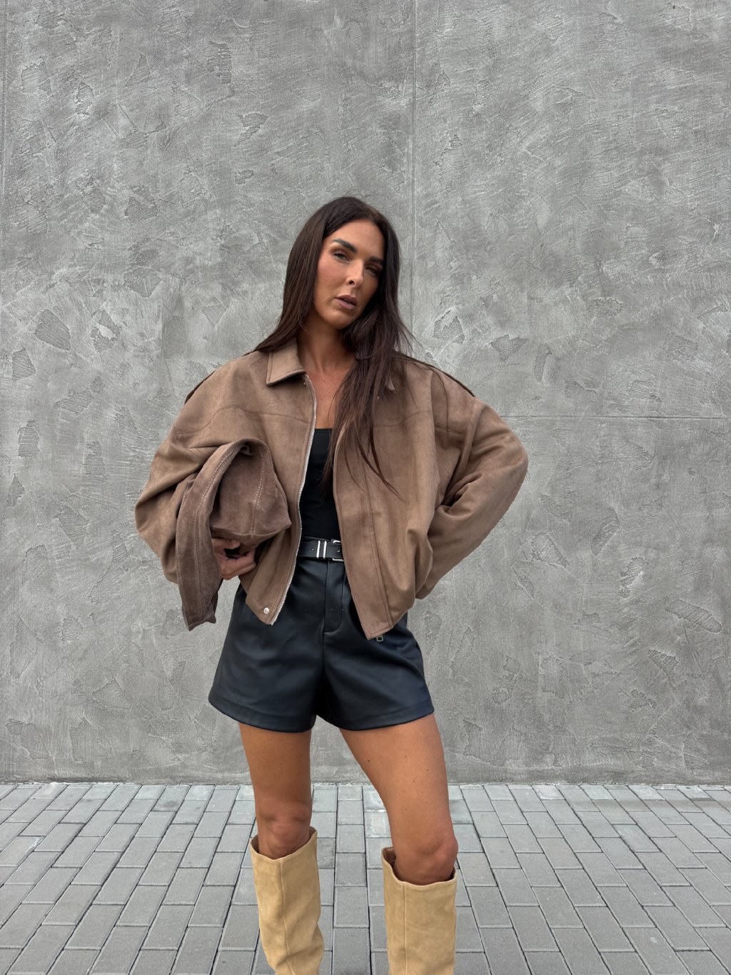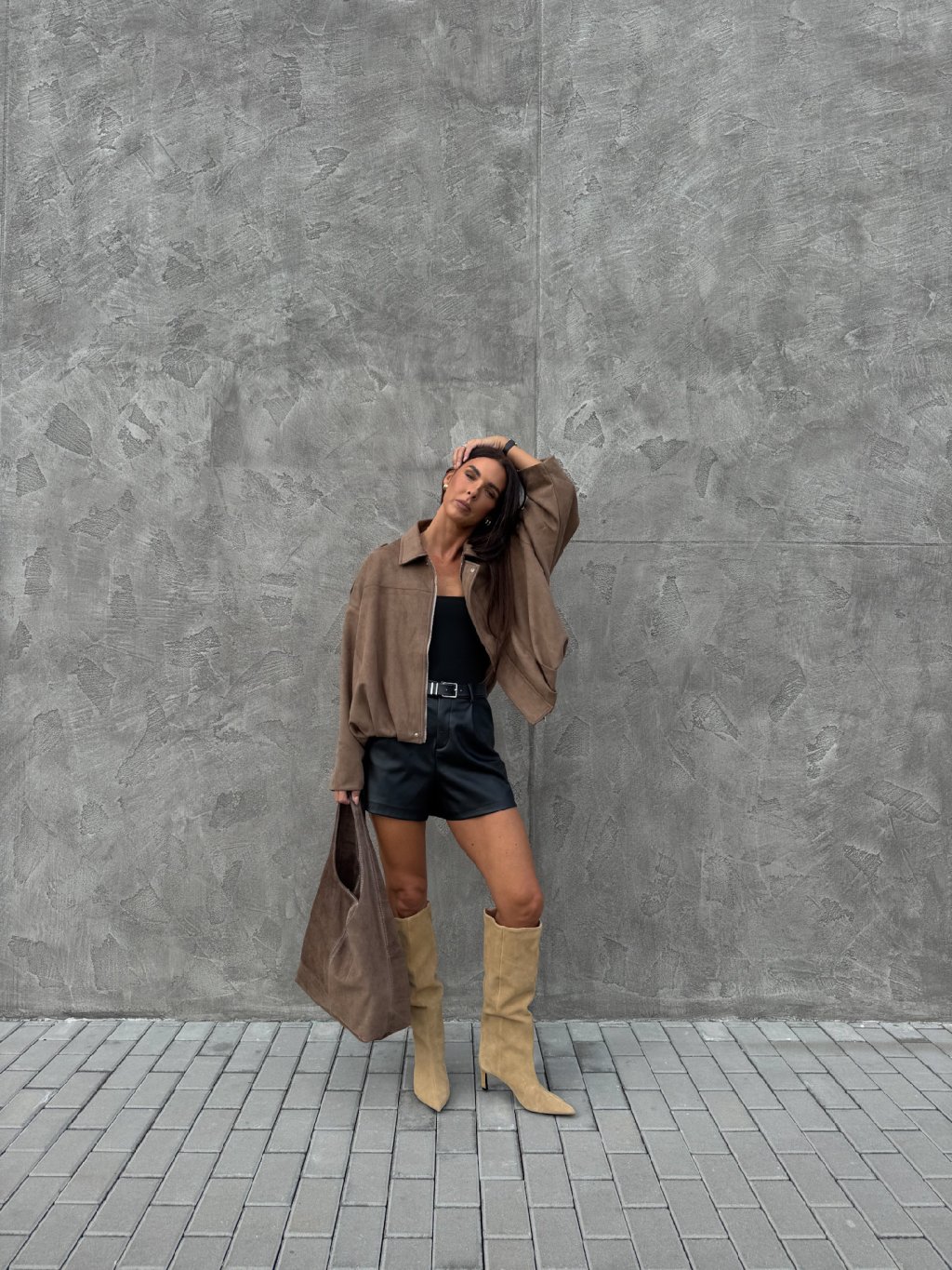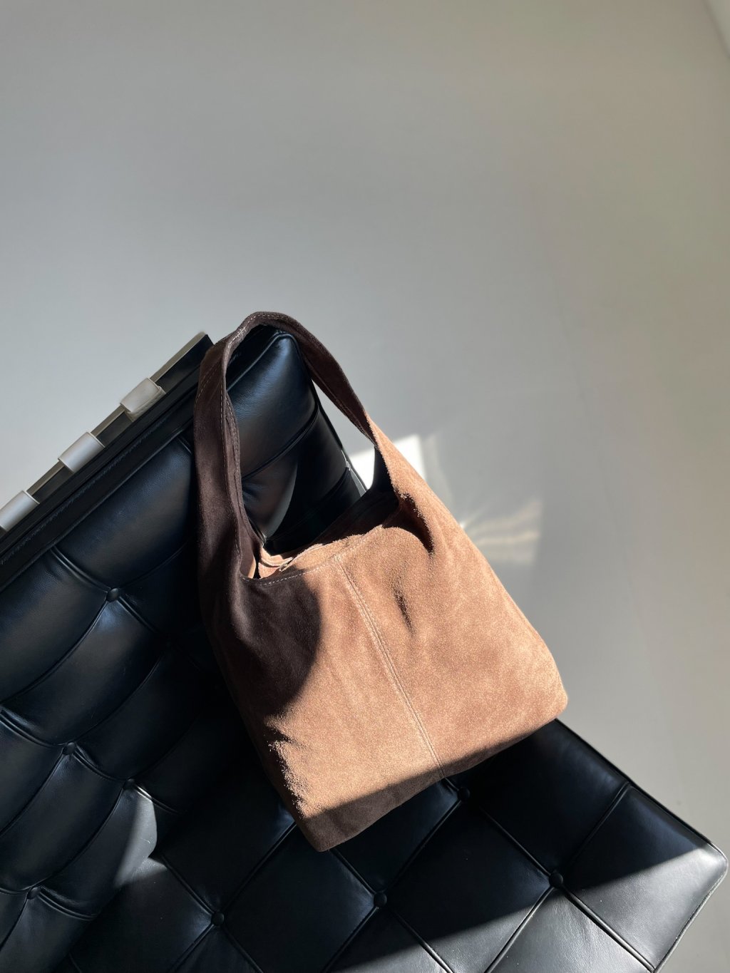 Kožená semišová kabelka přes rameno, hluboká, s jemně zvýrazněným prošíváním, zapínání na zip. Kovovým řetízkem je ke kabelce připevněna kapsička na zip. Detaily na kabelce jsou ve stříbrné barvě. Materiál je měkký.
