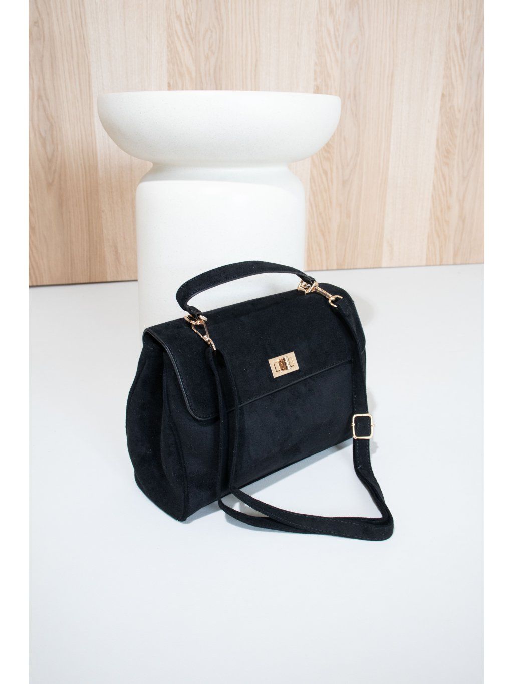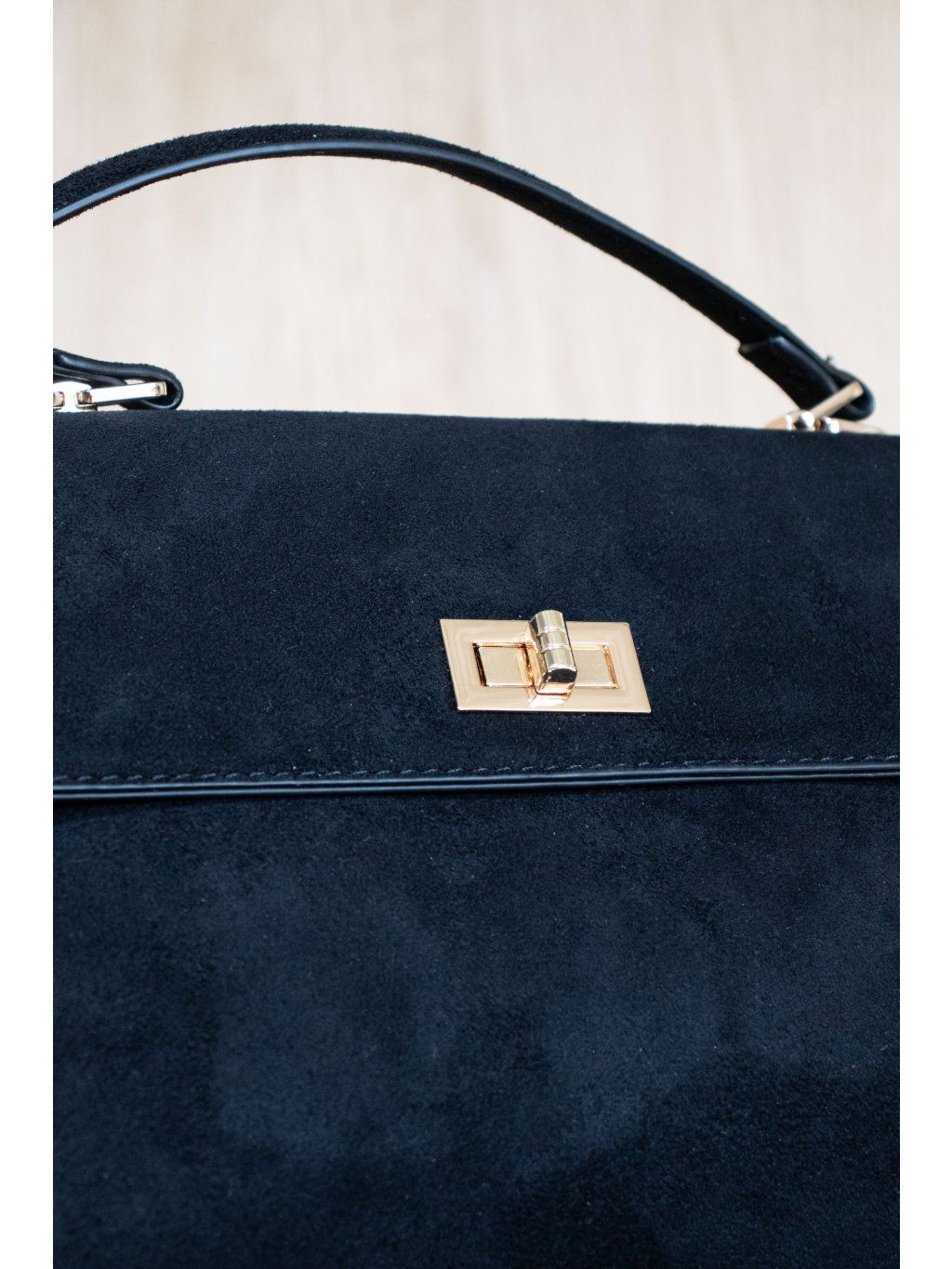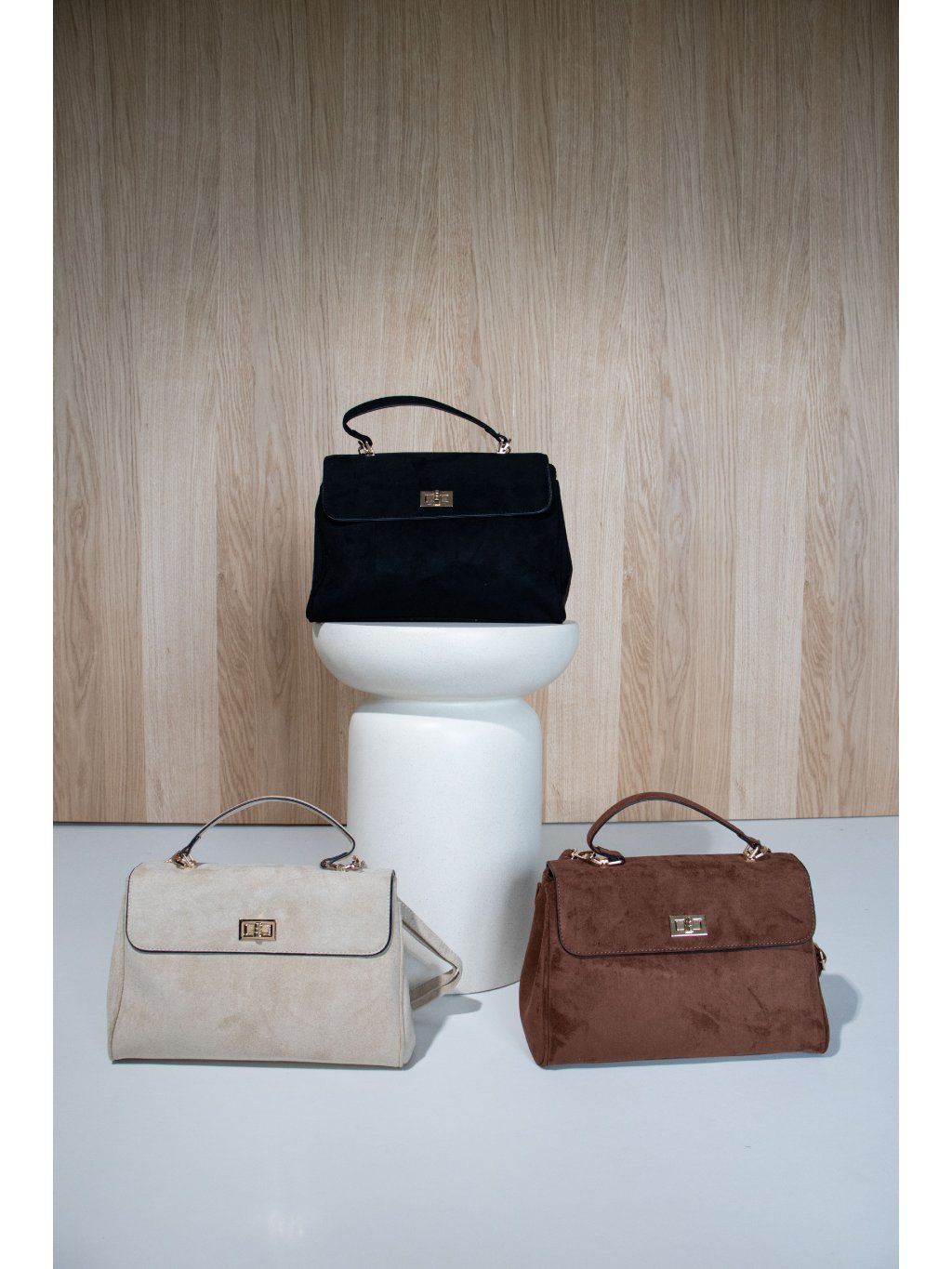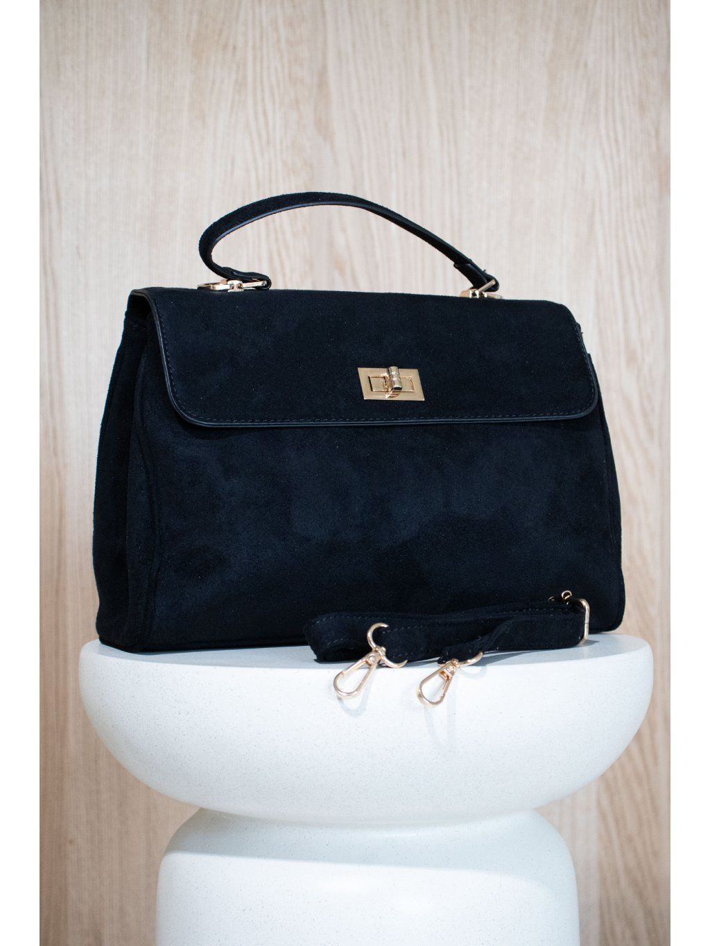 Koženková broušená kabelka s klopou. Zapínání na zámeček ve zlaté barvě, jedno krátké ucho, zpevněné dno. Uvnitř dvě přihrádky, jedna kapsička na zip. Součástí je tenký odnímatelný popruh. Všechny kovové detaily jsou ve zlaté barvě.