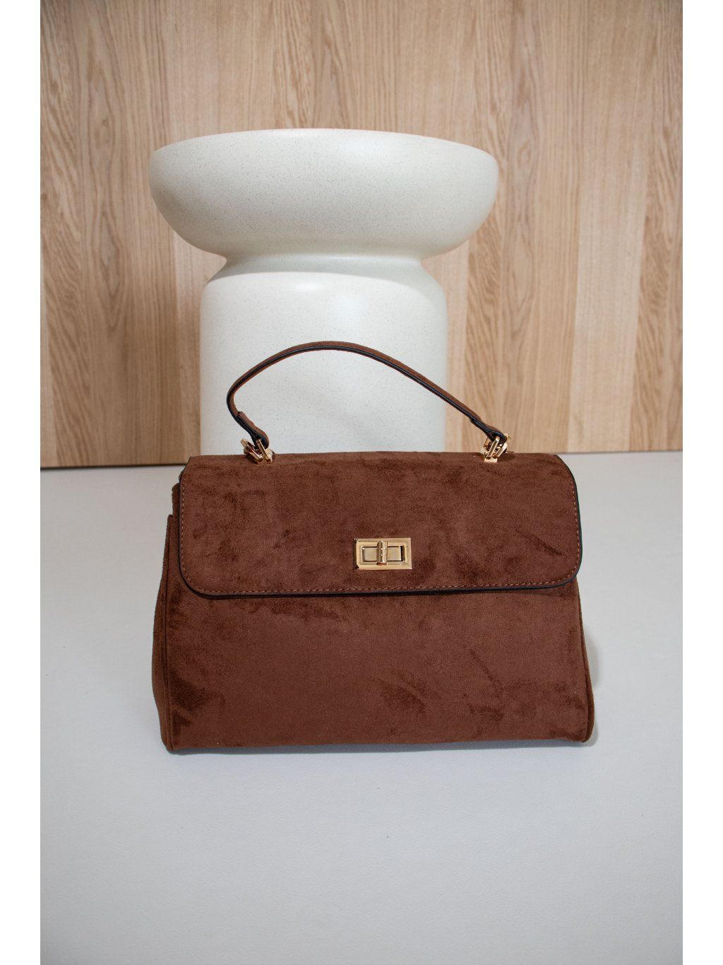 Koženková broušená kabelka s klopou. Zapínání na zámeček ve zlaté barvě, jedno krátké ucho, zpevněné dno. Uvnitř dvě přihrádky, jedna kapsička na zip. Součástí je tenký odnímatelný popruh. Všechny kovové detaily jsou ve zlaté barvě.