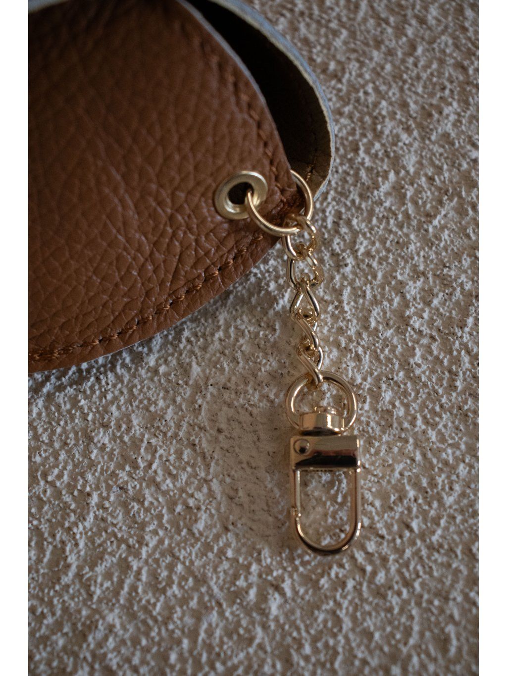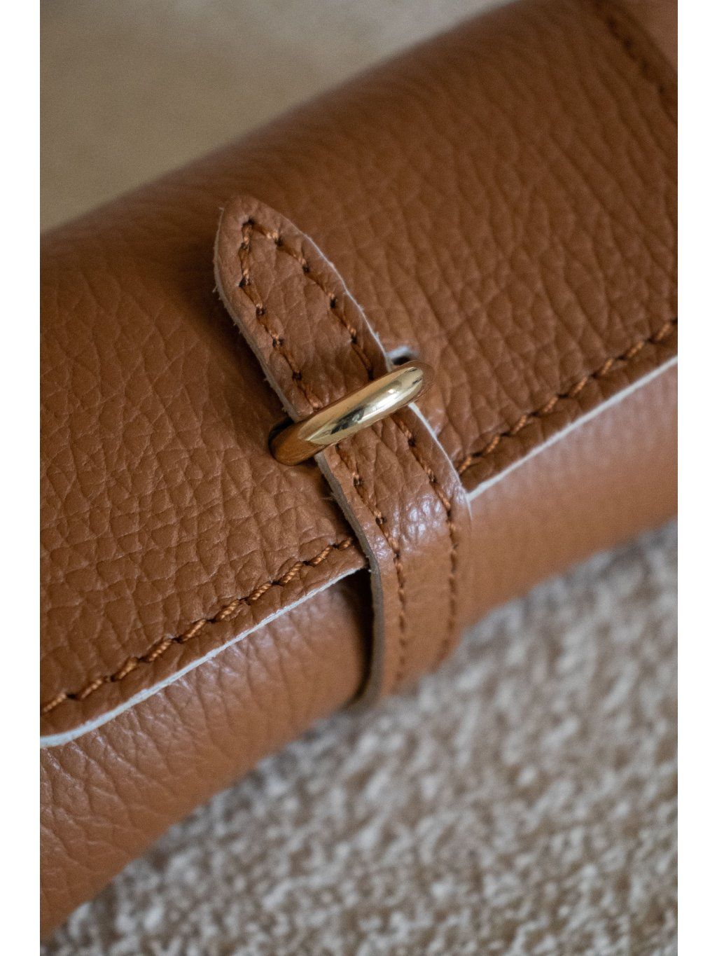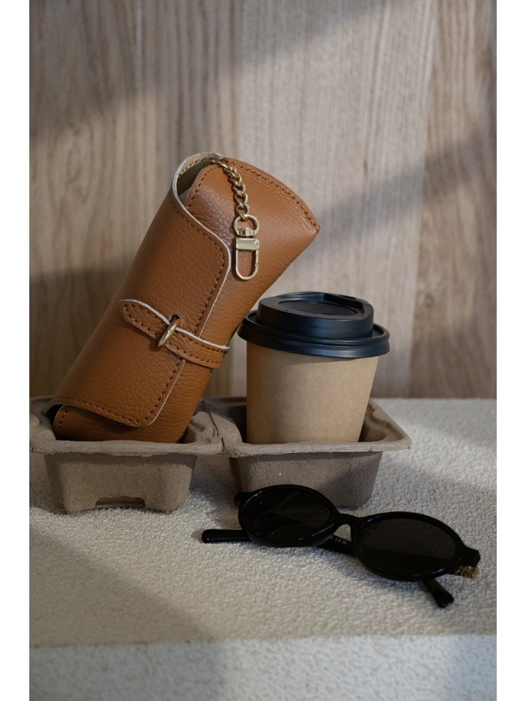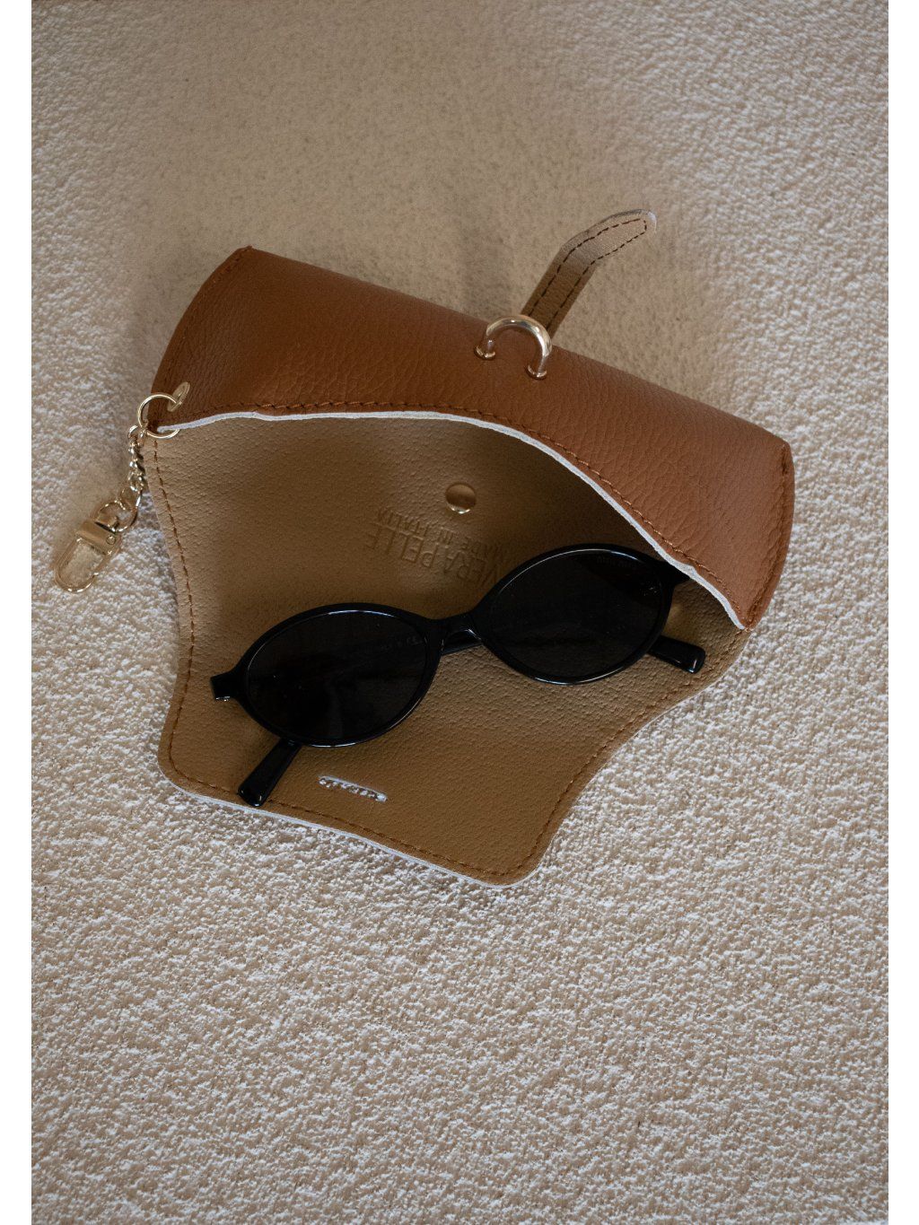 Kožený obal na brýle. Pevná konstrukce, drží tvar. Zapínání na pásek s kovovým detailem. Součástí je i kovová karabina, díky které se může obal připnout na kabelku nebo poutko.