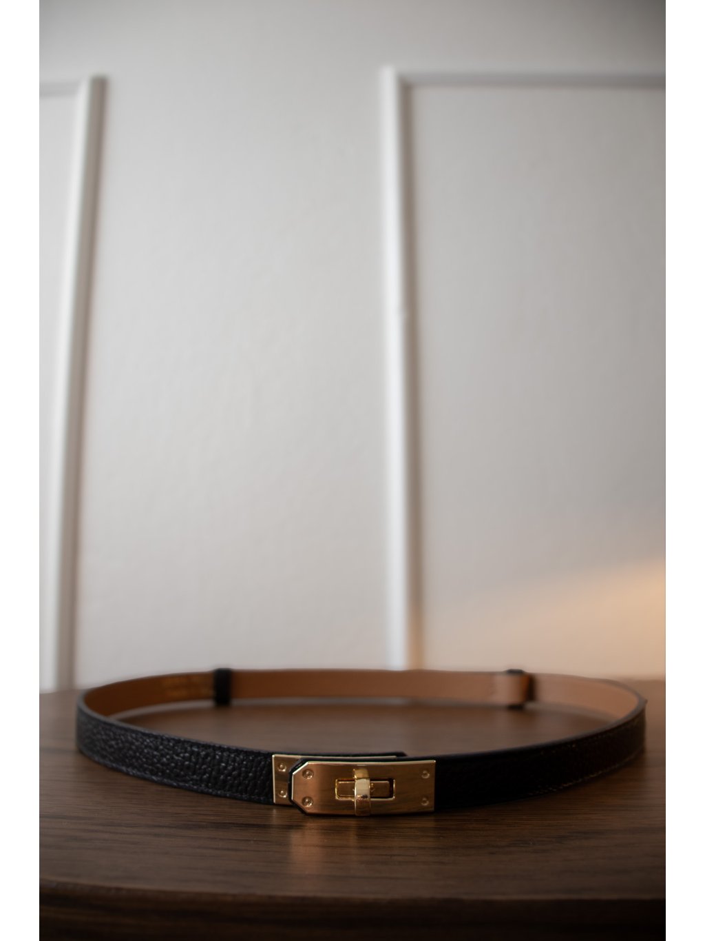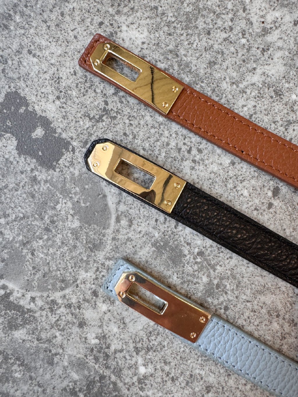 Tenký opasek s kovovou sponou ve zlaté barvě. Materiál - kůže.
