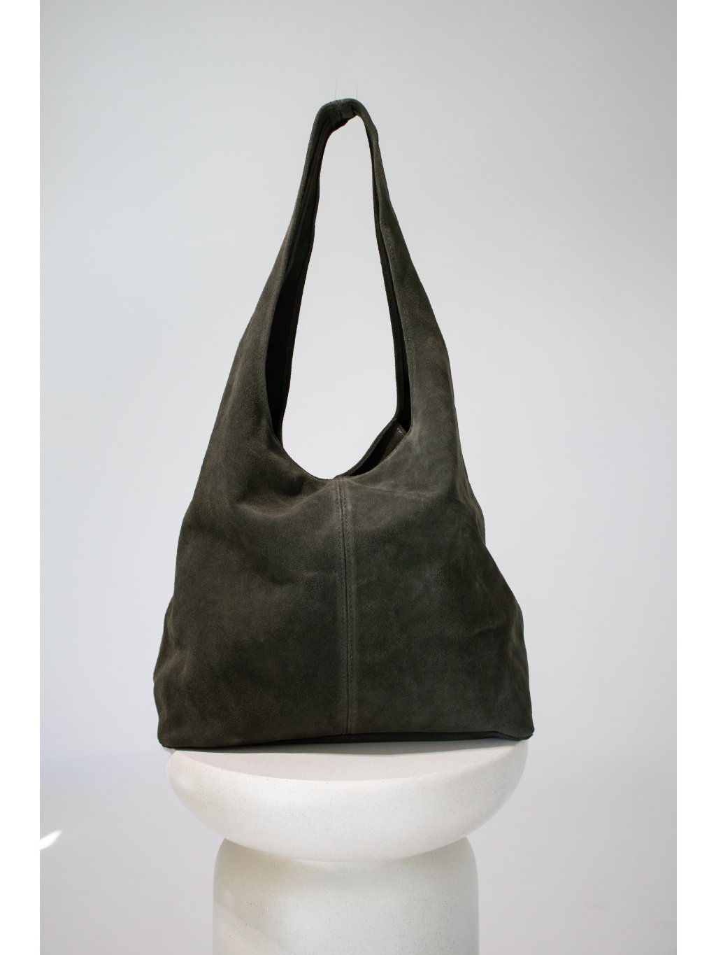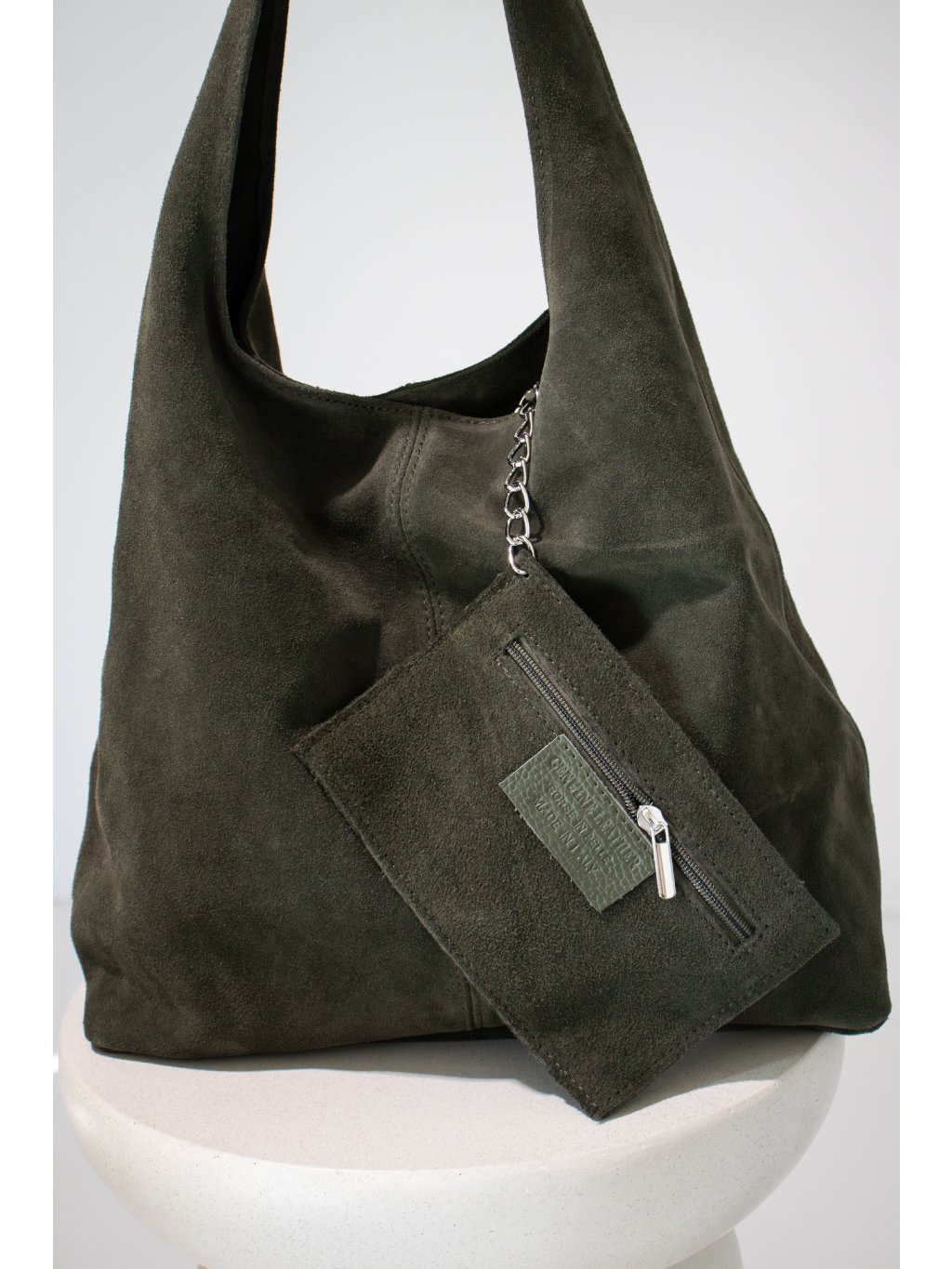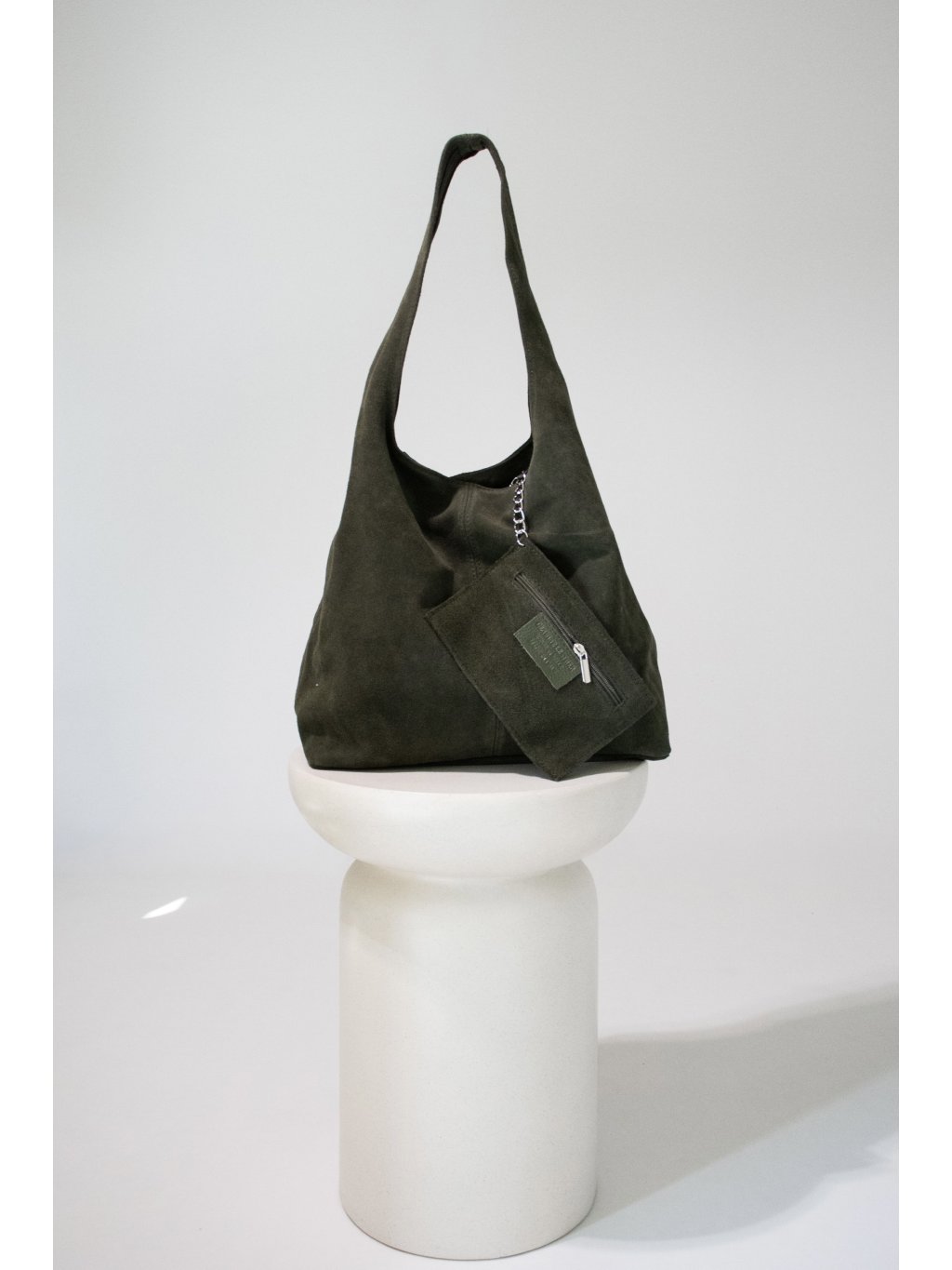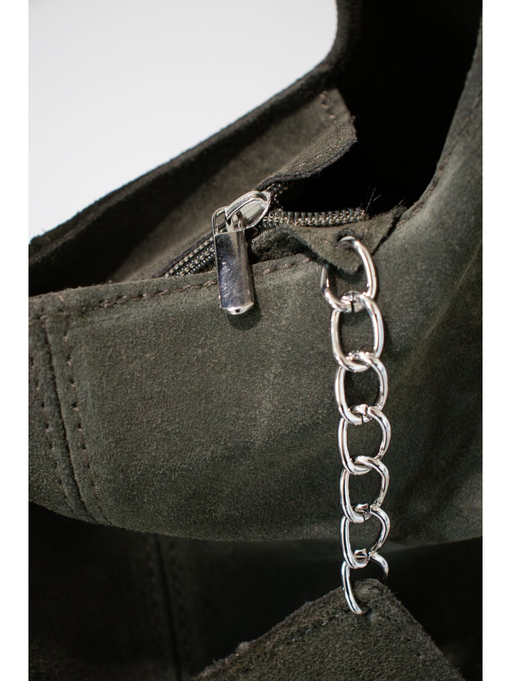 Kožená kabelka/sack přes rameno, jedno širší ucho, zapínání na zip v khaki barvě, uvnitř otevřený prostor, na kovovém řetízku je připevněna jedna kapsička na zip.