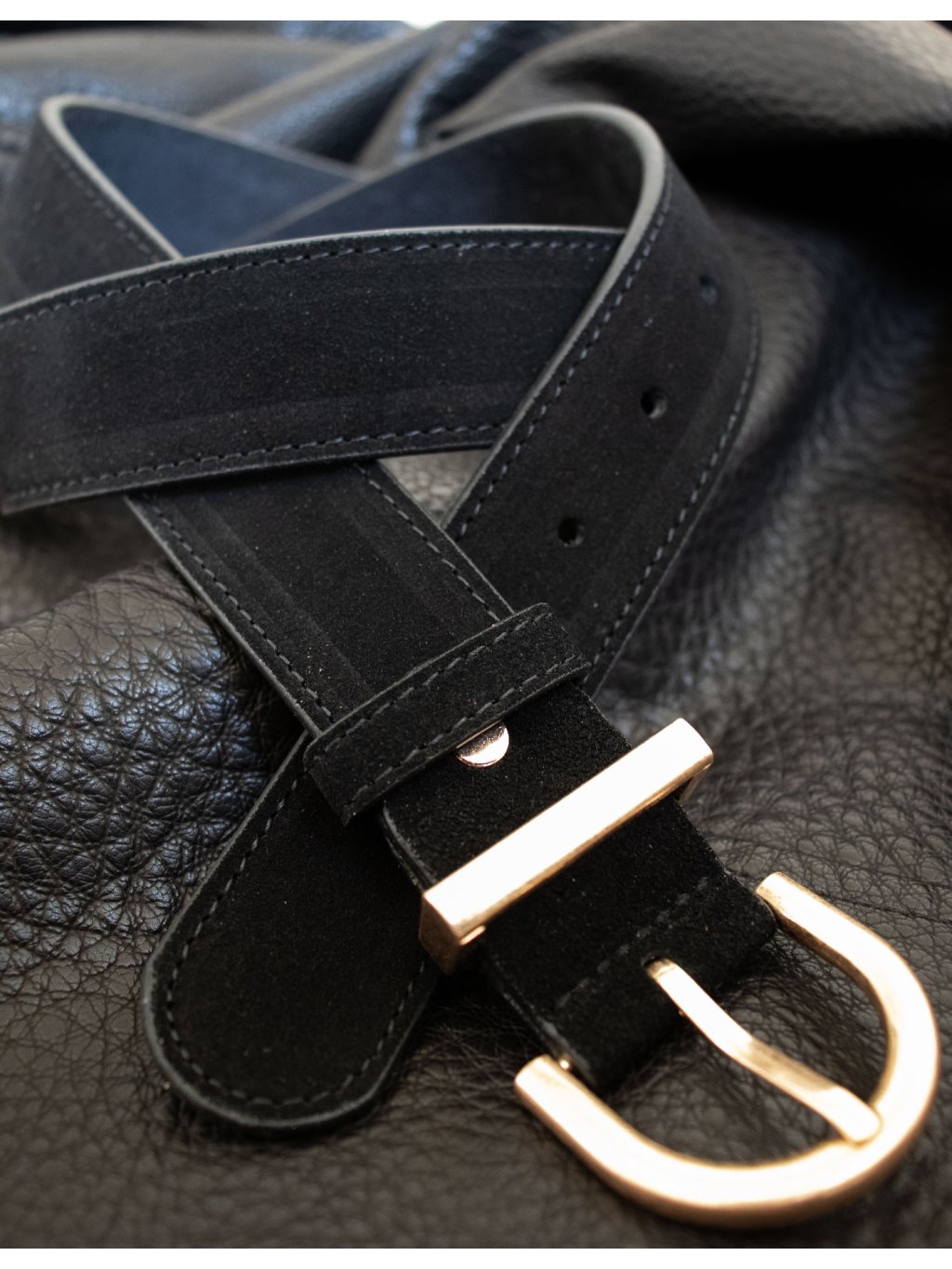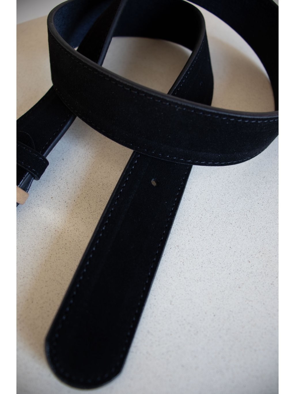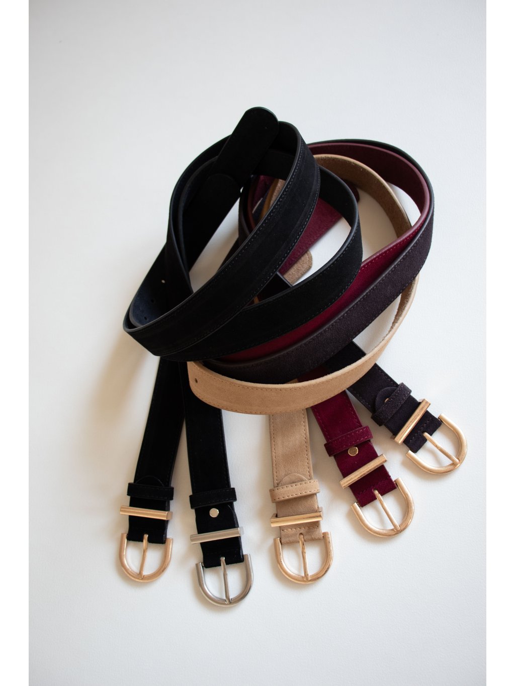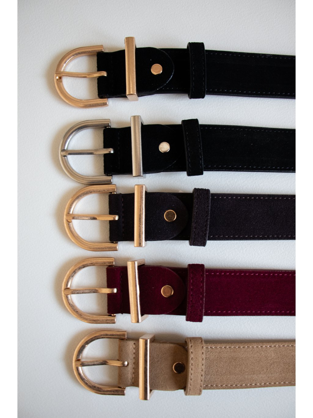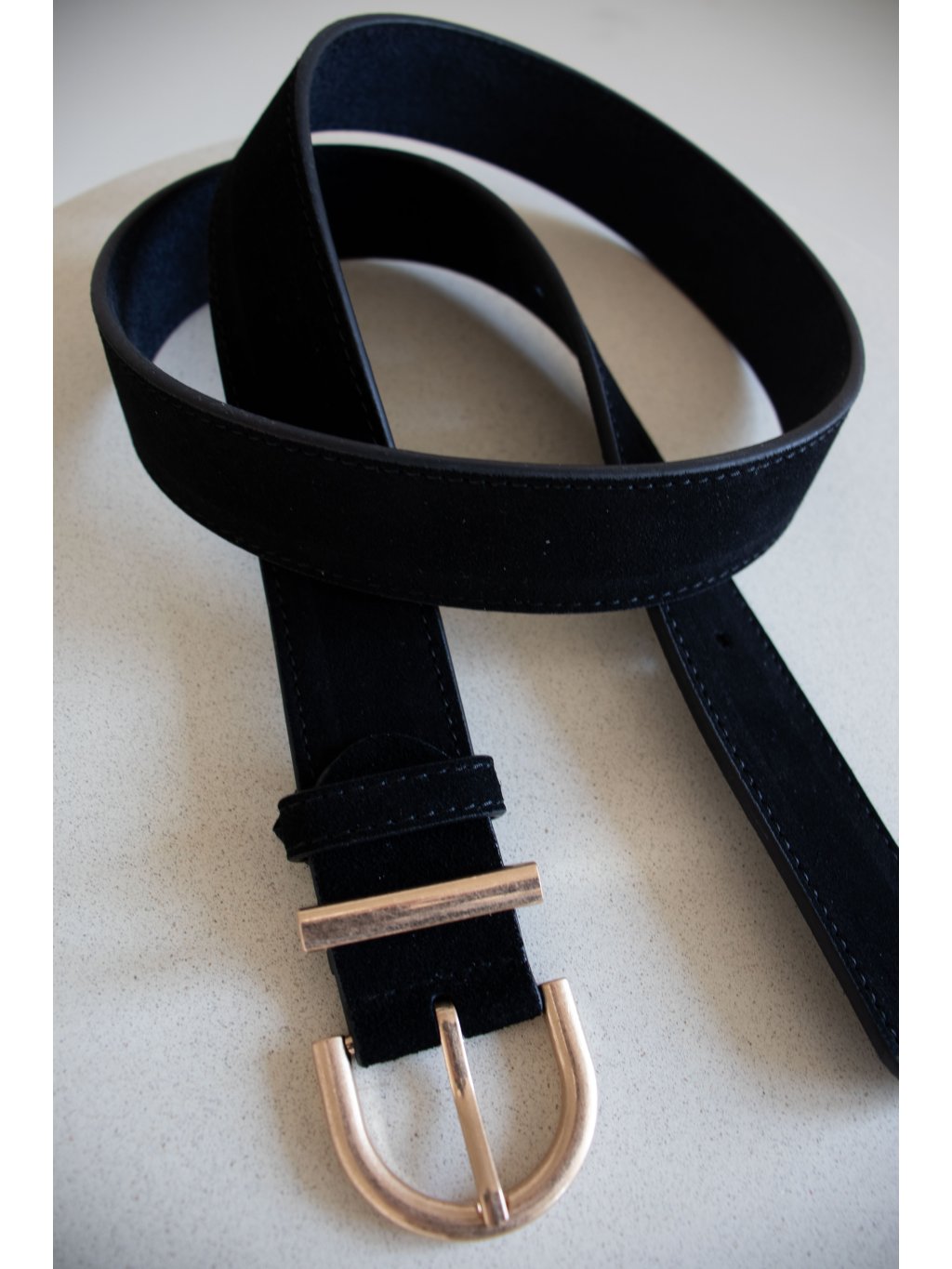 Kožený semišový pásek s kovovou oválnou sponou ve zlaté barvě. Pásek je možné pomocí šroubku zkrátit.