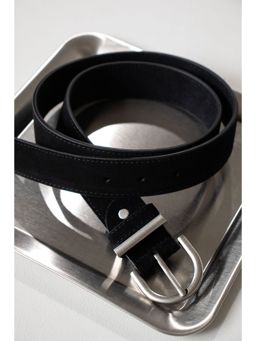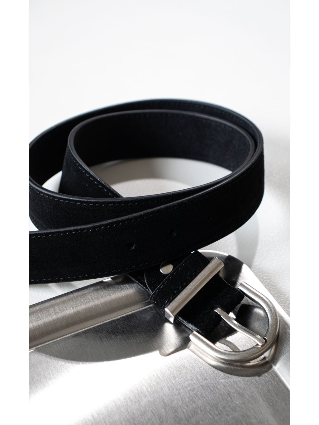 Kožený semišový pásek s kovovou oválnou sponou ve stříbrné barvě.