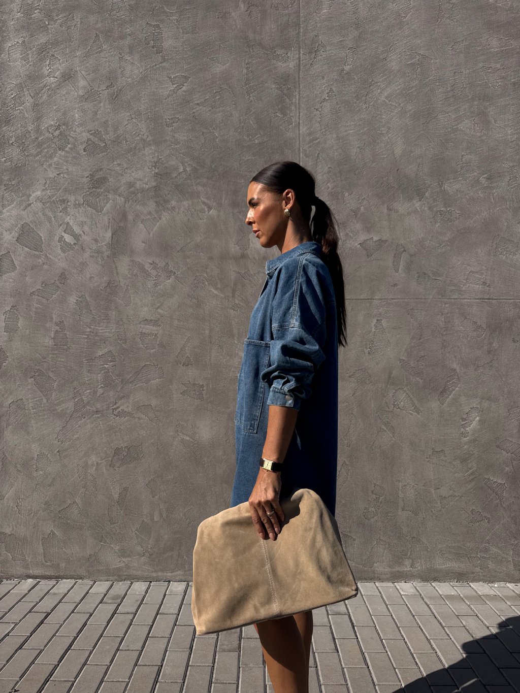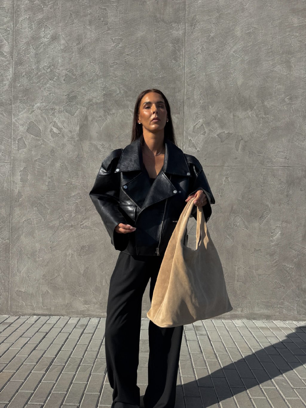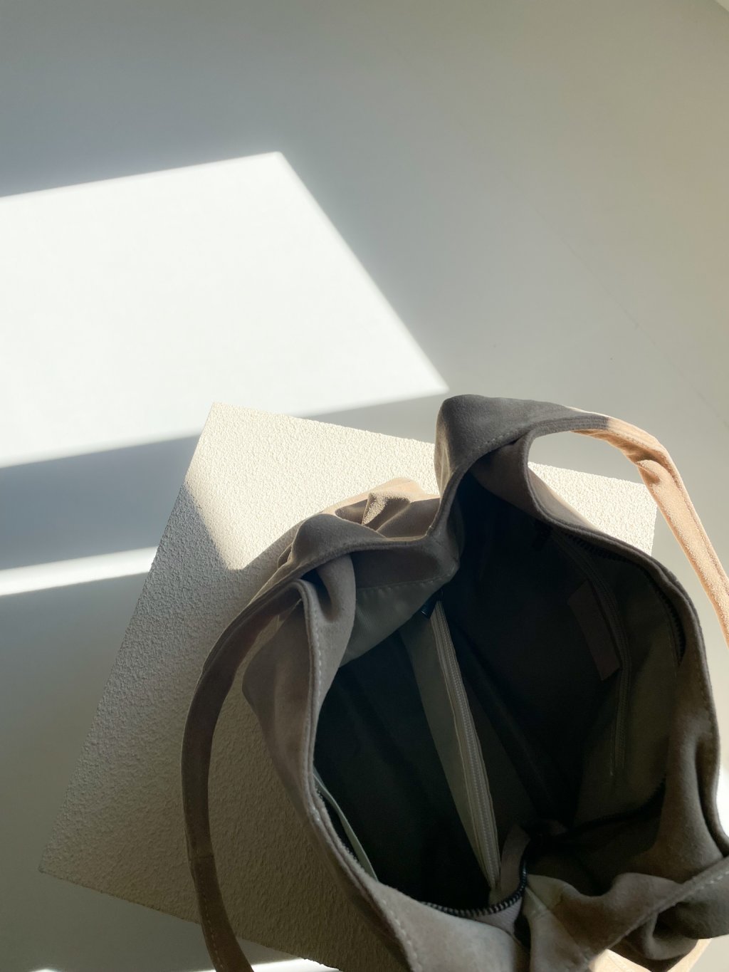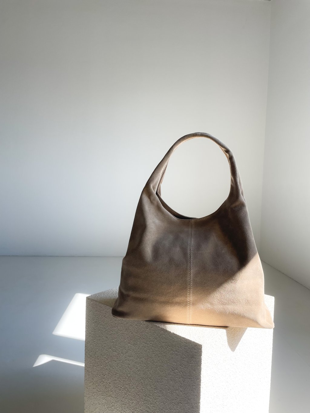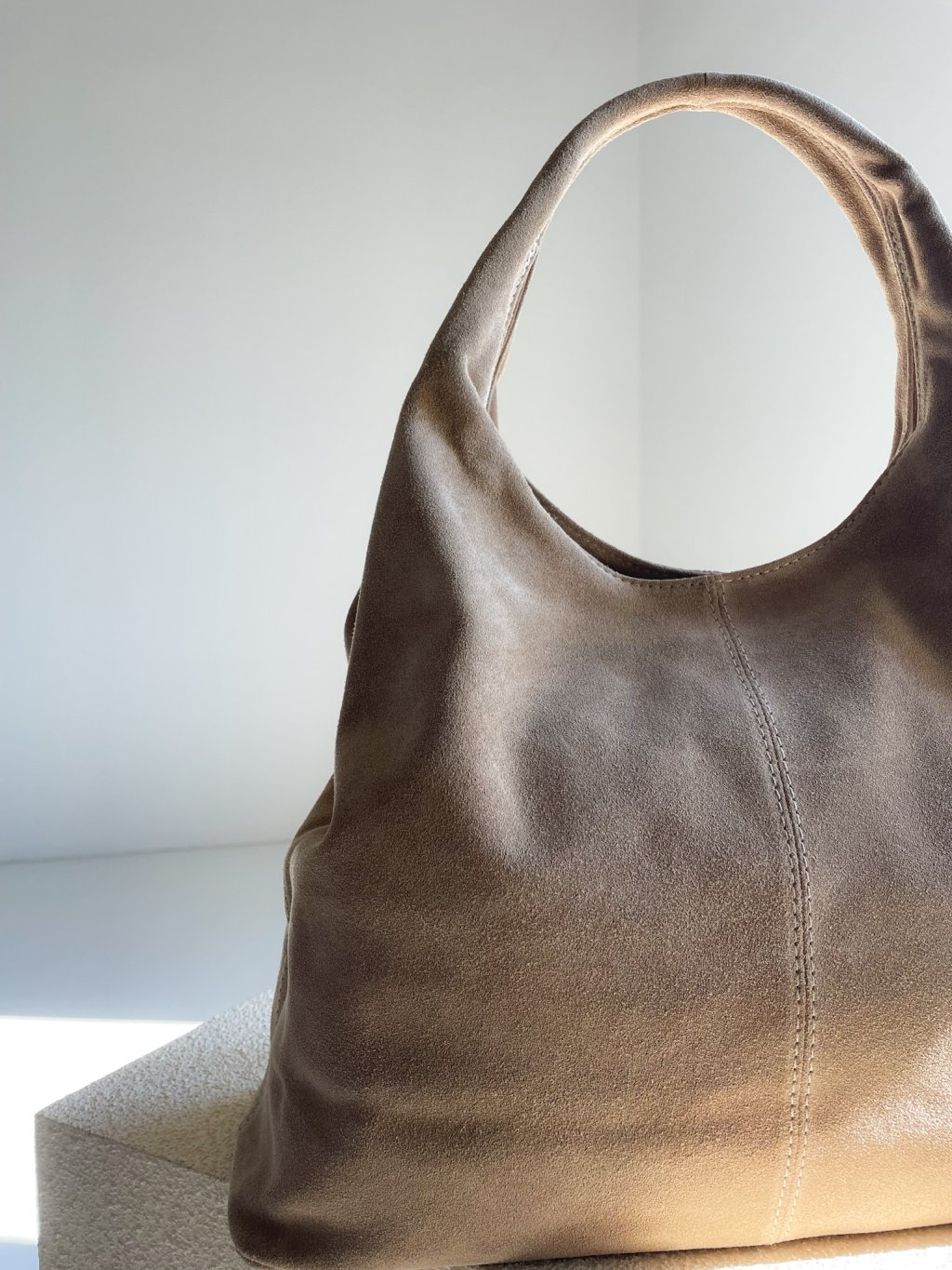 Kožená semišová kabelka/vak s jemně zvýrazněným prošíváním, dvě ucha, zapínání na zip. Uvnitř středová kapsa na zip, boční kapsa na zip,