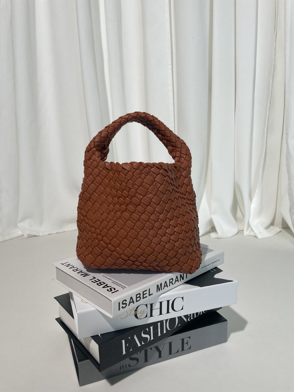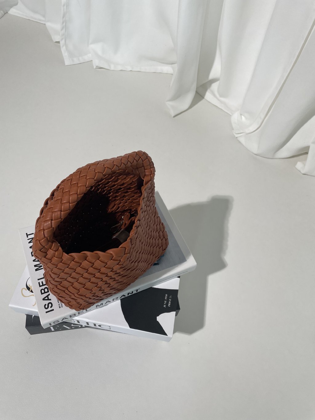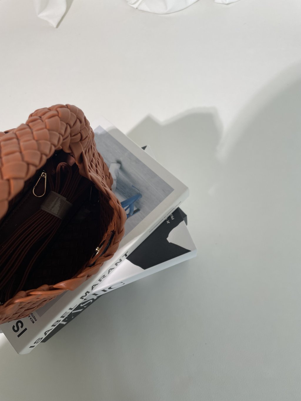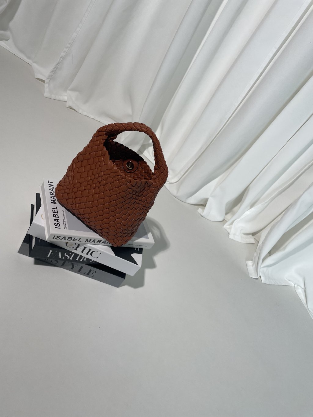 Malá kabelka z proplétané koženky, zapínání na magnet, mírně zpevněné dno. Součástí je tenký odnímatelný popruh s karabinkami ve zlaté barvě.