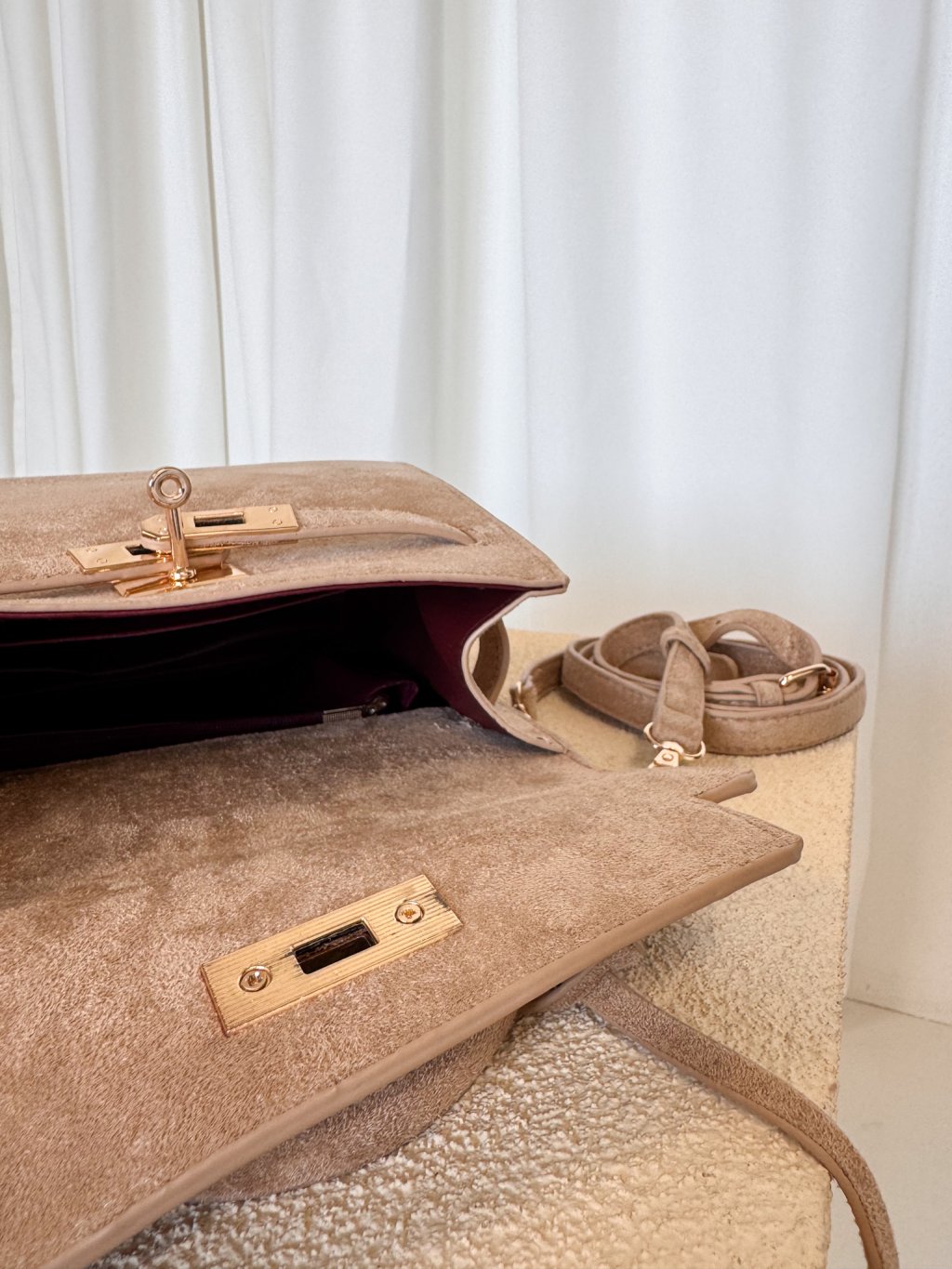 Malá semišová kabelka, zapínání na zámeček - zlatý kov, součástí je popruh. Uvnitř kapsa, dále kapsička na zip.