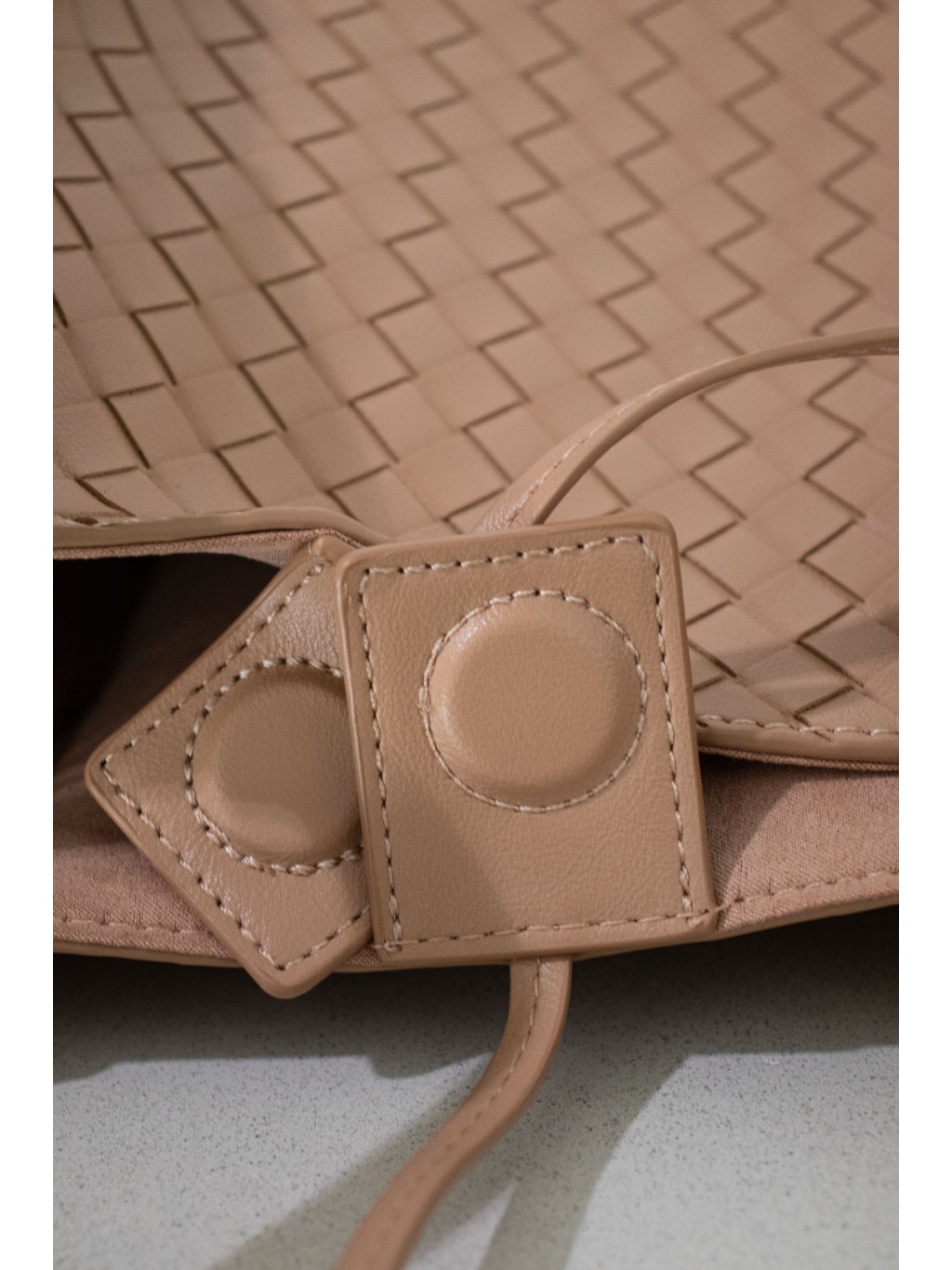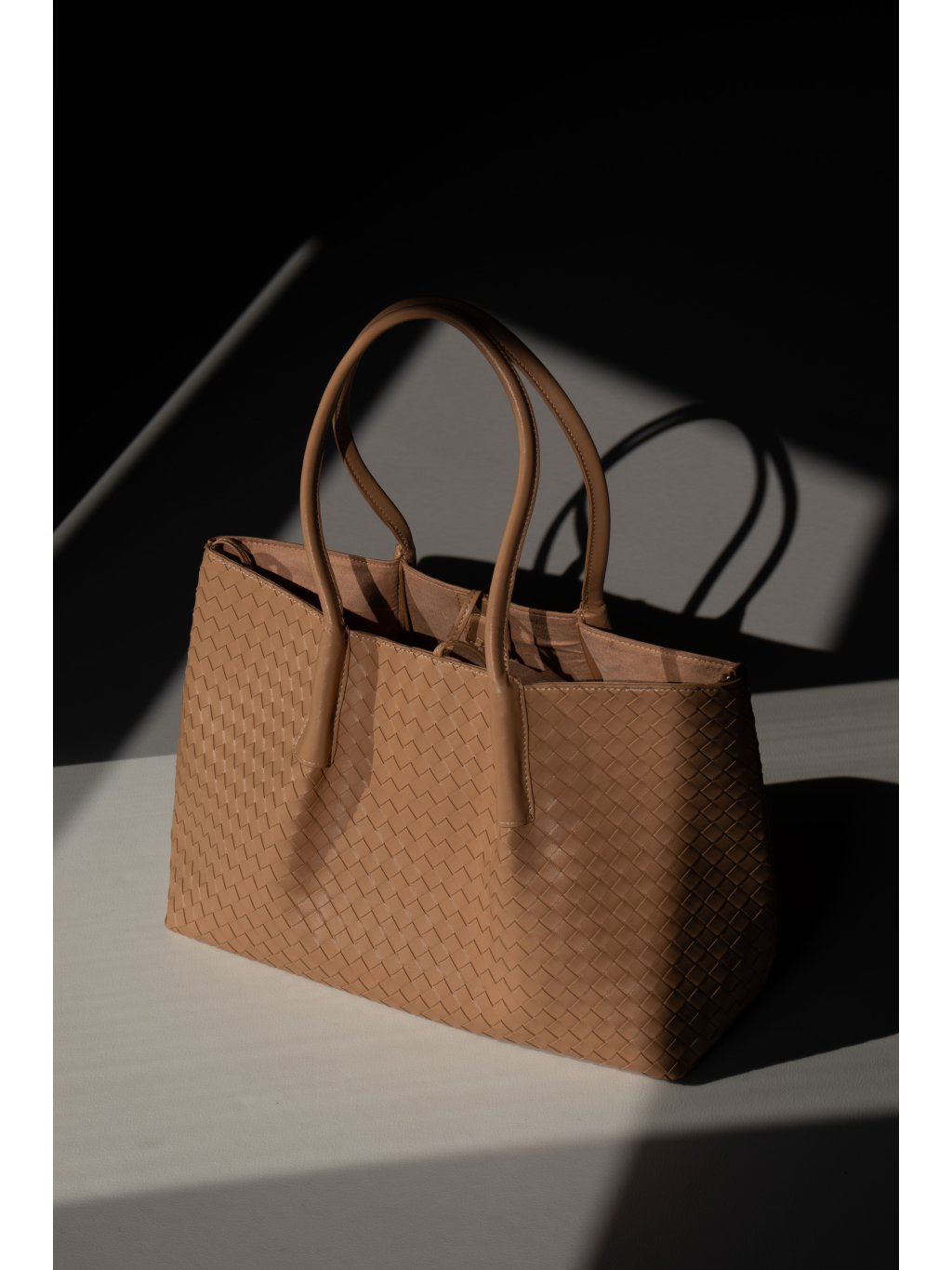Proplétaná kožená kabelka obdélníkového tvaru, prostorná, pevné dno, dvě ucha, zapínání na magnet a kožené šňůrky. Uvnitř samostatná kožená taštička na zip o rozměrech 25,5 x 15,5 cm.