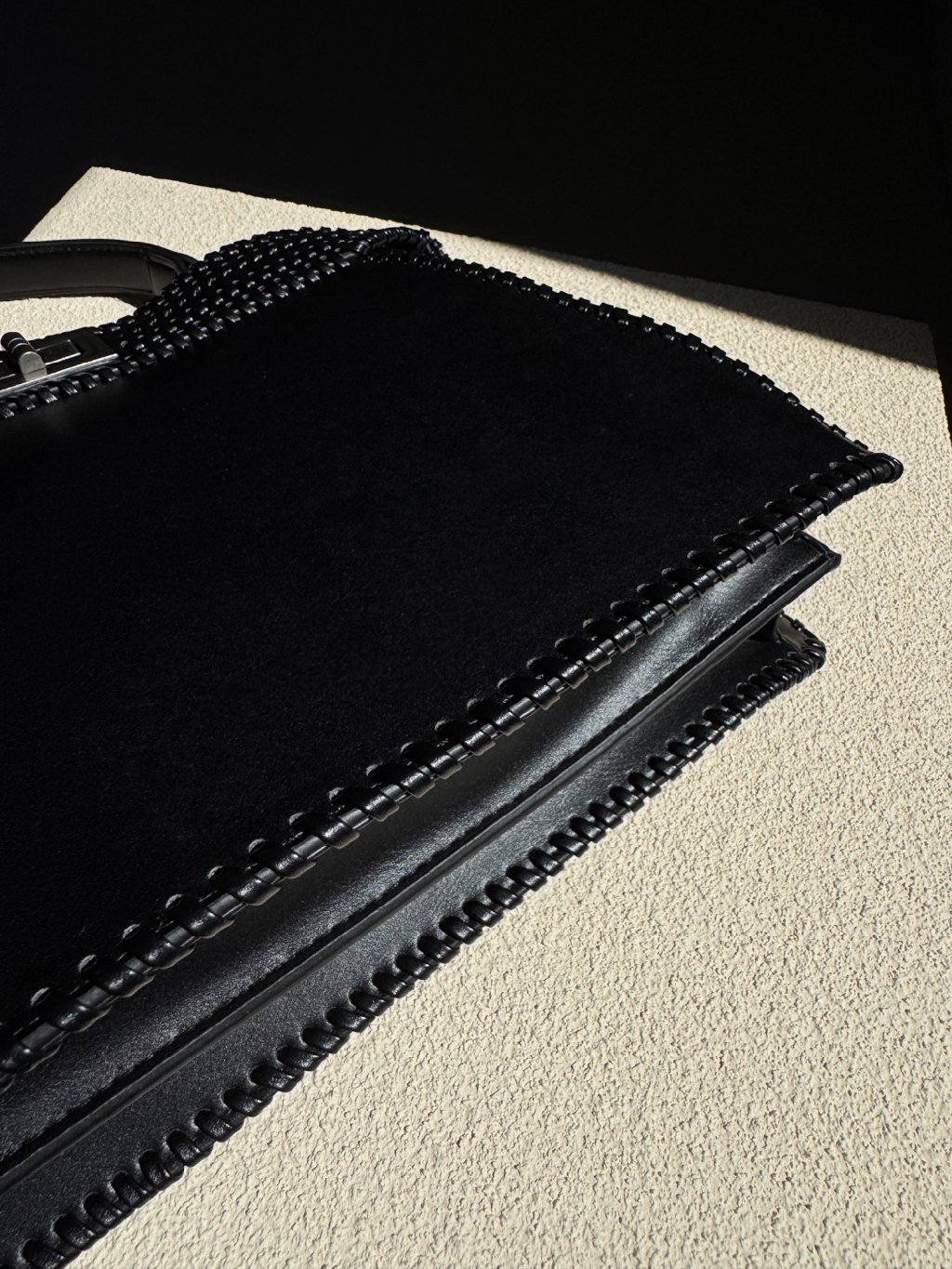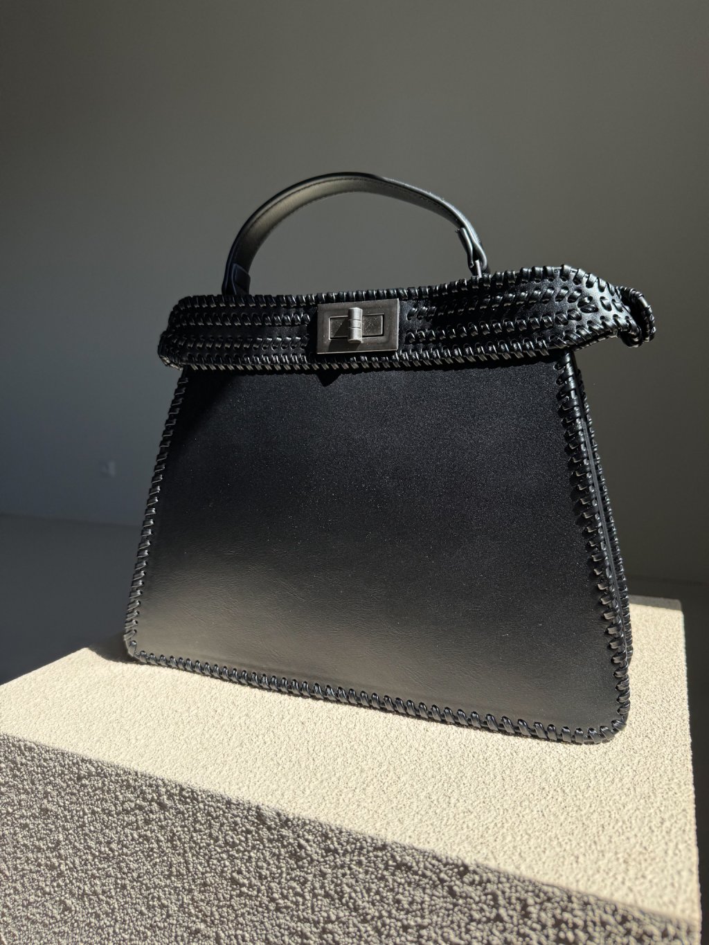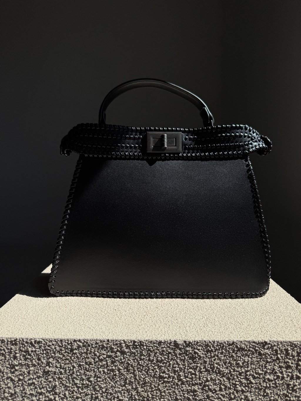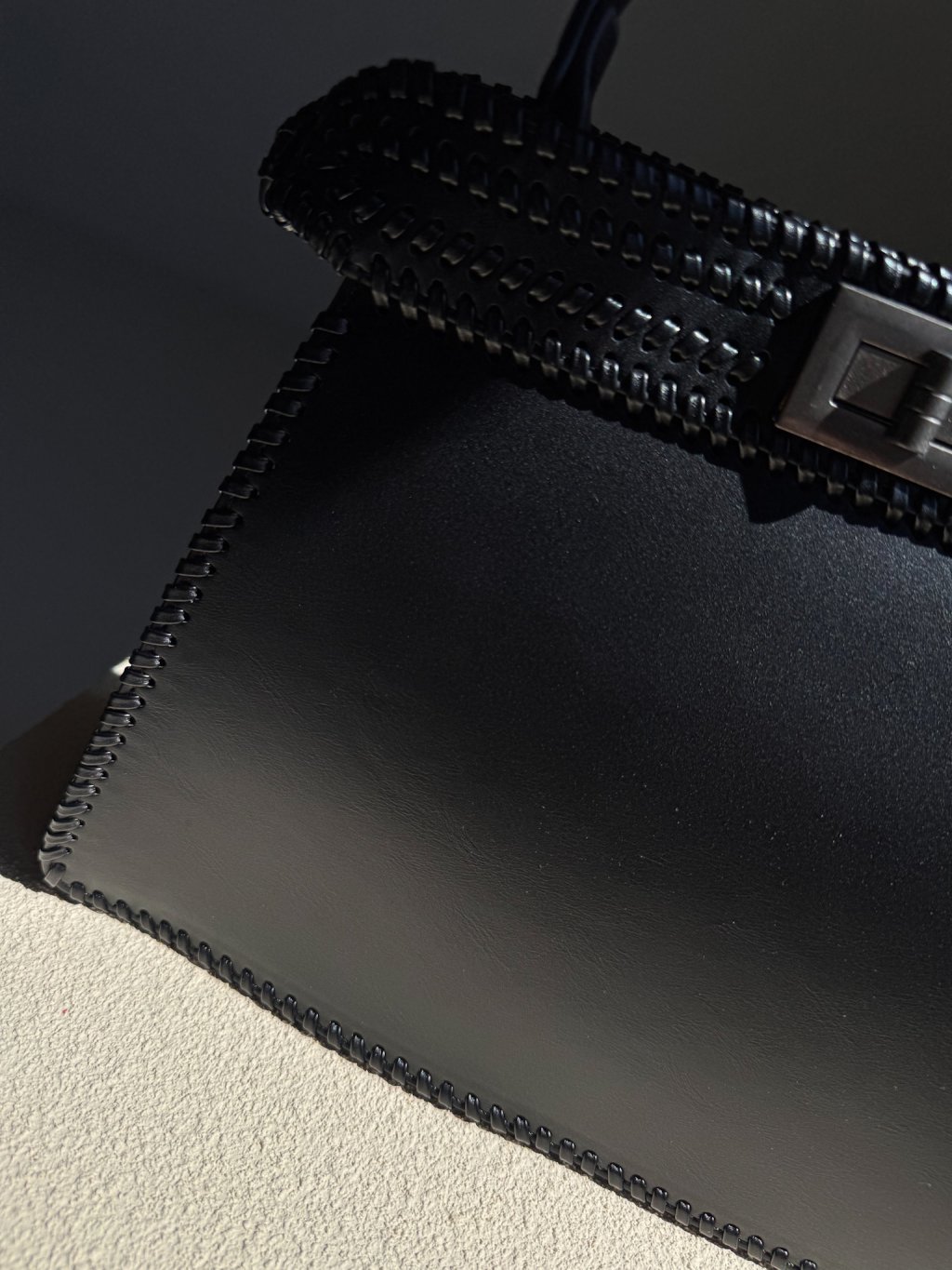 Koženková kabelka, hranatý tvar, výrazné prošívání, široké zpevněné dno. Kabelka je rozdělena pevnou přepážkou, otevírá se separátně každá strana zvlášť, uvnitř je polstrování, součástí je popruh cross body.