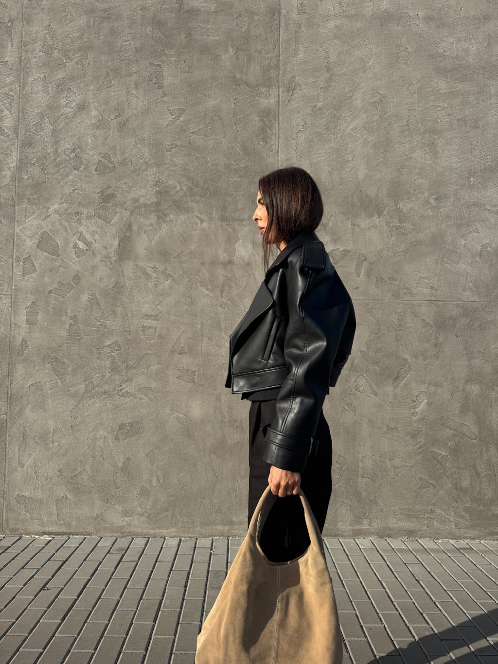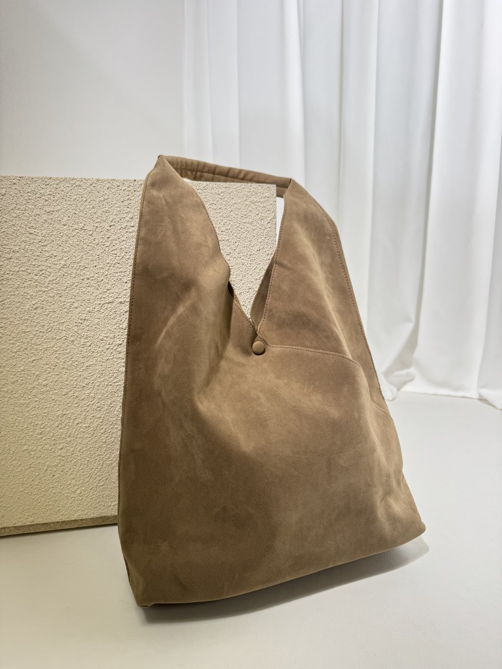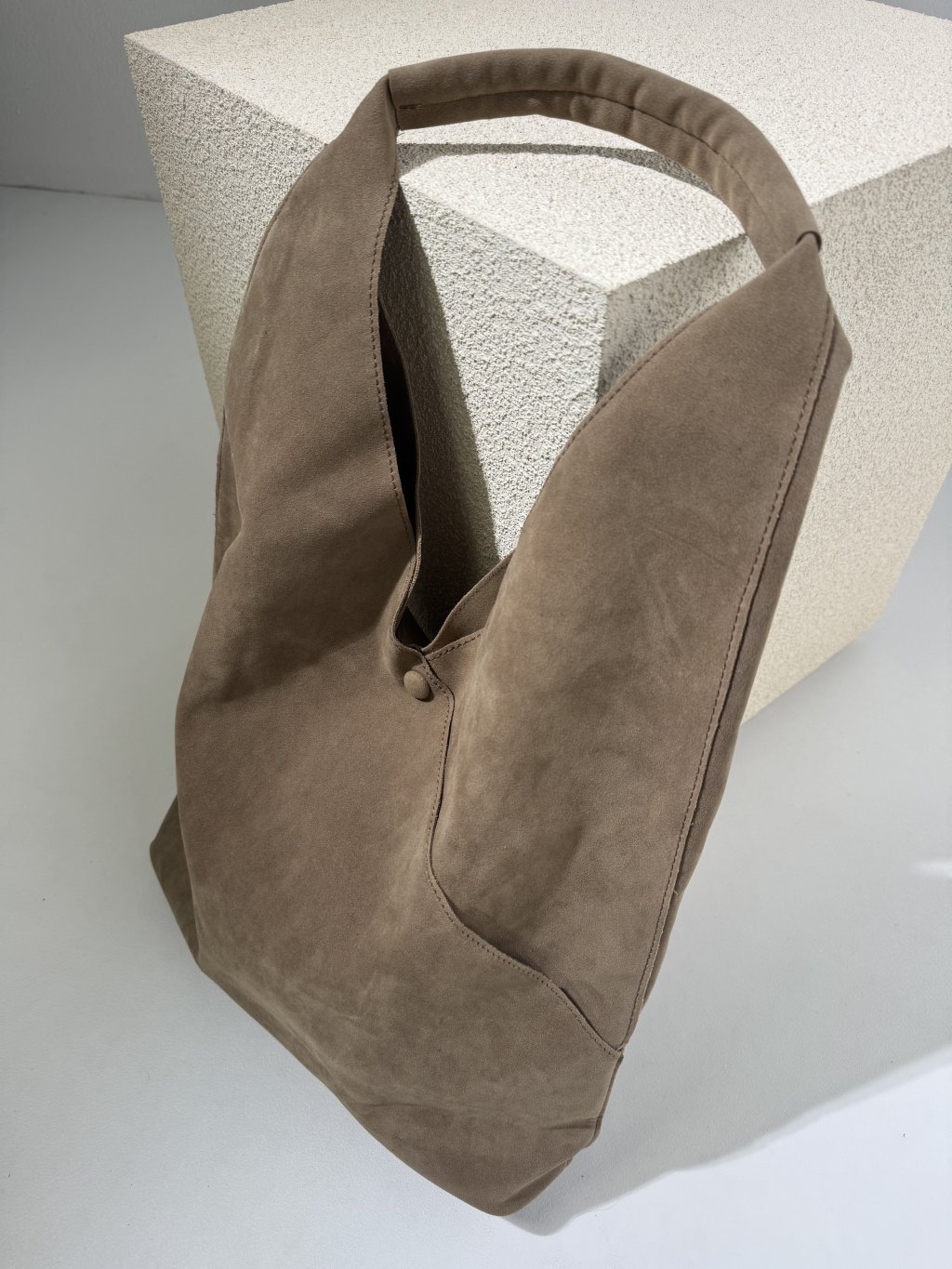 Semišový sack, hluboký, zapínání na magnet, jedno ucho. Uvnitř semišová taštička na zip 30x22, dále úzký odnímatelný popruh. Materiál je pevnější, drží tvar.