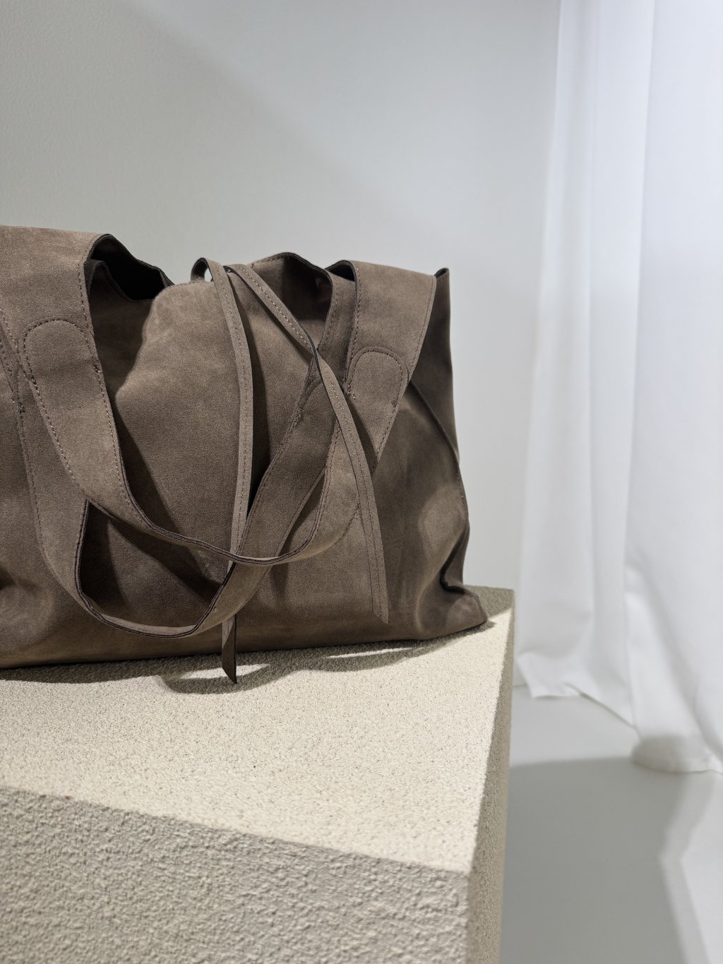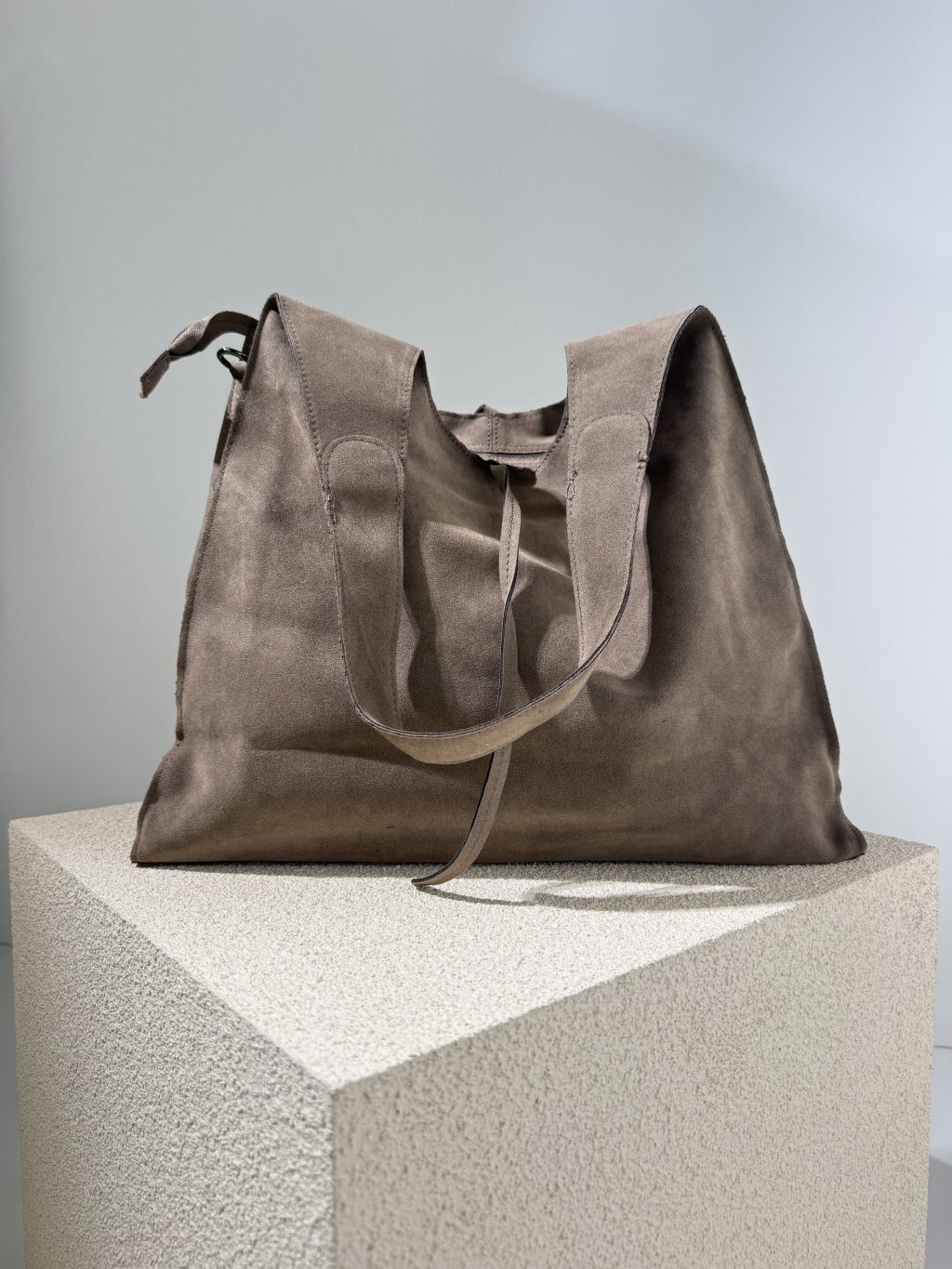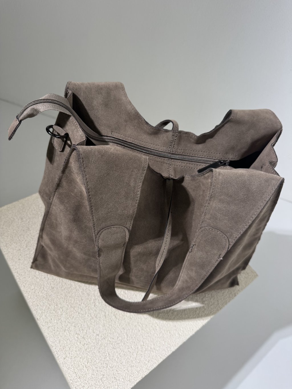 Semišový sack, hluboký, zapínání na zip a šňůrky, dvě ucha, pevné dno. Uvnitř semišová taštička na zip 31x22 cm, dále úzký odnímatelný popruh. Materiál je pevnější, drží tvar.