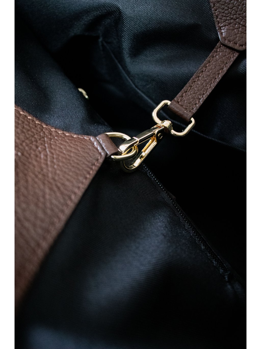 Velká prostorná kožená taška - shopper bag, dvě širší ucha, zapínání na karabinku ve zlaté barvě, uvnitř jeden otevřený prostor, jedna kapsička na zip, jedna otevřená kapsička, zpevněné dno.