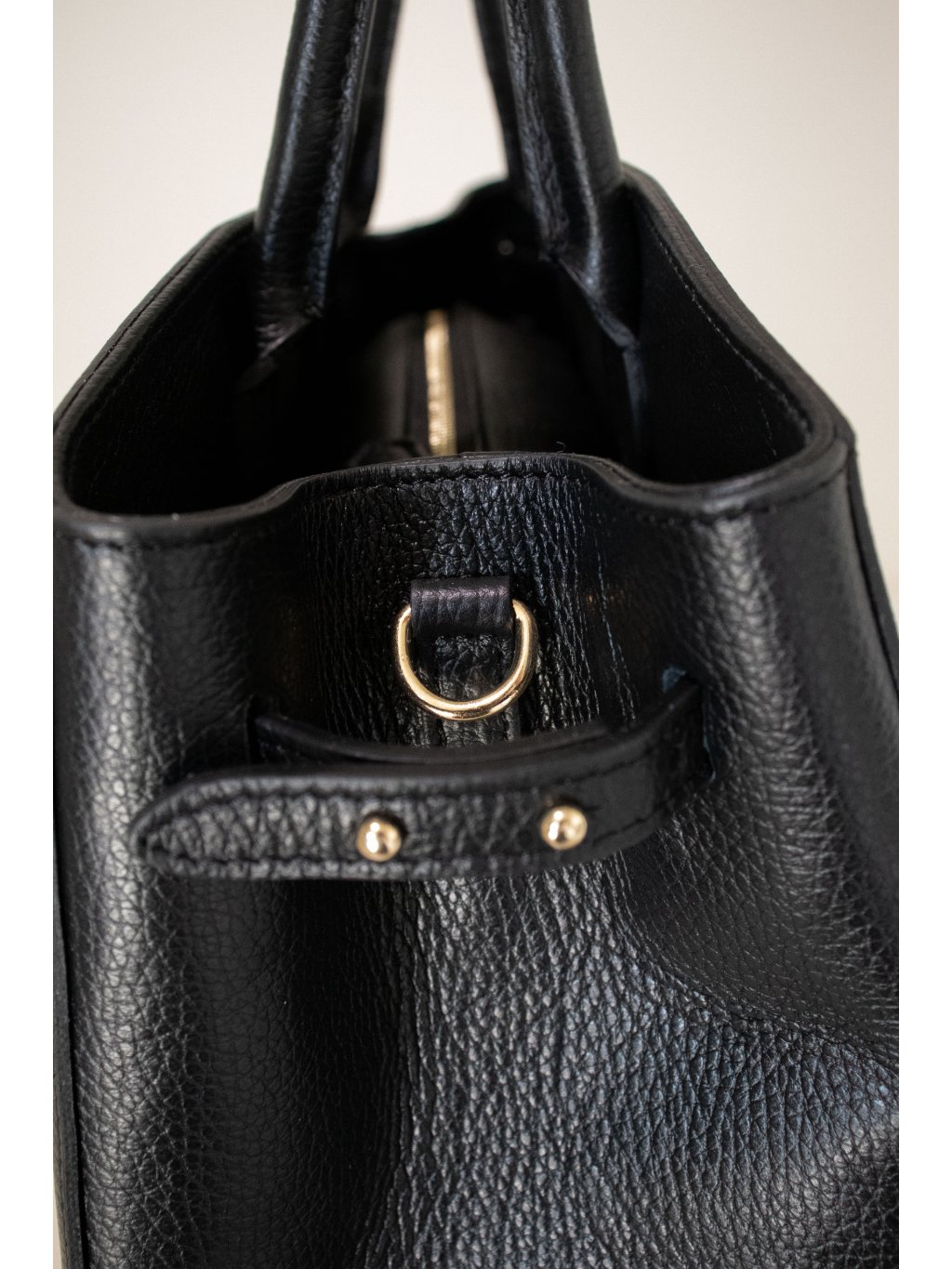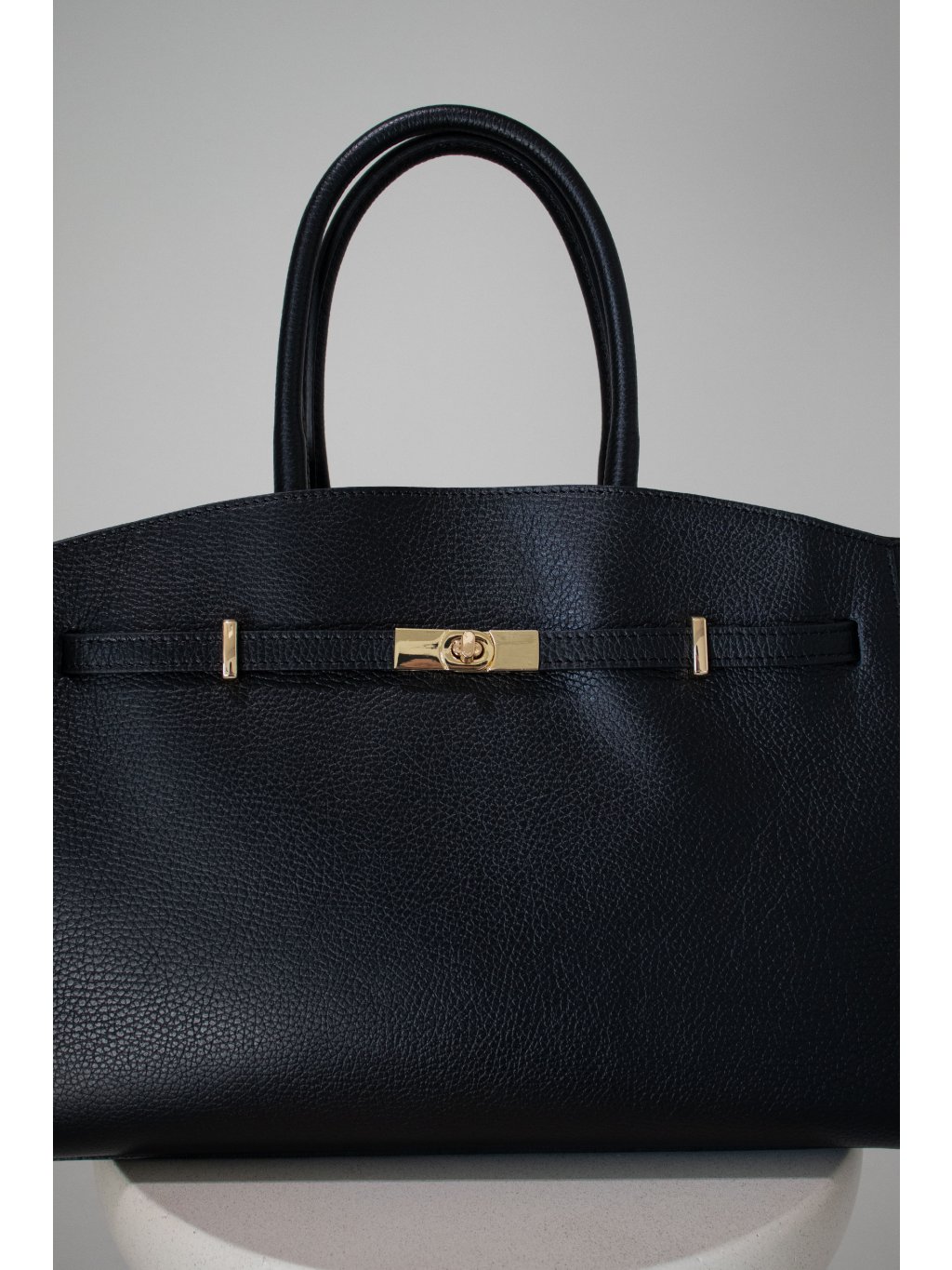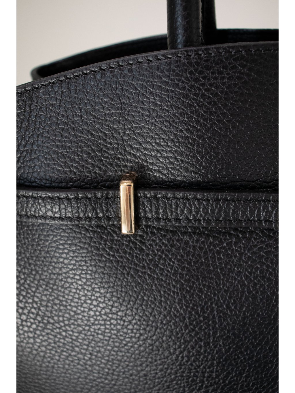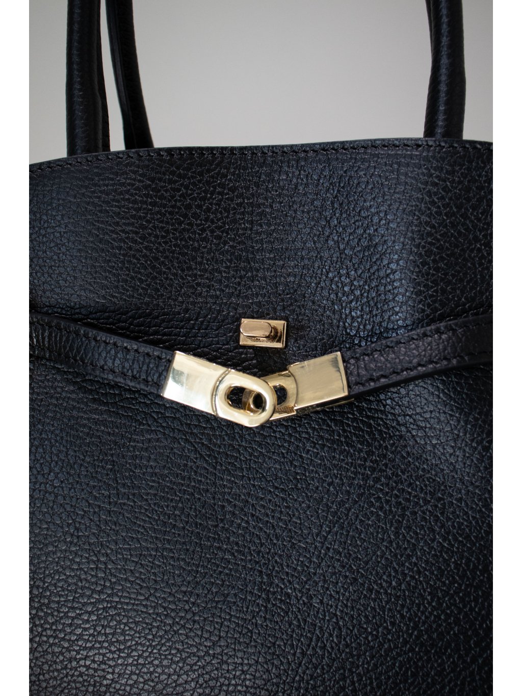 Prostorná kožená kabelka obdélníkového tvaru, pevné dno, dvě lanková ucha, vpředu ozdobný pásek s kovovými detaily ve zlaté barvě, zapínání na zip také ve zlaté barvě, uvnitř jedna kapsička na zip, jedna kapsička otevřená. Součástí je úzký odnímatelný popruh se zlatými detaily.