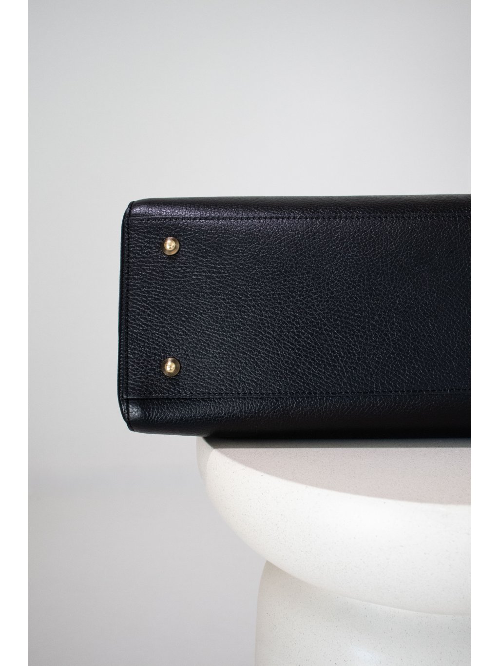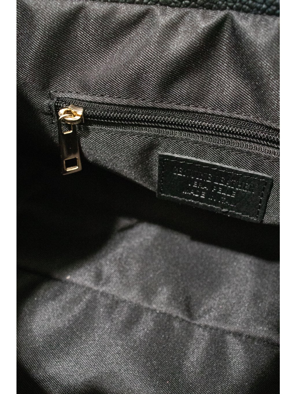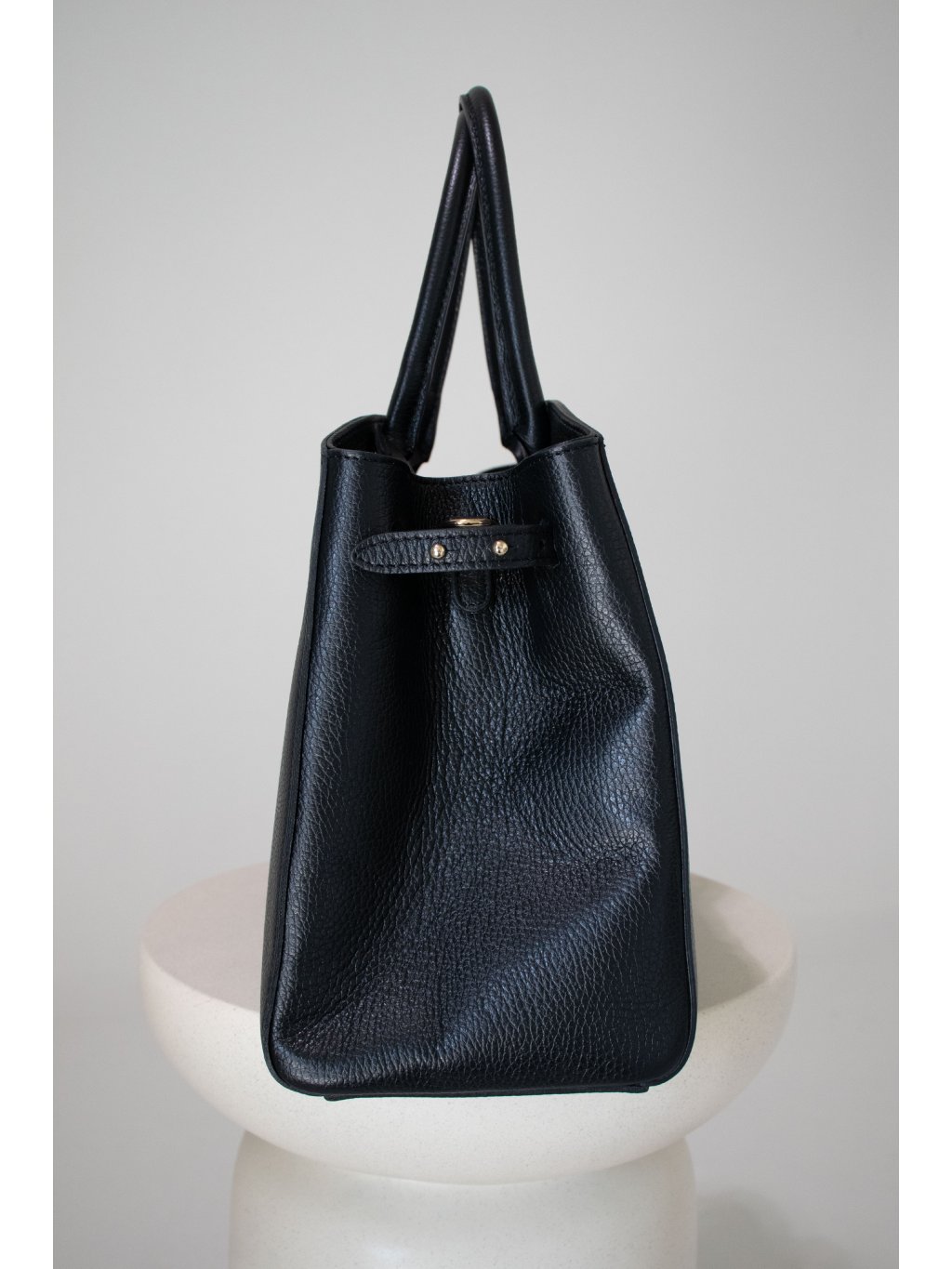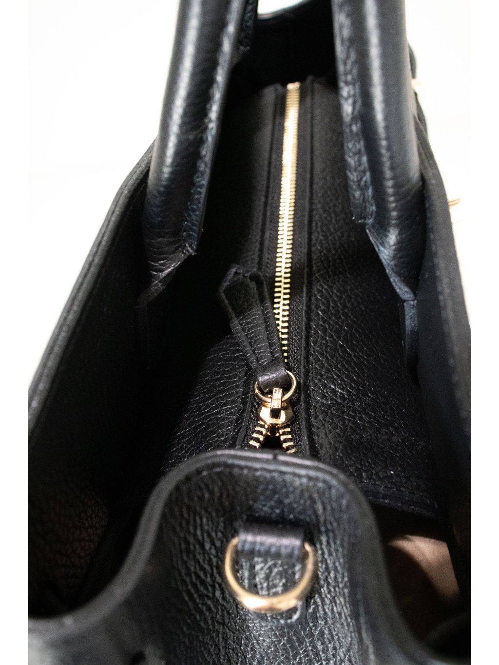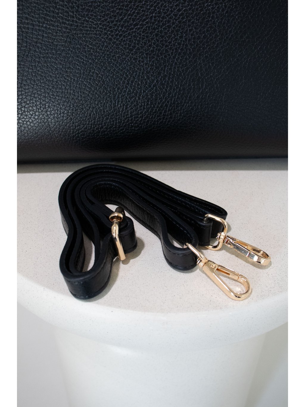 Prostorná kožená kabelka obdélníkového tvaru, pevné dno, dvě lanková ucha, vpředu ozdobný pásek s kovovými detaily ve zlaté barvě, zapínání na zip také ve zlaté barvě, uvnitř jedna kapsička na zip, jedna kapsička otevřená. Součástí je úzký odnímatelný popruh se zlatými detaily.