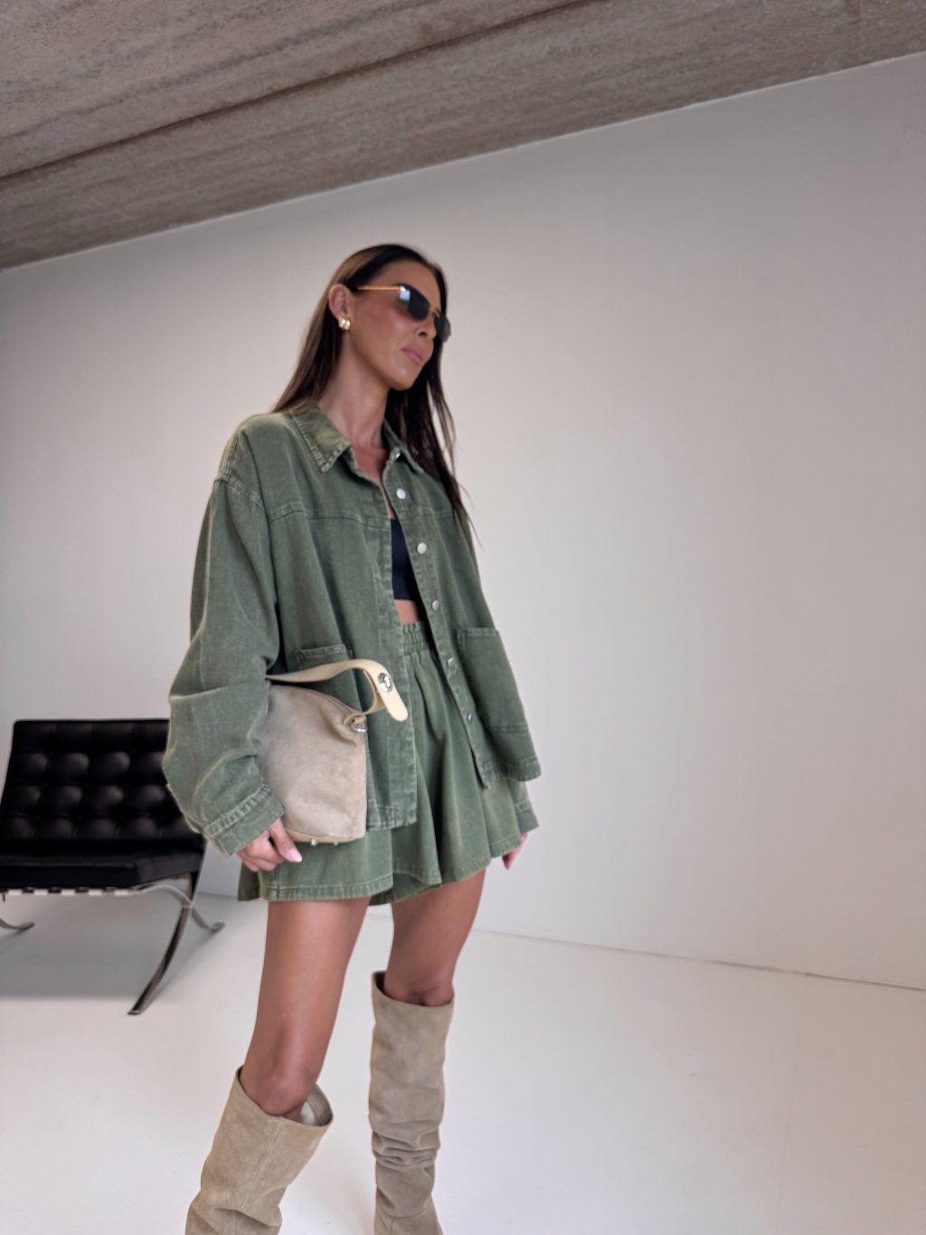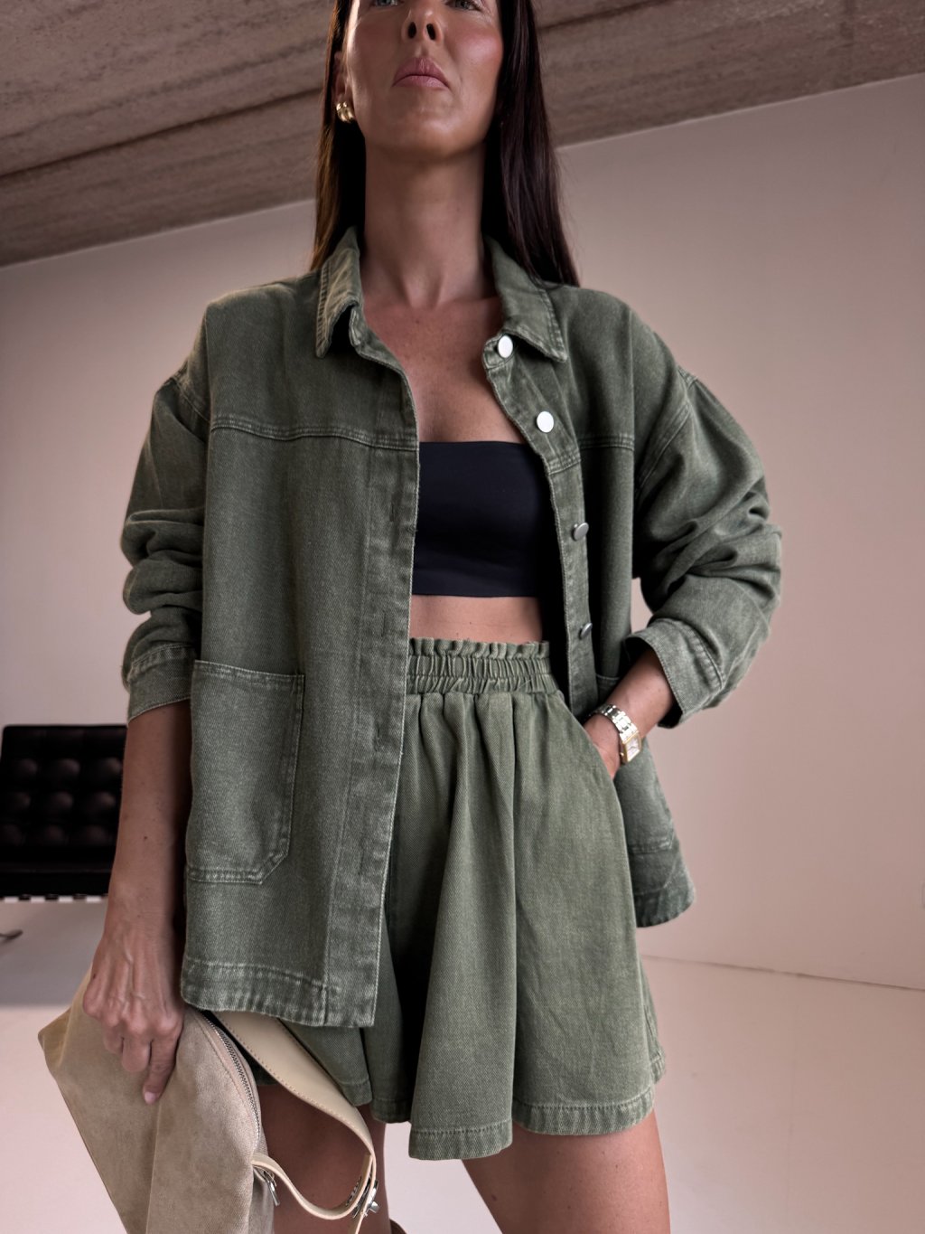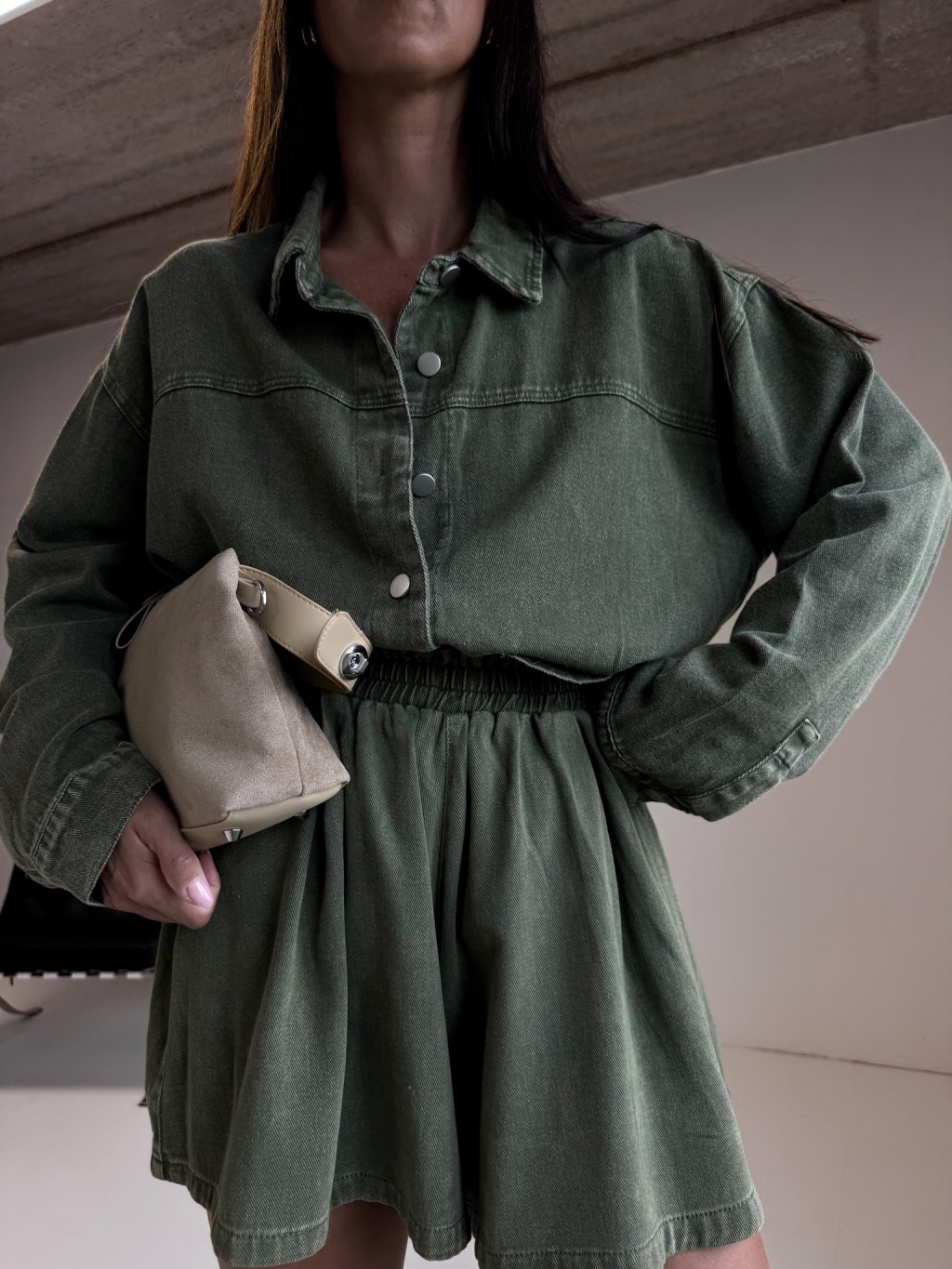 Denim šortky, volný, sukýnkový střih, v pase je guma, šortky mají boční kapsy. Materiál je měkký, poddajný.