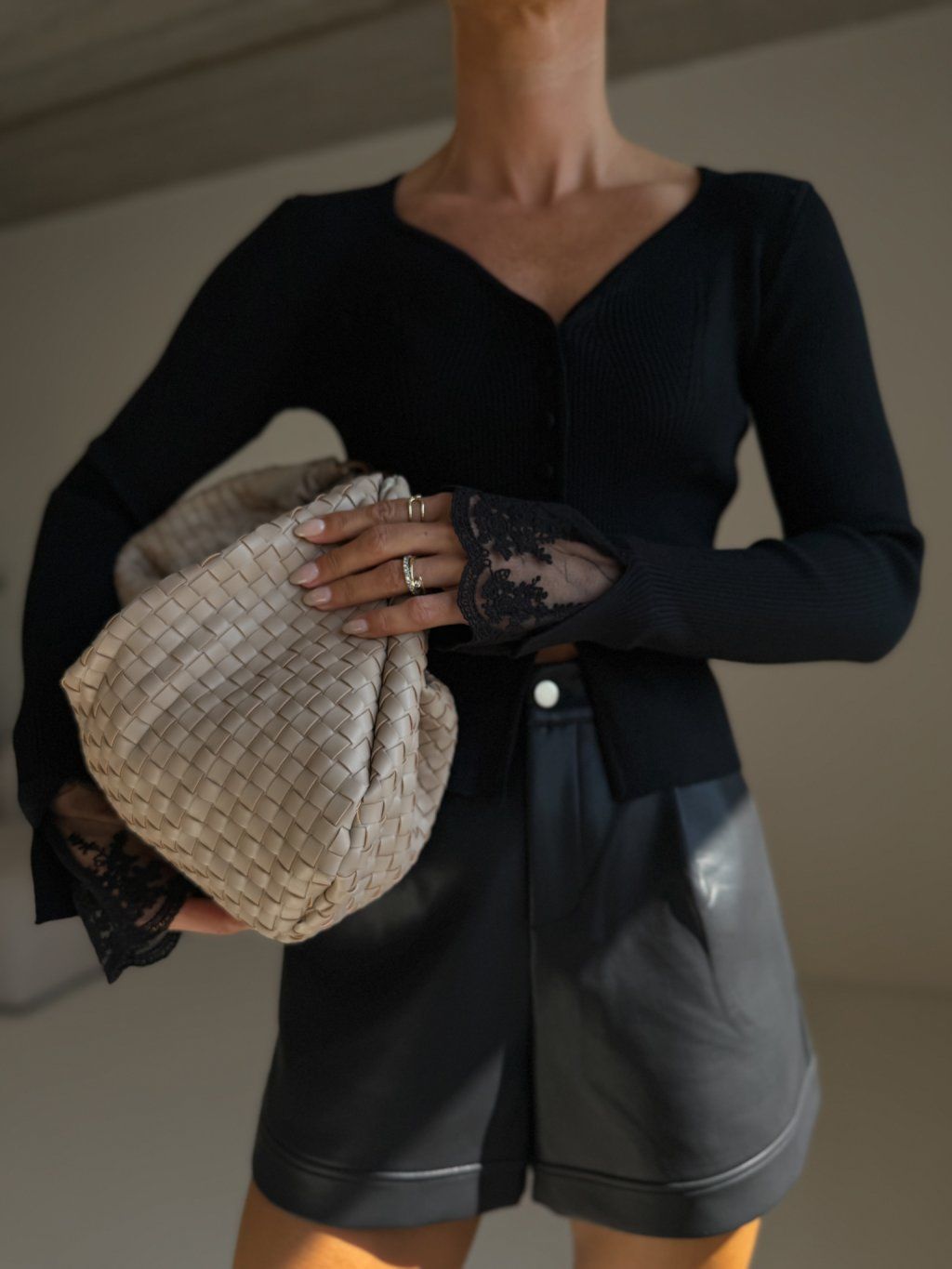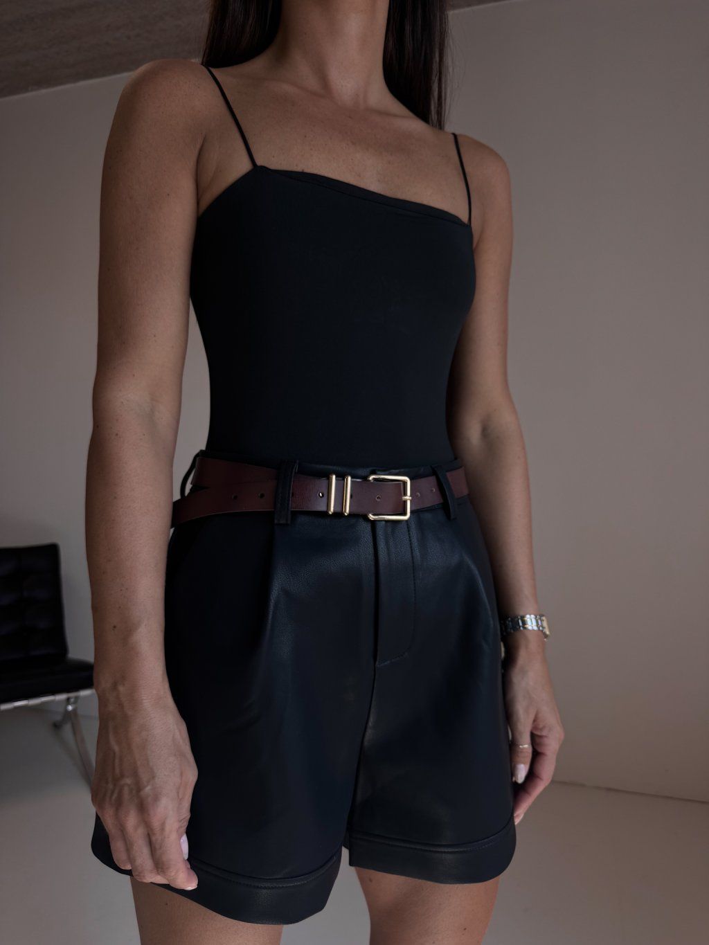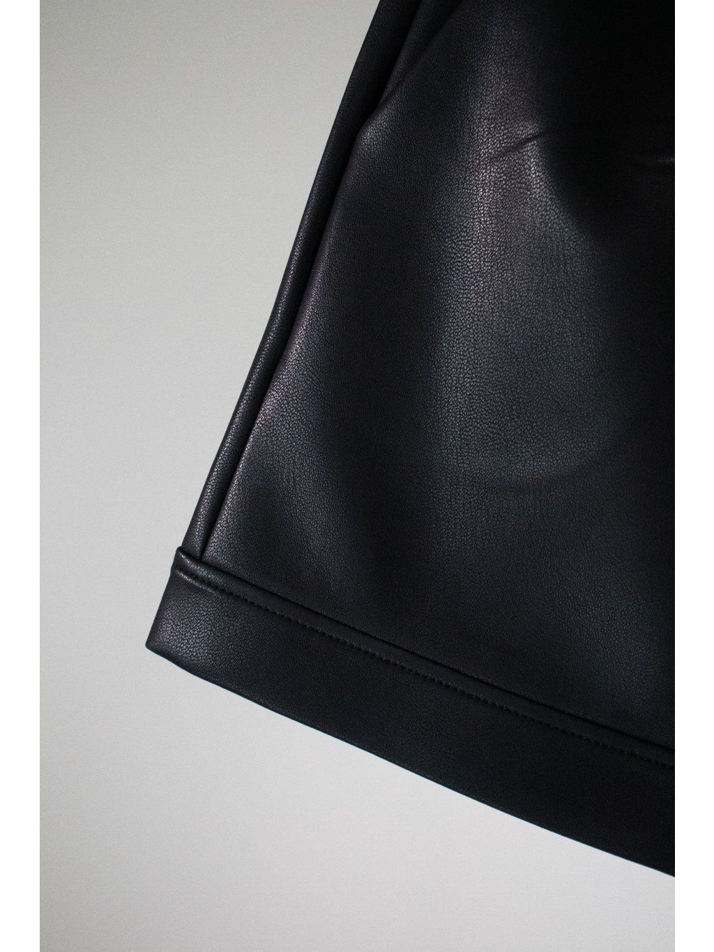 Koženkové šortky, vpředu se sklady, boční kapsy, zapínání na zip a knoflík, poutka na pásek.