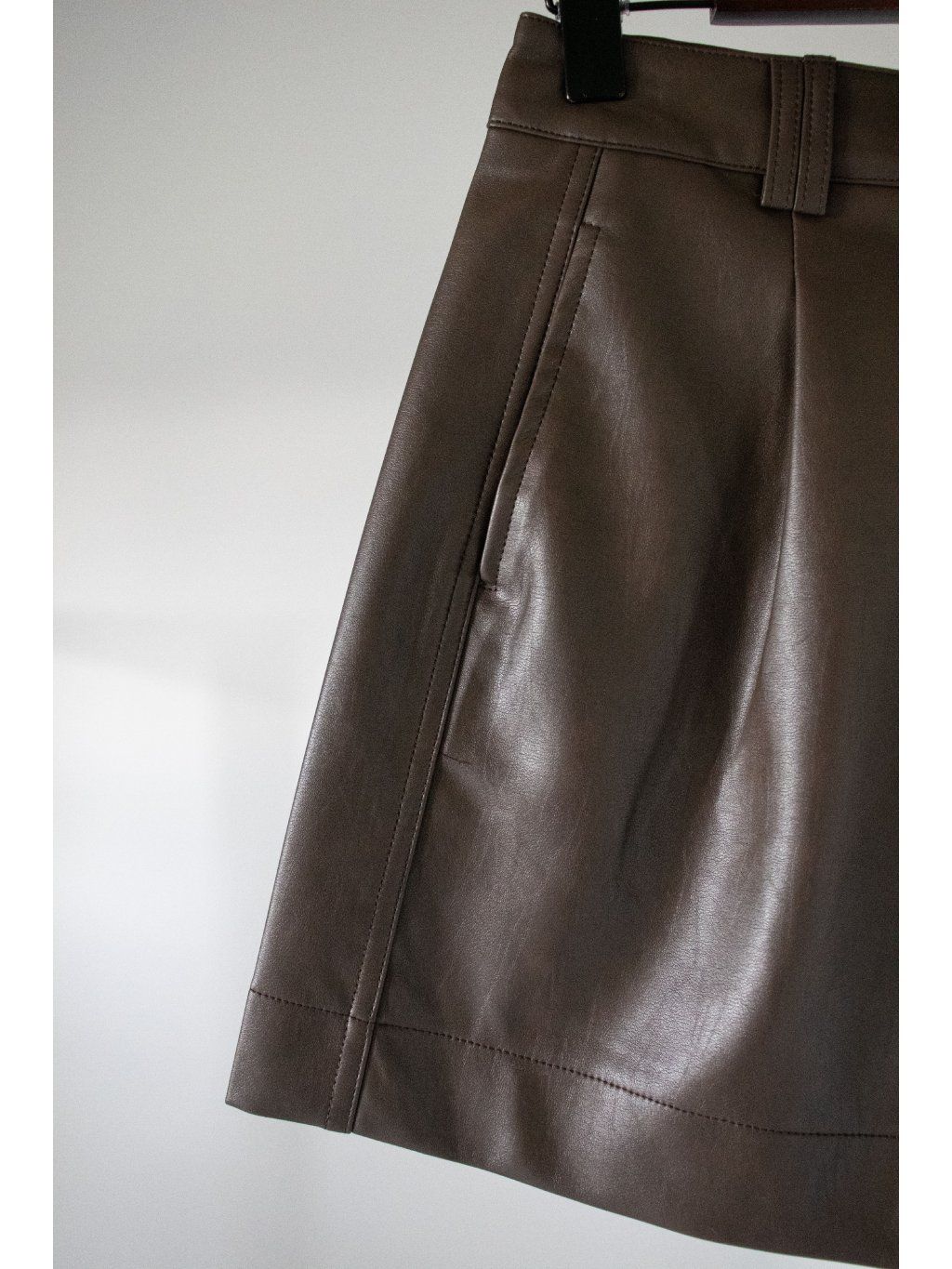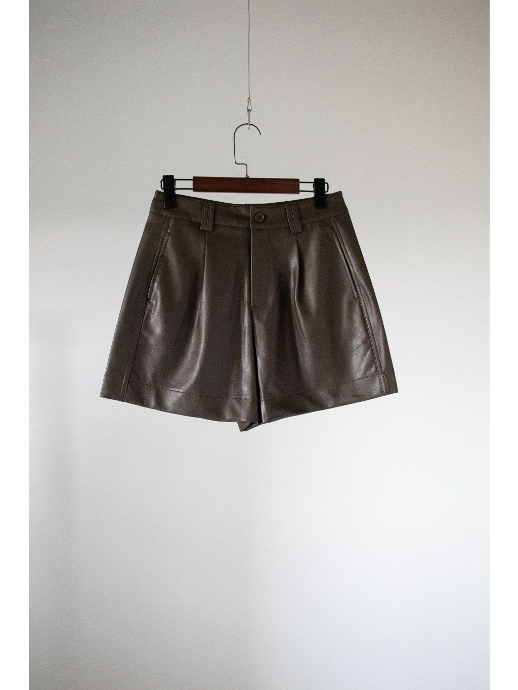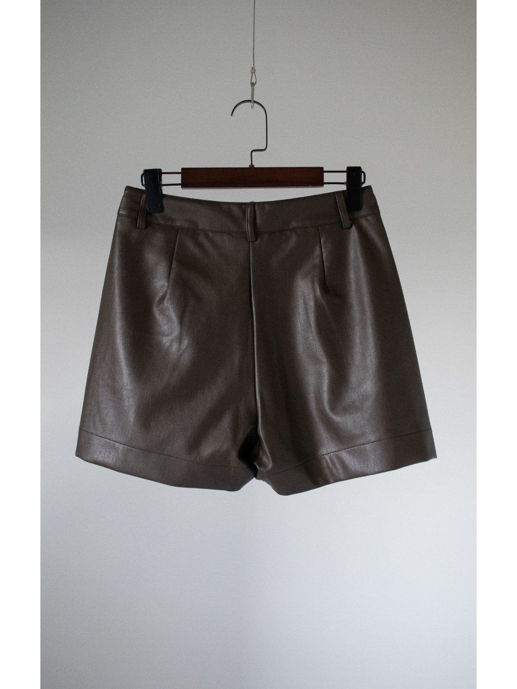 Koženkové šortky, volnější střih, středně vysoký pas, boční kapsy, vpředu sklad/nařasení, v pase poutka. Materiál je měkký, poddajný.
