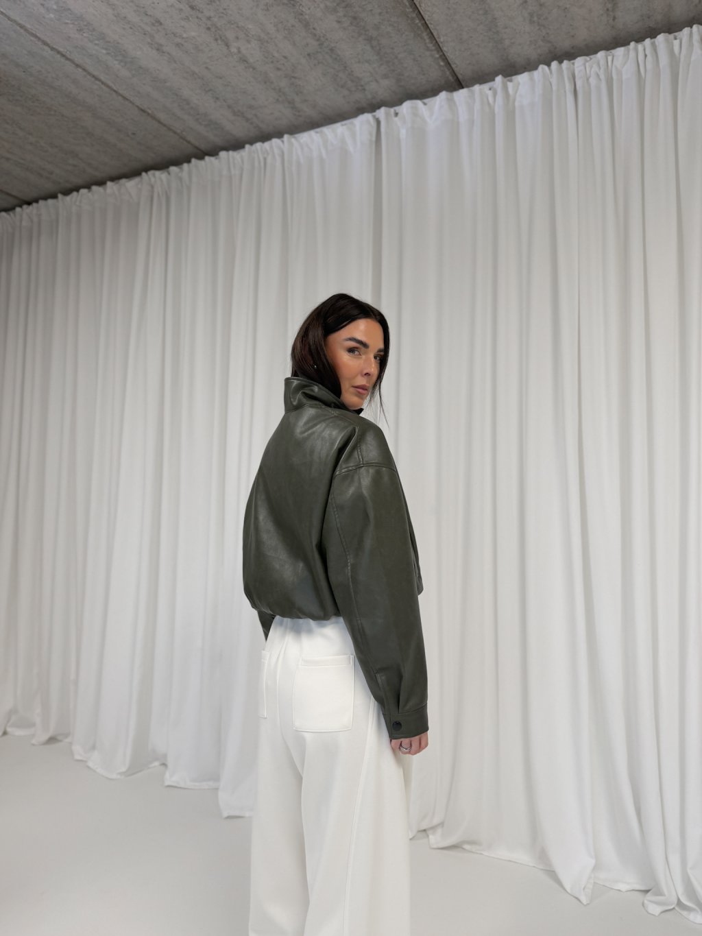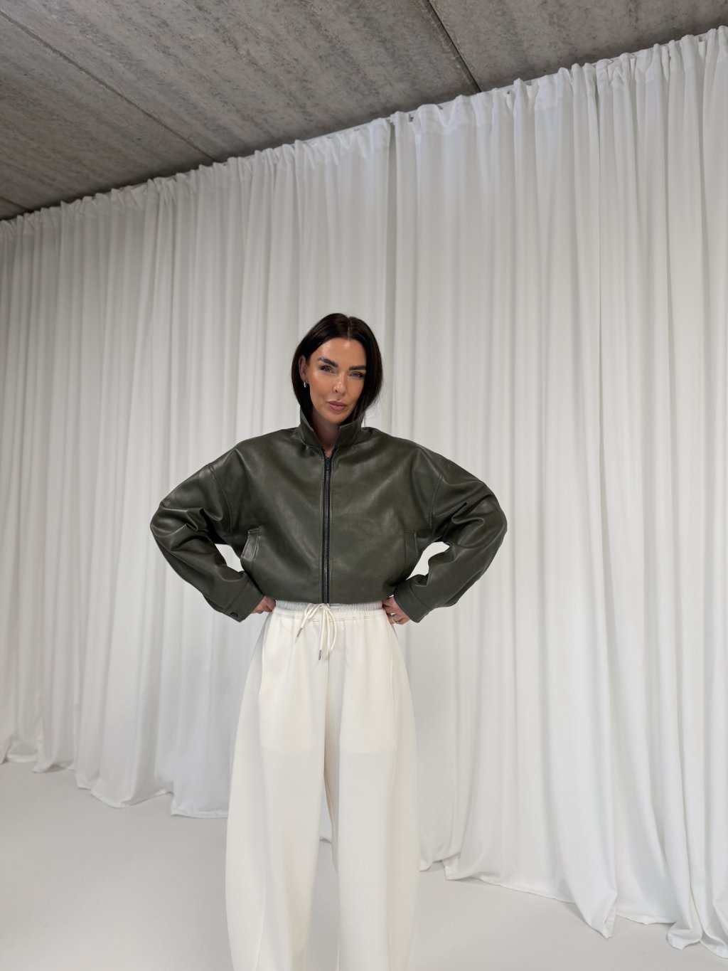 | Modelka měří 173 cm, váha 56 kg. Běžně nosí velikost S/M a oversized oblečení L. |