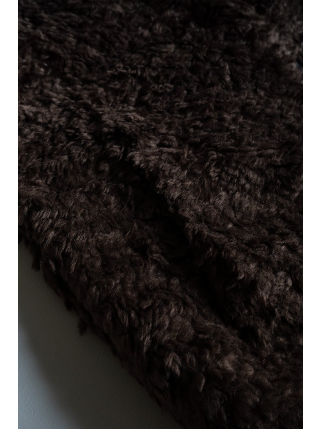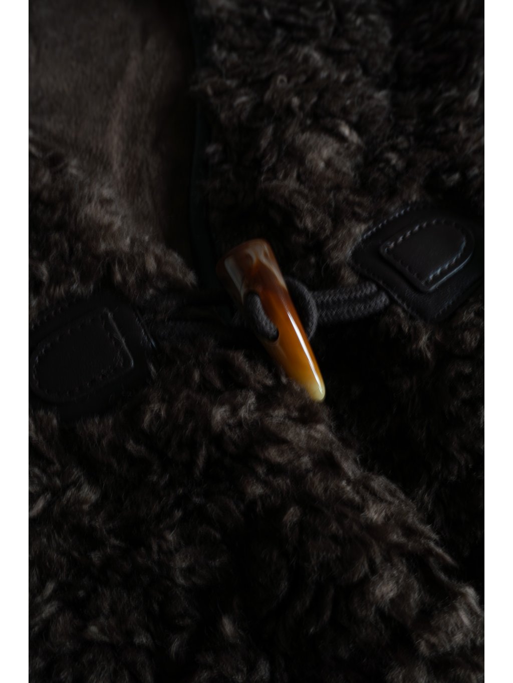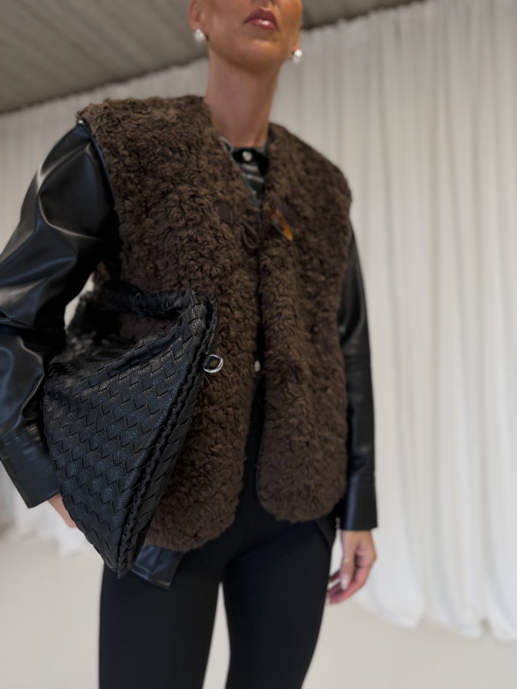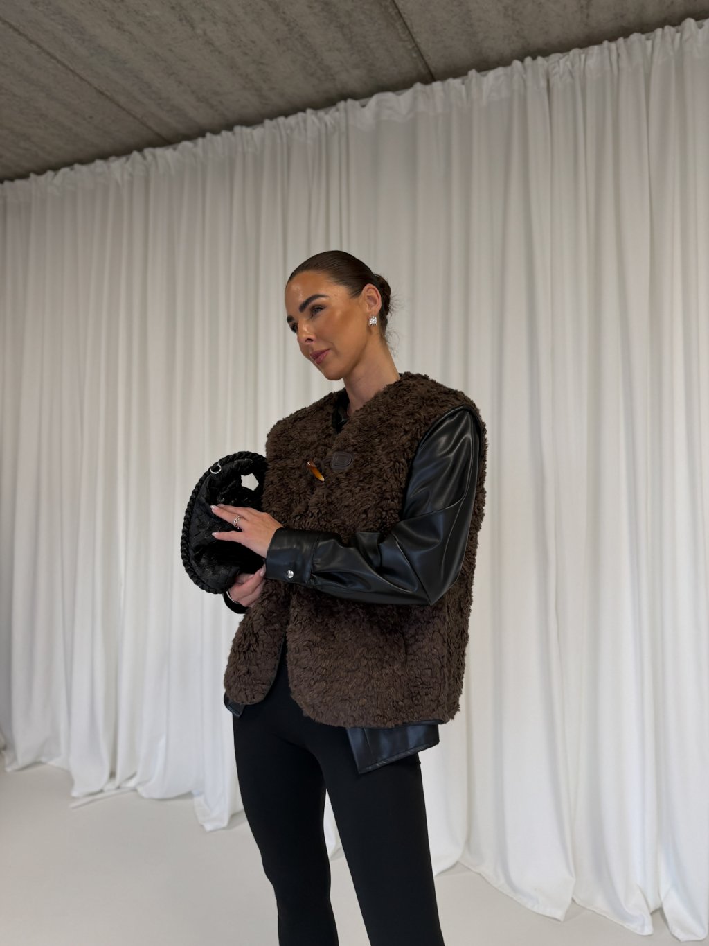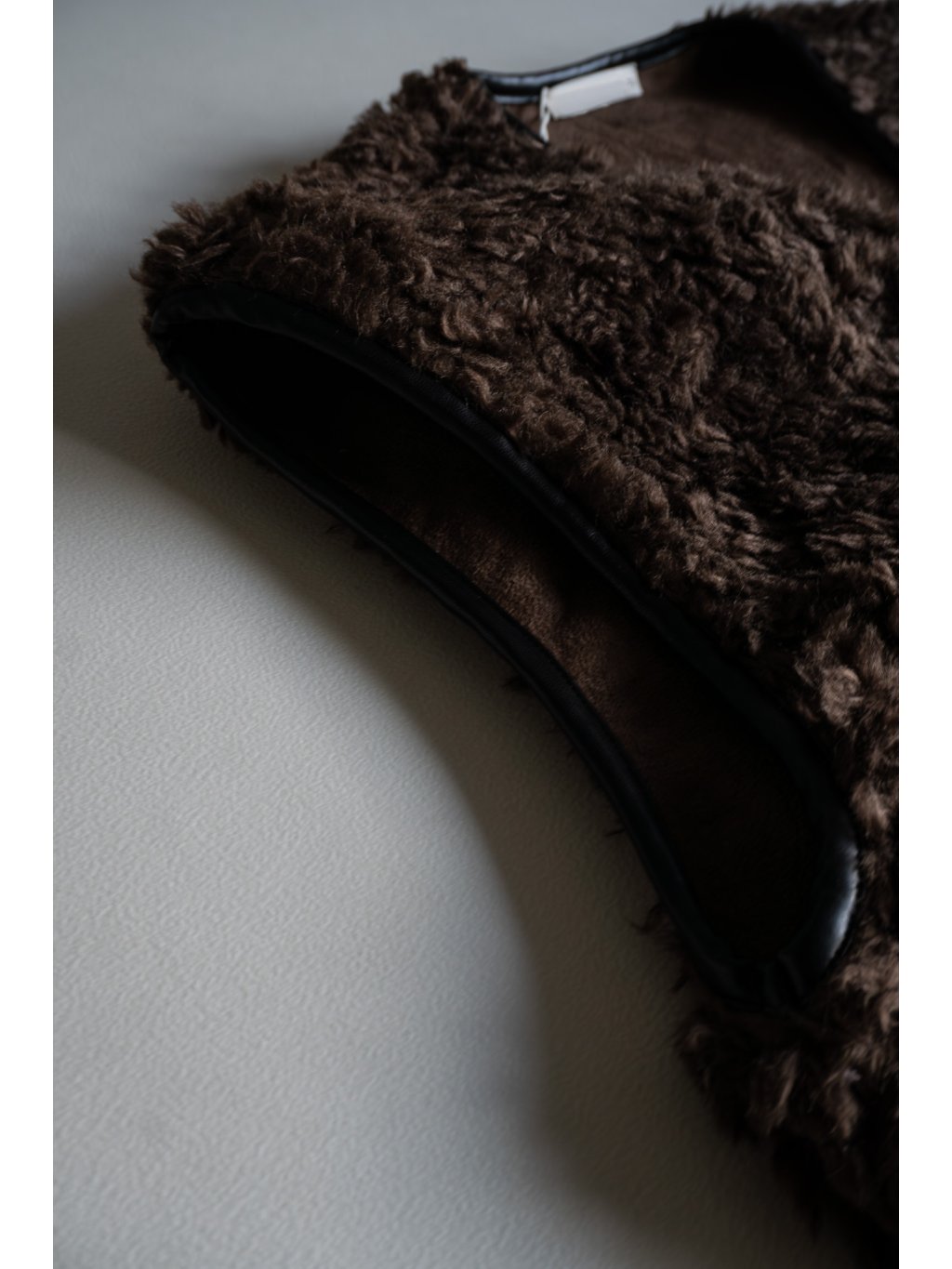 Beránková vesta s koženkovým olemováním, na prsou zapínání na výrazný knoflík, přední kapsy. Uvnitř flís.