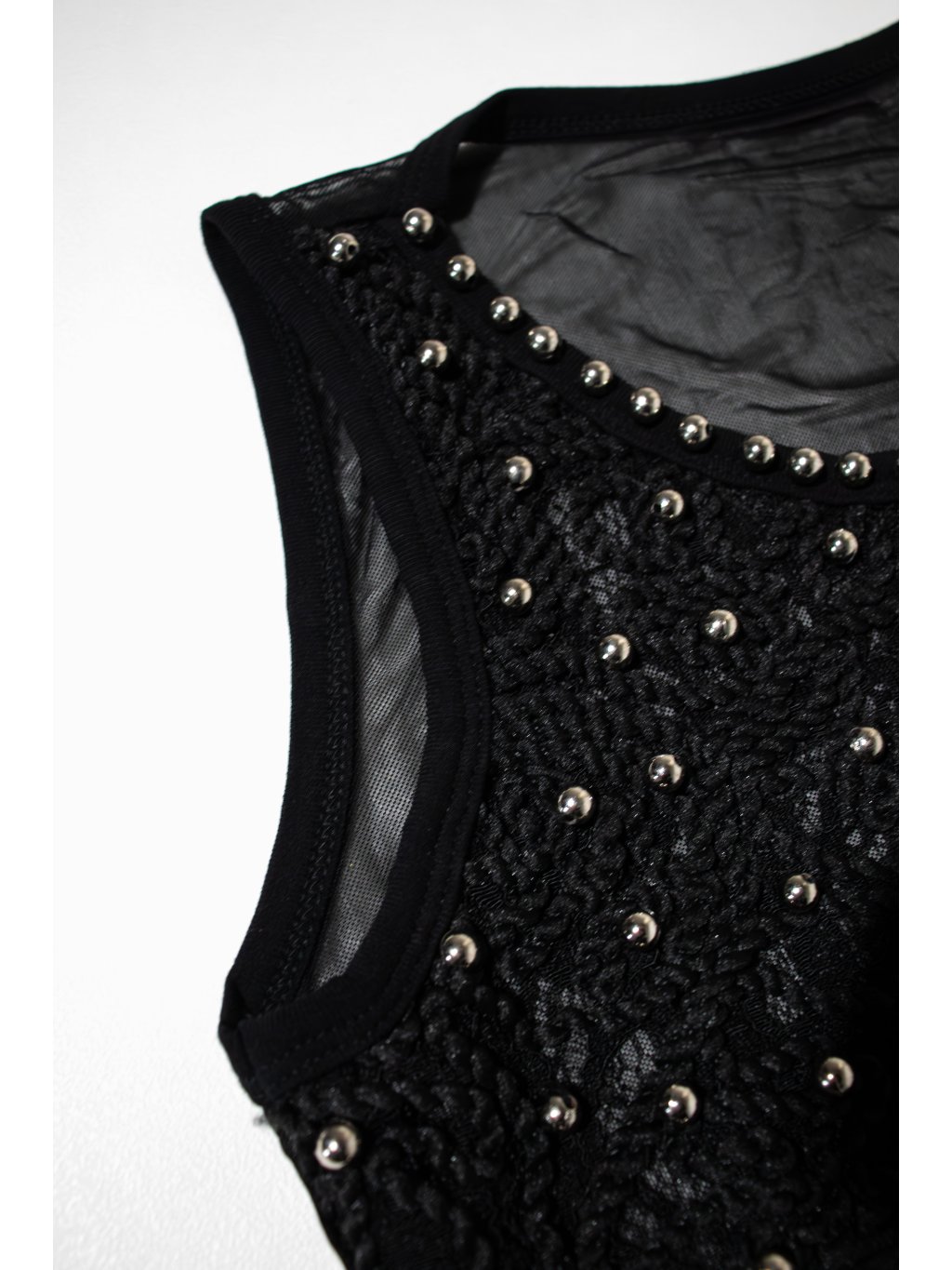 Body z pružného materiálu, širší ramínka, na přední straně stříbrné perličky na provázkovém podkladu. Zapínání na troje kovové háčky, zadní strana je průsvitná.