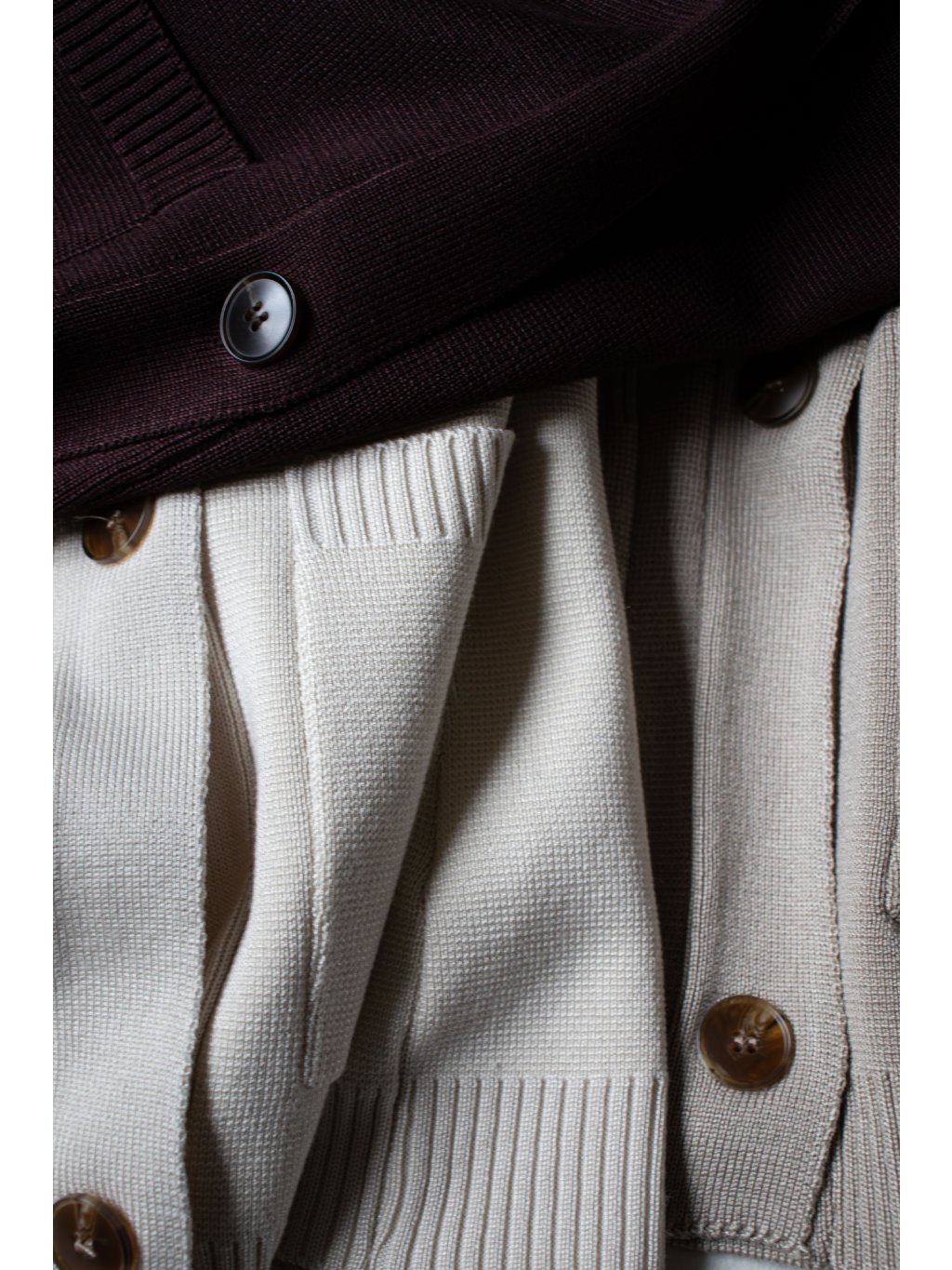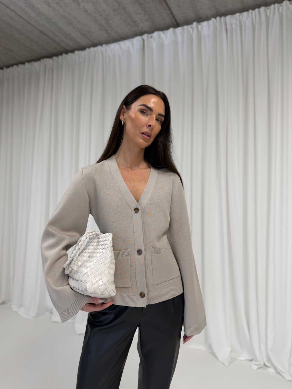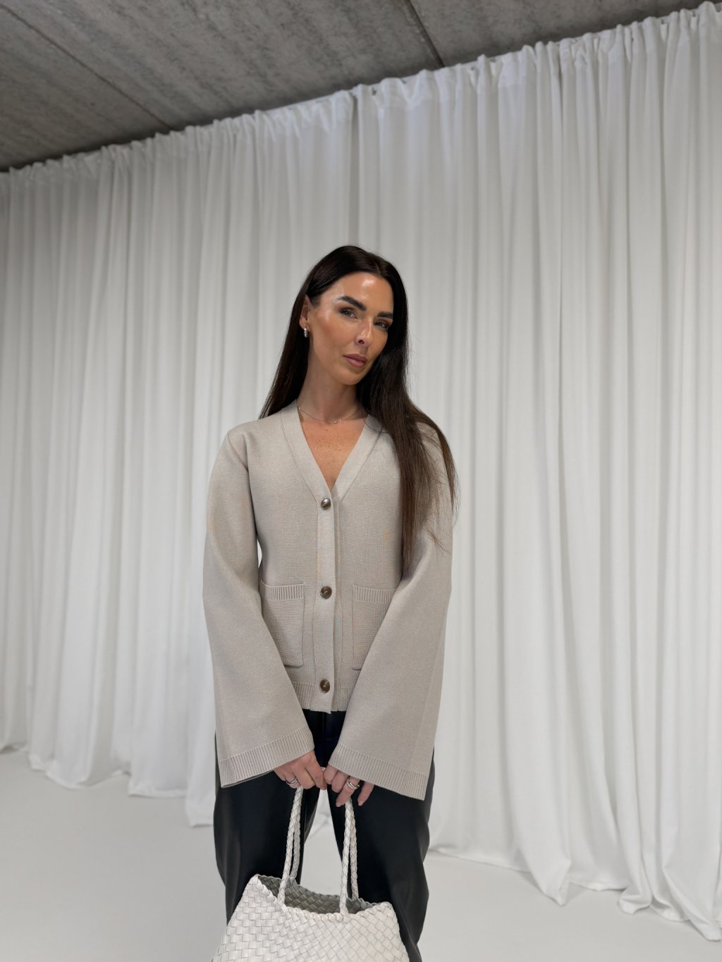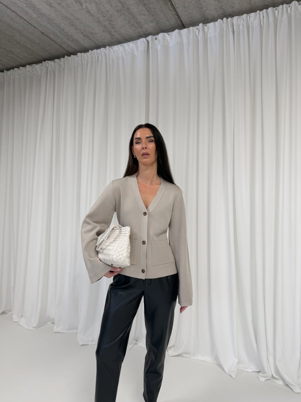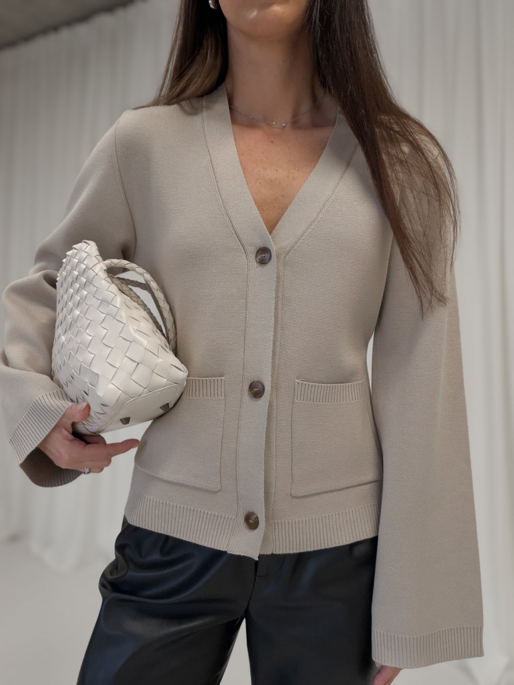 Cardigan, který je v pase zúžený, vpředu kapsy, rukávy jsou rozšířené, lemy rukávů a spodní lem je žebrovaný.