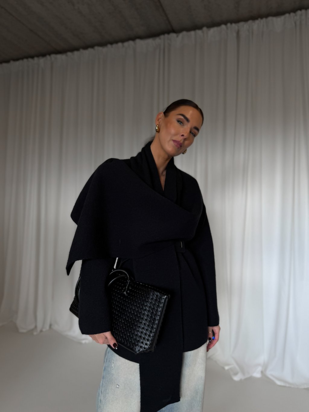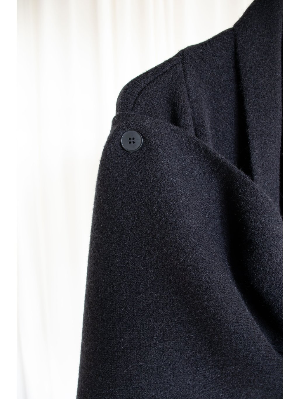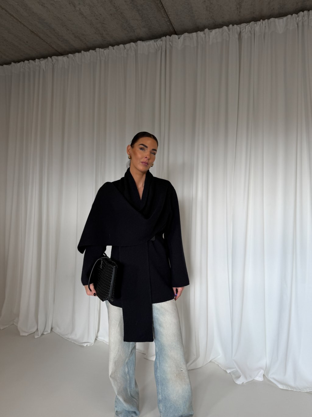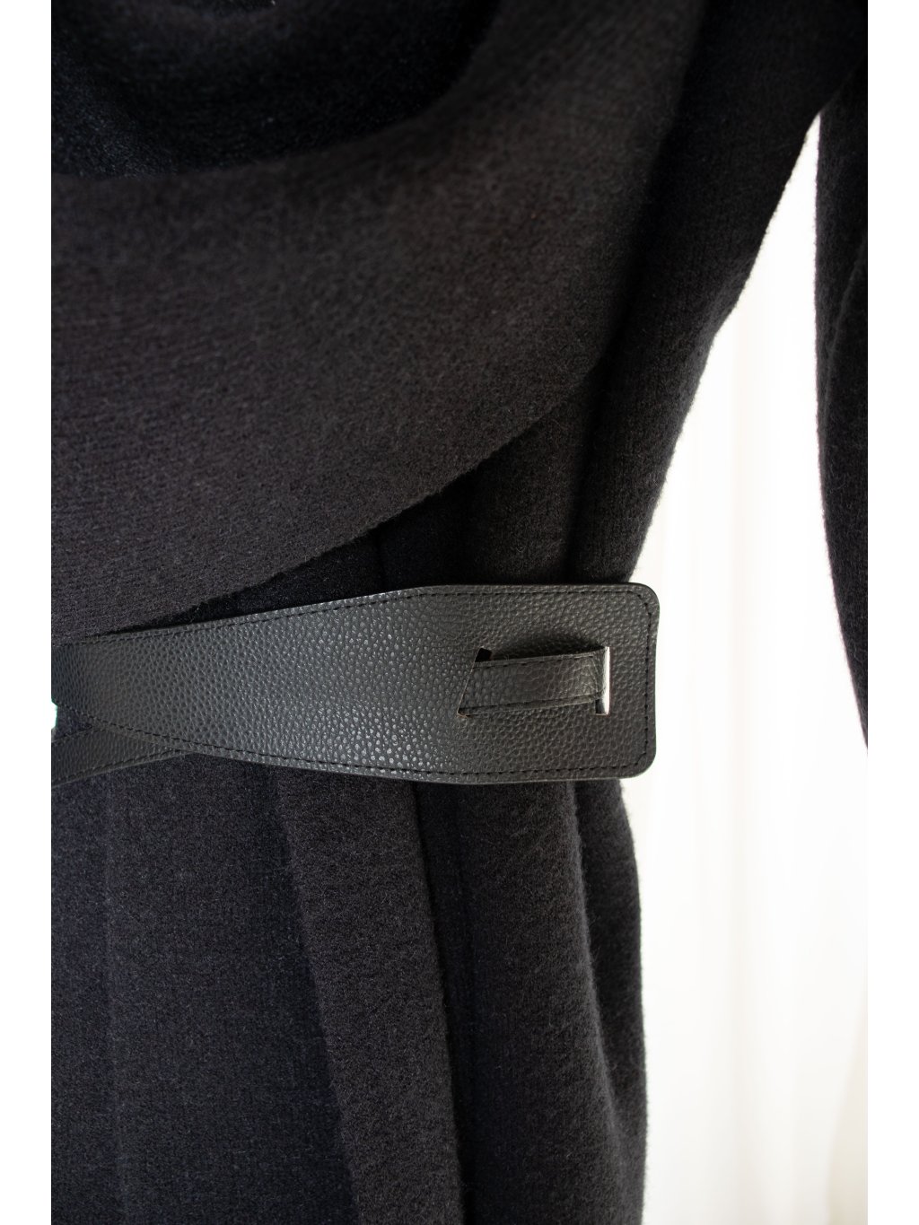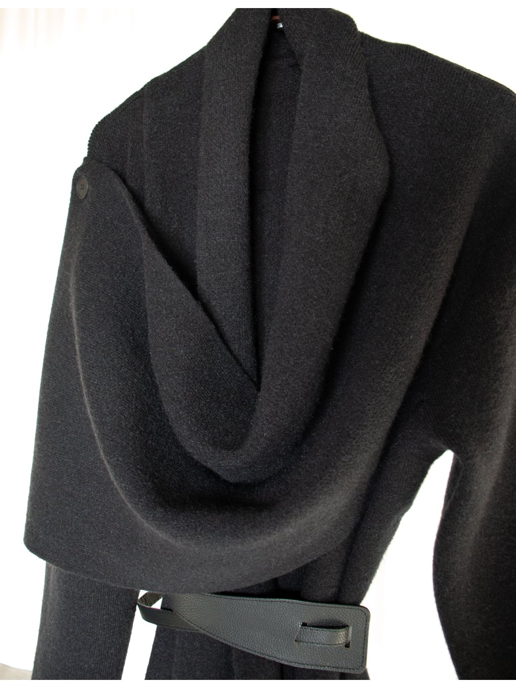 Hutný teplý cardigan se dvěma šálami, ze kterých lze vytvořit výrazný límec či pokrývku hlavy. Součástí je koženkový opasek.