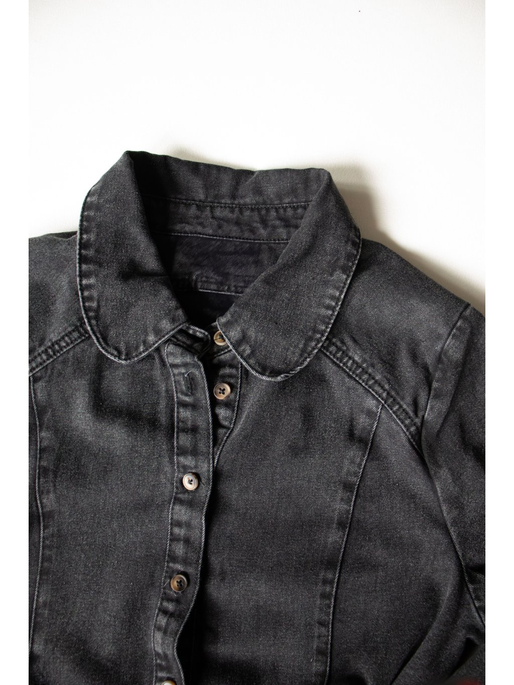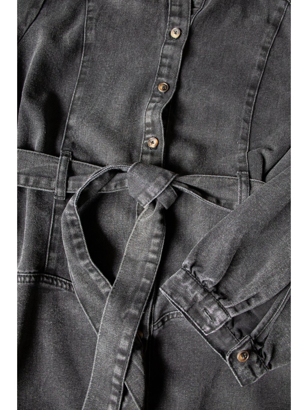 Denim šaty midi délky, celopropínací na knoflíčky, dlouhý rukáv s mírným řasením u manžety, límeček, v pase poutka, opasek, výraznější švy.