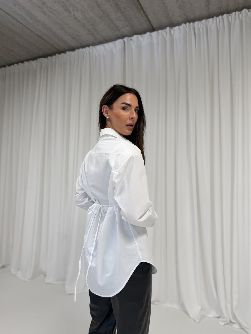 Bavlněná košile s ramenními vycpávkami, prodloužená délka - do půli stehen, límeček, celopropínací na knoflíčky v bílé barvě, dlouhé rukávy ukončené manžetou s knoflíkem, na bocích jsou šňůrky ze stejného materiálu jako košile, kterými lze košili v pase stáhnout.