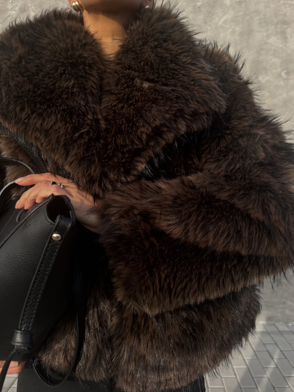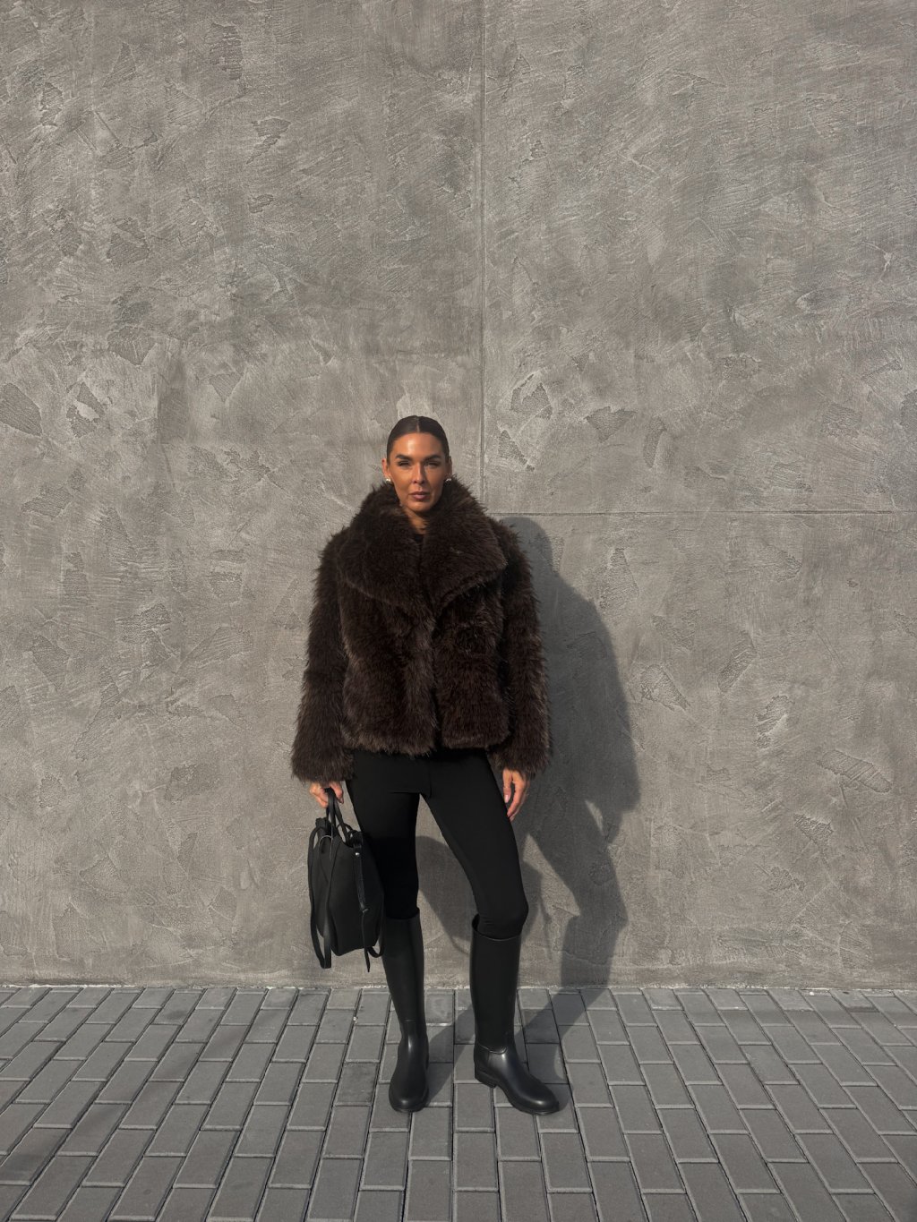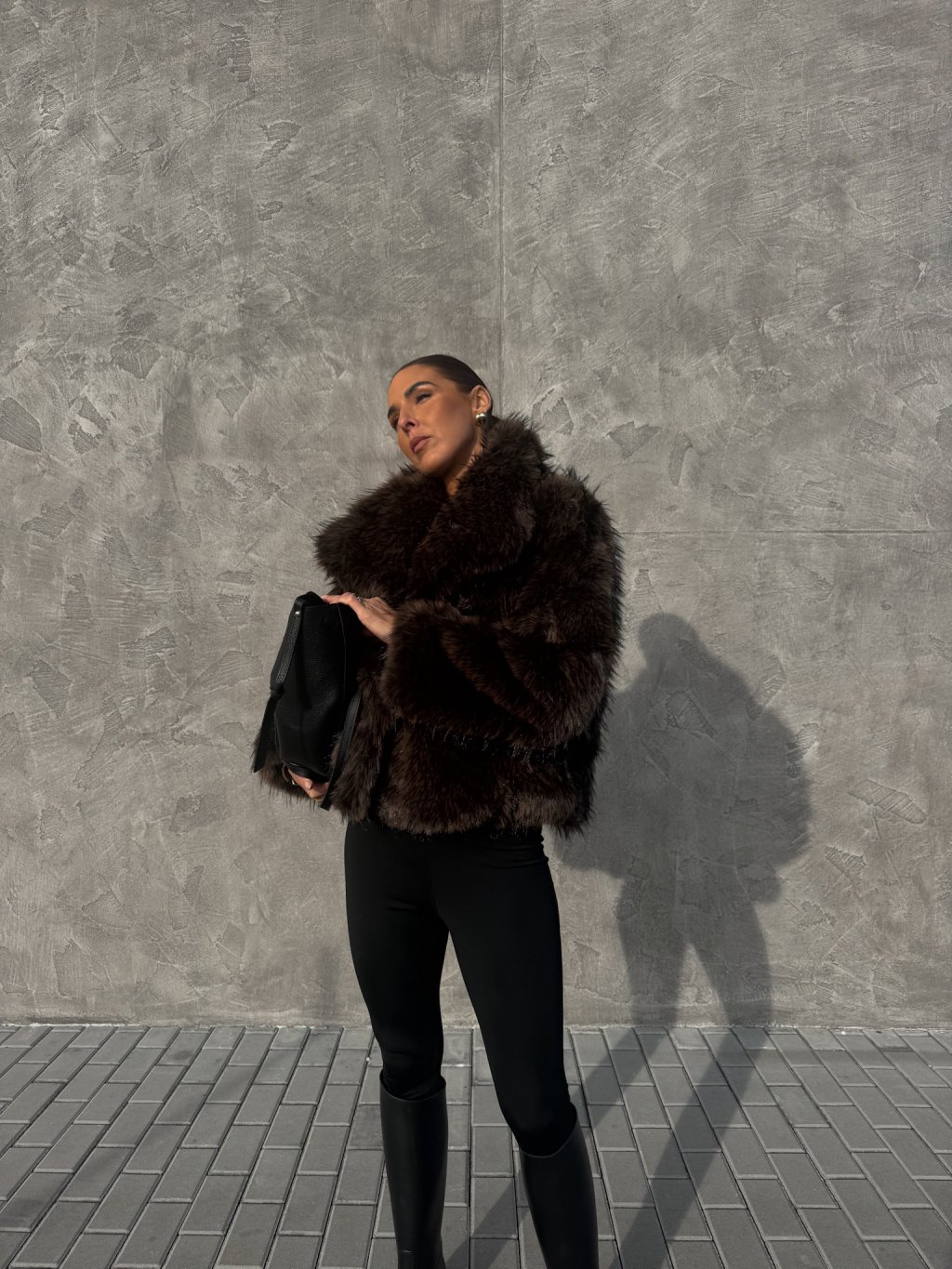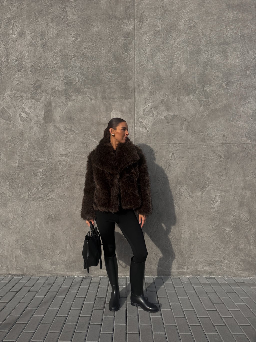 Melírovaný kožíšek, délka do pasu, vysoký límec, zapínání na cvoky, podšívka. Melírováno černou barvou.