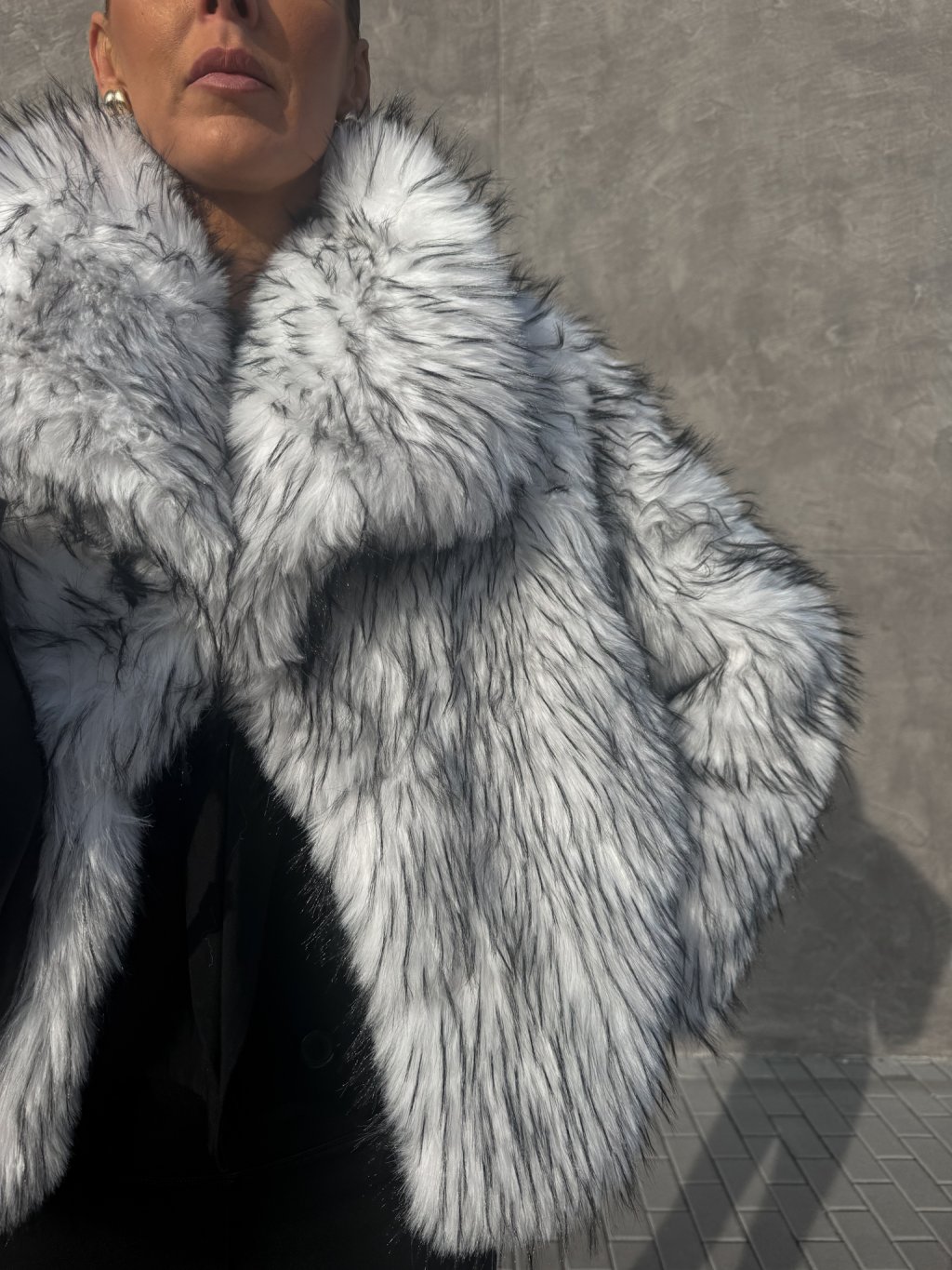 Melírovaný kožíšek, délka do pasu, vysoký límec, zapínání na cvoky, podšívka. Melírováno černou barvou.