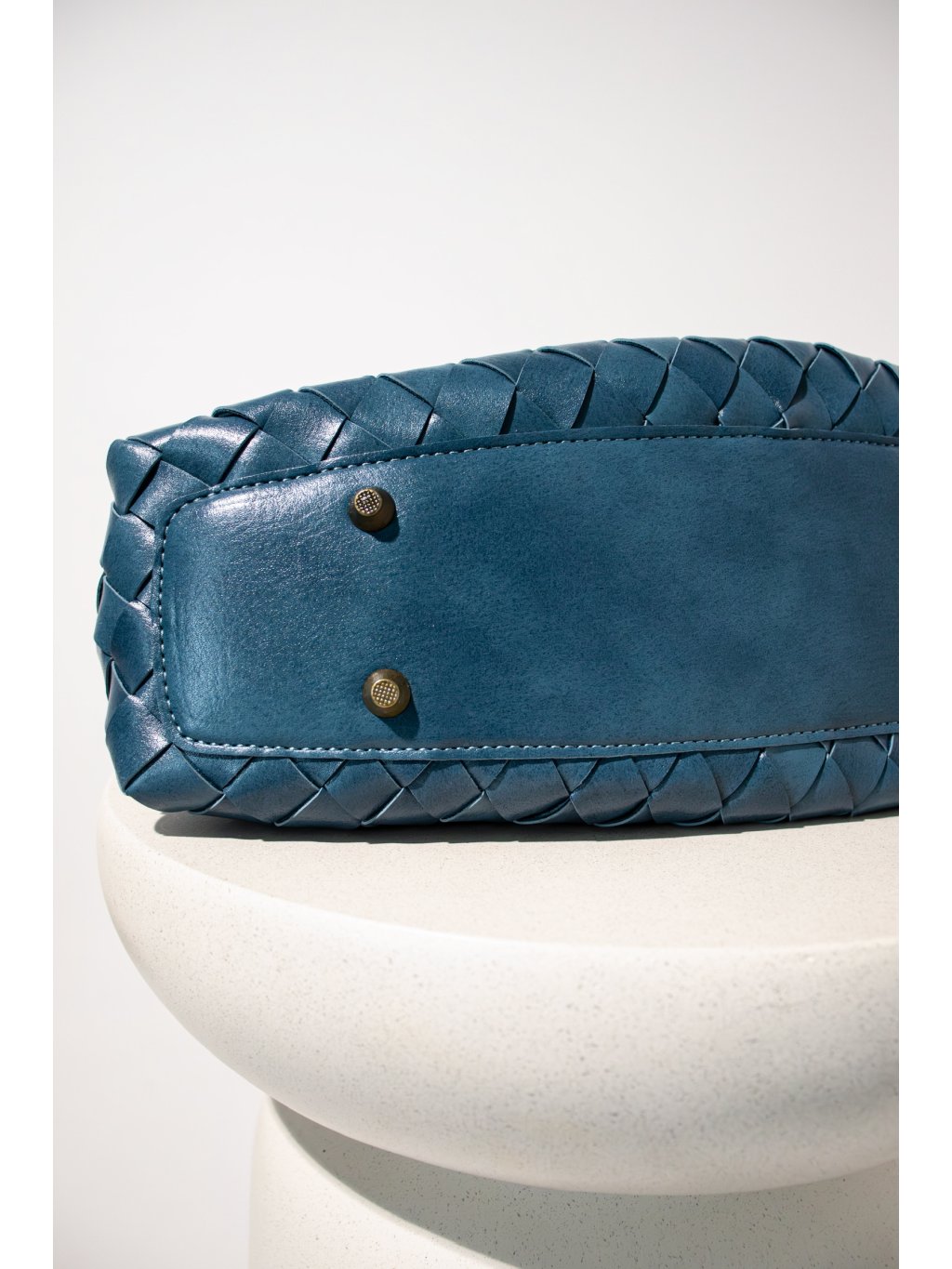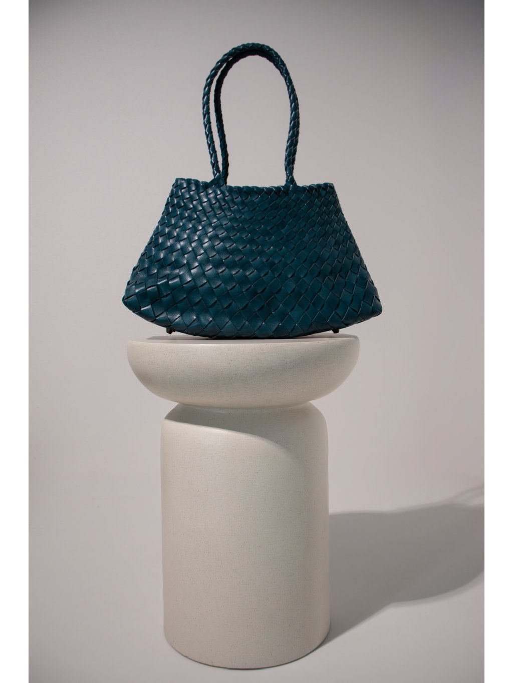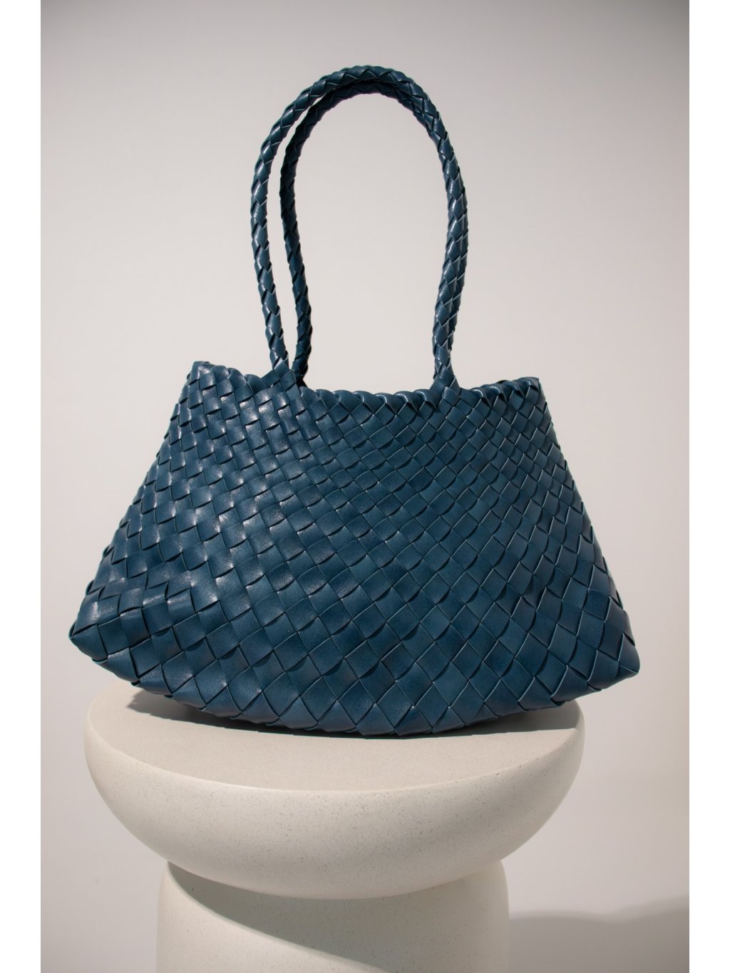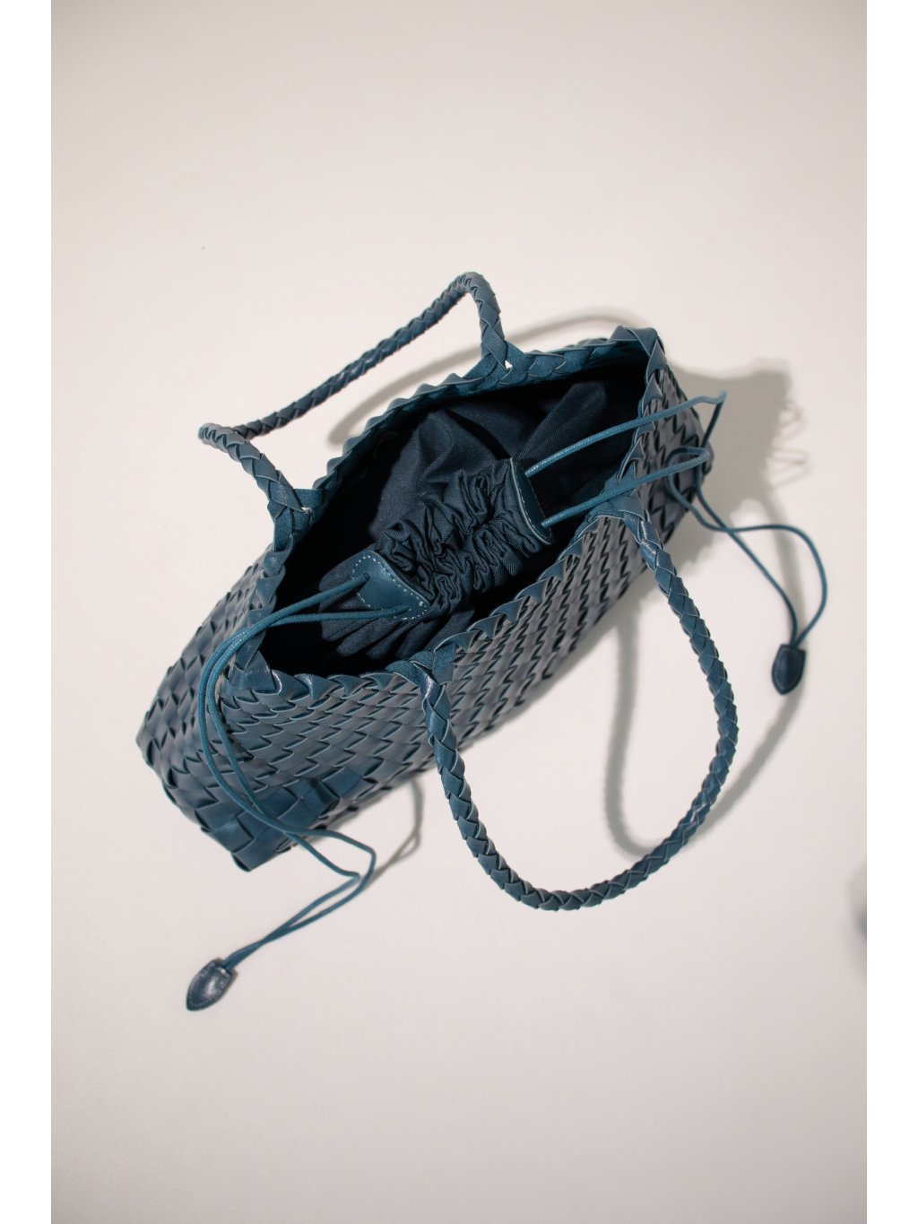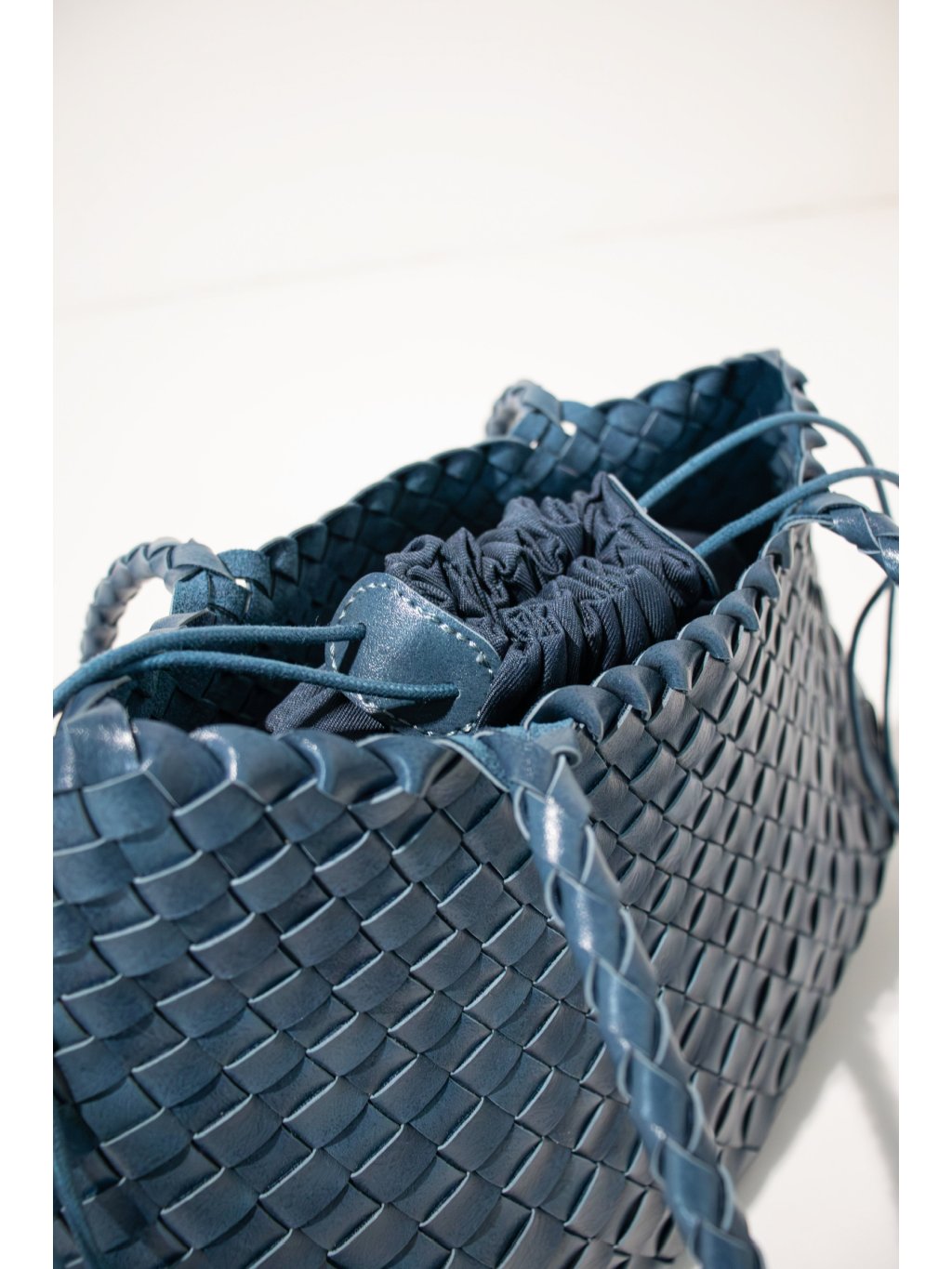 Proplétaná kabelka do ruky, střední velikost, dvě lanková ucha, pevné dno, uvnitř látkový vak na stažení s jednou kapsičkou na zip a dvěma otevřenými kapsičkami. Materiál je pevný, drží tvar.