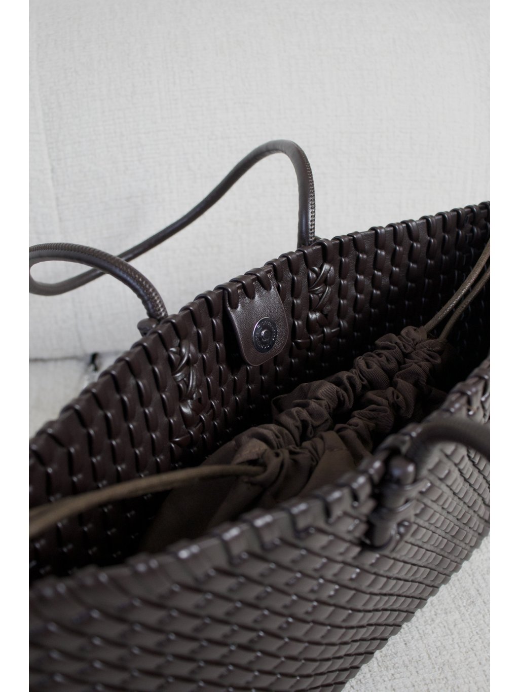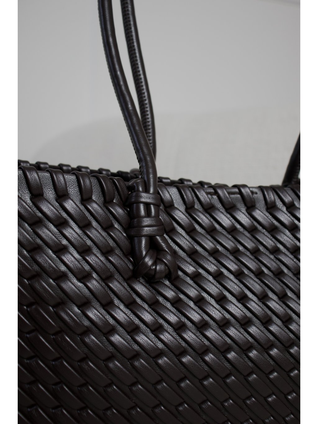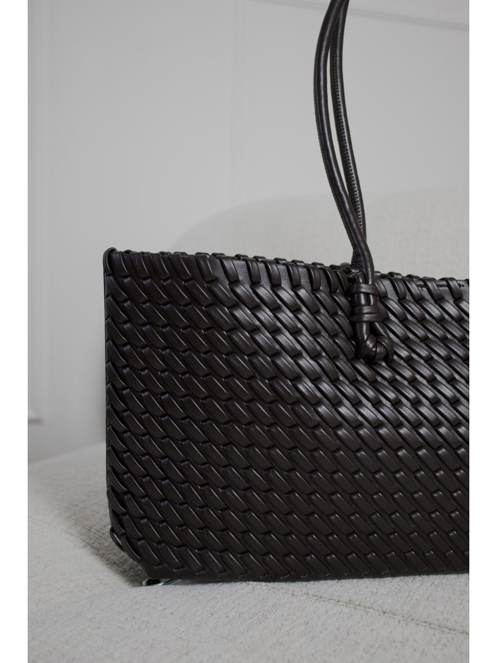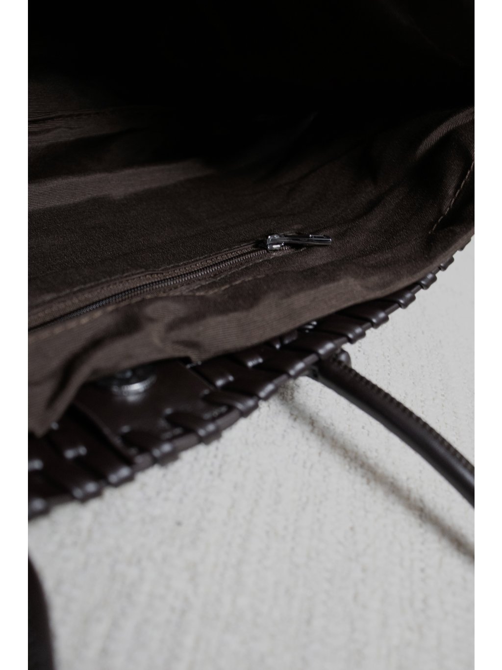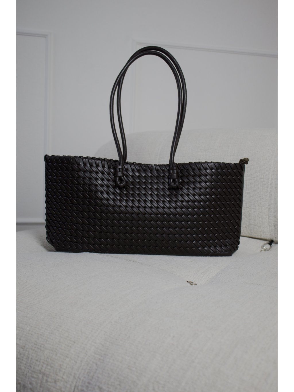 Úzká proplétaná kabelka, dvě lanková ucha, zapínání na magnet, pevnější dno, uvnitř jeden otevřený prostor s přišitým vakem na stažení. Vak/taštička o rozměrech 20x39 cm má jednu kapsičku na zip.