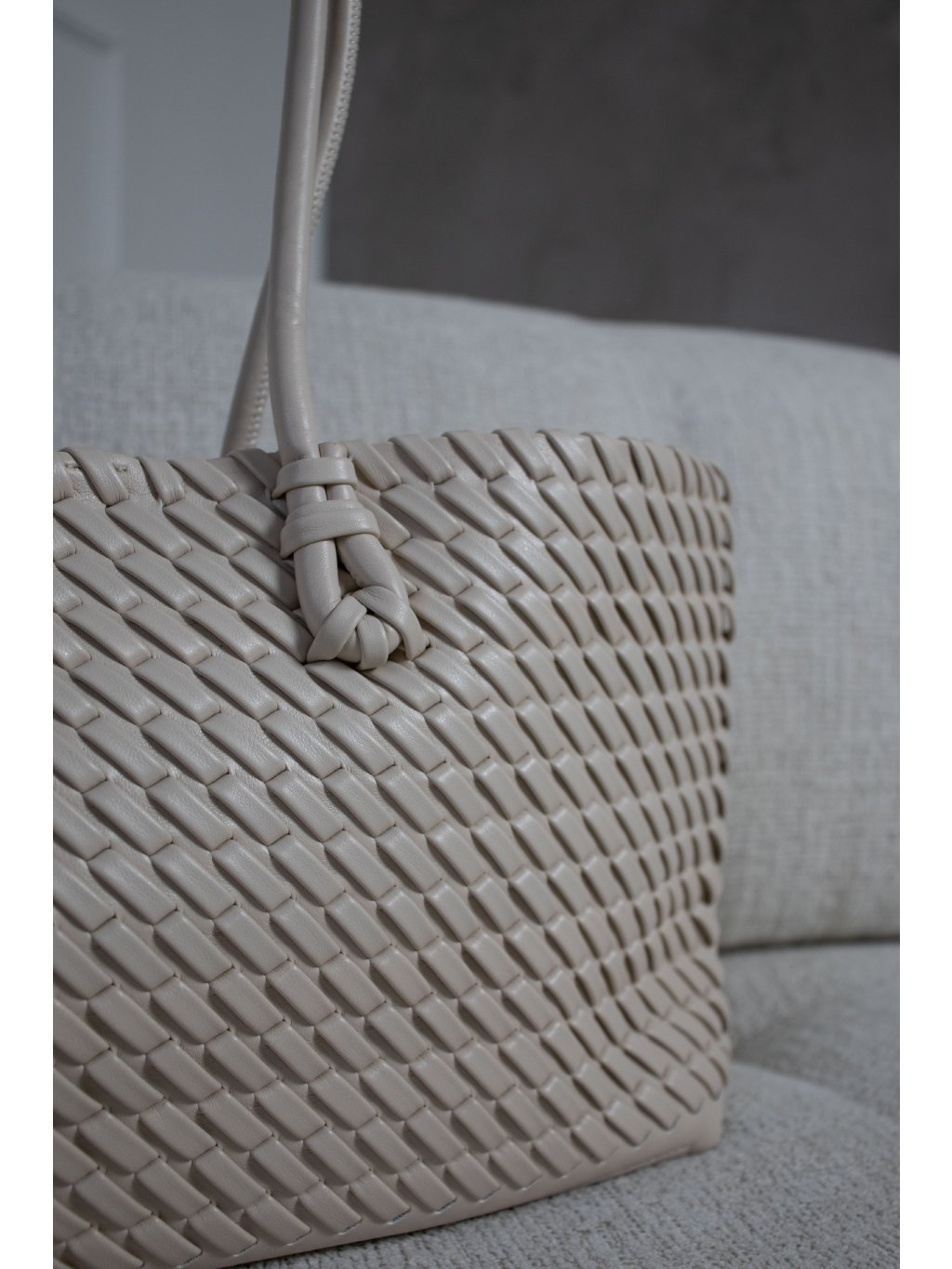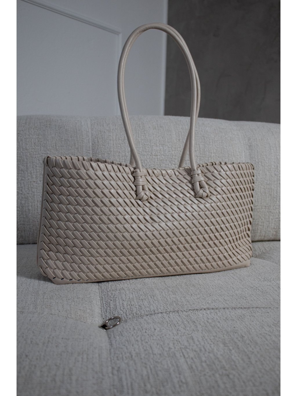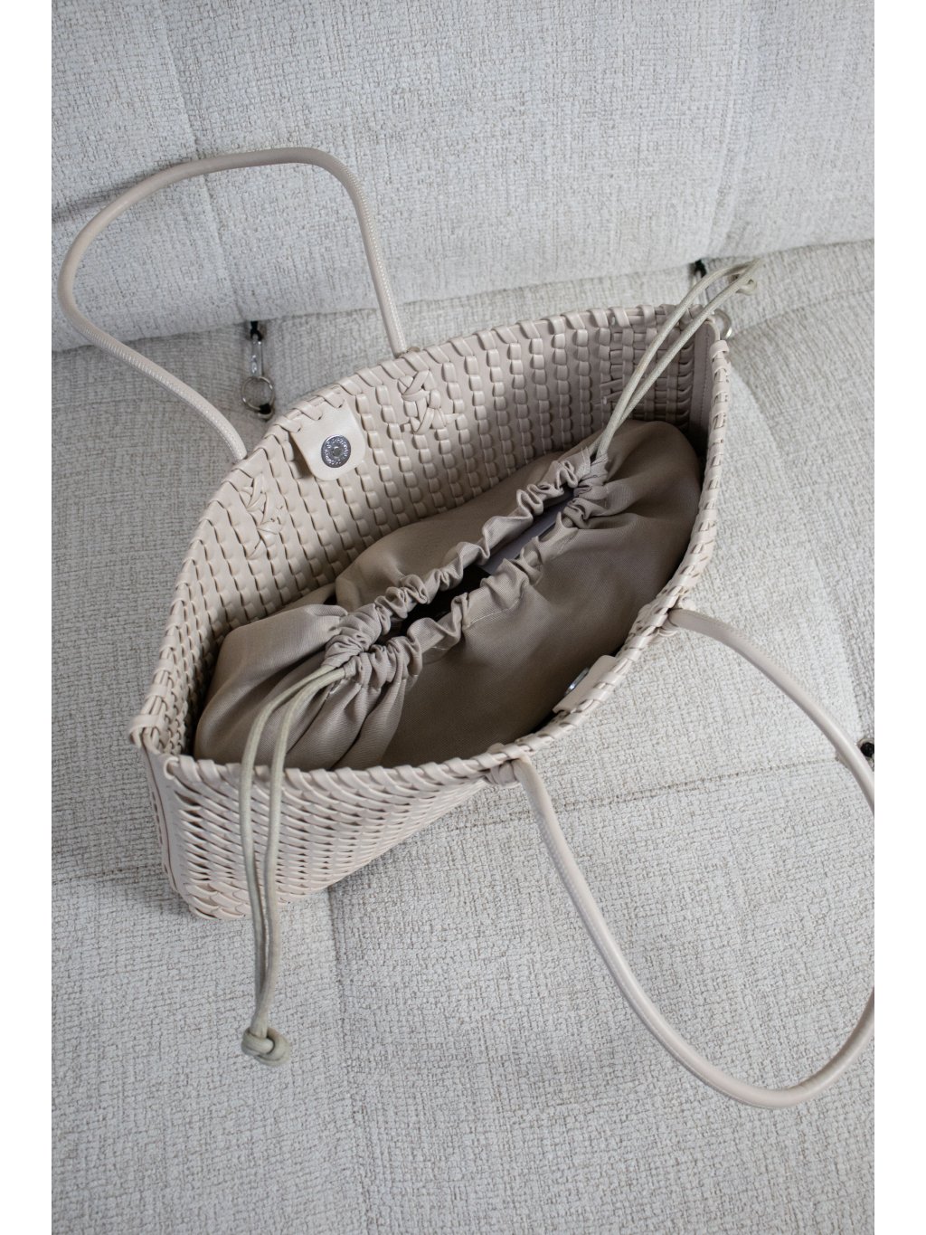 Úzká proplétaná kabelka, dvě lanková ucha, zapínání na magnet, pevnější dno, uvnitř jeden otevřený prostor s přišitým vakem na stažení. Vak/taštička o rozměrech 20x39 cm má jednu kapsičku na zip.
